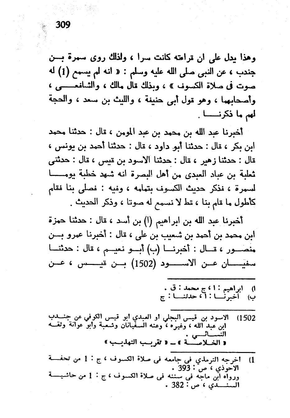 وَهَذَا يَدُلُّ عَلَى أَنَّ قِرَاءَتَهُ كَانَتْ سِرًّا وَلِذَلِكَ رَوَى سَمُرَةُ بْنُ جُنْدُبٍ عَنِ النَّبِيِّ صَلَّى اللَّهُ عَلَيْهِ وَسَلَّمَ أَنَّهُ لَمْ يَسْمَعْ له صوت فِي صَلَاةِ الْكُسُوفِ وَبِذَلِكَ قَالَ مَالِكٌ وَالشَّافِعِيُّ وَأَصْحَابُهُمَا وَهُوَ قَوْلُ أَبِي حَنِيفَةَ وَاللَّيْثِ بْنِ سَعْدٍ وَالْحَجَّةُ لَهُمْ مَا ذَكَرْنَا أَخْبَرَنَا عَبْدُ اللَّهِ بْنُ مُحَمَّدِ بْنِ عَبْدِ المؤمن قال حدثنا محمد ابن بَكْرٍ قَالَ حَدَّثَنَا أَبُو دَاوُدَ قَالَ حَدَّثَنَا أَحْمَدُ بْنُ يُونُسَ قَالَ حَدَّثَنَا زُهَيْرٌ قَالَ حَدَّثَنَا الْأَسْوَدُ بْنُ قَيْسٍ قَالَ حَدَّثَنِي ثَعْلَبَةُ بْنُ عَبَّادٍ الْعَبْدِيُّ مِنْ أَهْلِ الْبَصْرَةِ أَنَّهُ شَهِدَ خُطْبَةً يَوْمًا لِسَمُرَةَ فَذَكَرَ حَدِيثَ الْكُسُوفِ بِتَمَامِهِ وَفِيهِ فَصَلَّى بِنَا فَقَامَ كَأَطْوَلِ مَا قَامَ بِنَا قَطُّ لَا نَسْمَعُ لَهُ صَوْتًا وَذَكَرَ الْحَدِيثَ أَخْبَرَنَا عَبْدُ اللَّهِ بْنُ إِبْرَاهِيمَ بن أسد قال حدثنا حمزة ابن مُحَمَّدِ بْنِ أَحْمَدَ بْنِ شُعَيْبِ بْنِ عَلِيٍّ قَالَ أَخْبَرَنَا عَمْرُو بْنُ مَنْصُورٍ قَالَ أَخْبَرَنَا أَبُو نُعَيْمٍ قَالَ حَدَّثَنَا سُفْيَانُ عَنِ الْأَسْوَدِ بْنِ قَيْسٍ عَنْ