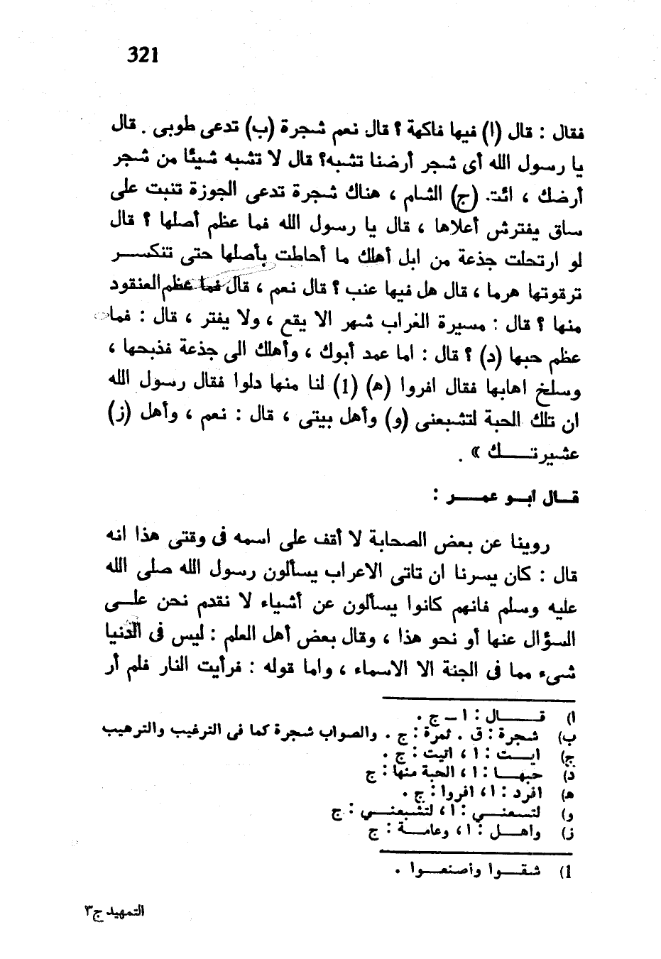 فَقَالَ فِيهَا فَاكِهَةٌ قَالَ نَعَمْ شَجَرَةٌ تُدْعَى طُوبَى قَالَ يَا رَسُولَ اللَّهِ أَيَّ شَجَرِ أَرْضِنَا تُشْبِهُ قَالَ لَا تُشْبِهُ شَيْئًا مِنْ شَجَرِ أَرْضِكَ ائْتِ الشَّامَ هُنَاكَ شَجَرَةٌ تُدْعَى الْجَوْزَةَ تَنْبُتُ عَلَى سَاقٍ يَفْتَرِشُ أَعْلَاهَا قَالَ يَا رَسُولَ اللَّهِ فَمَا عِظَمُ أَصْلِهَا قَالَ لَوِ ارْتَحَلَتْ جَذَعَةٌ مِنْ إِبِلِ أَهْلِكَ مَا أَحَاطَتْ بِأَصْلِهَا حَتَّى تَنْكَسِرَ تَرْقُوَتُهَا هَرَمًا قَالَ هَلْ فِيهَا عِنَبٌ قَالَ نَعَمْ قَالَ فَمَا عظم العنقود منها قال مسيرة الغراب شهر الا يَقَعُ وَلَا يَفْتُرُ قَالَ فَمَا عِظَمُ حَبِّهَا قَالَ أَمَا عَمَدَ أَبُوكَ وَأَهْلُكَ إِلَى جَذَعَةٍ فذبحها وسلخ أهابها فقال افروا (هـ) لَنَا مِنْهَا دَلْوًا فَقَالَ رَسُولُ اللَّهِ إِنَّ تلك الحبة لتشبعني وَأَهْلَ بَيْتِي قَالَ نَعَمْ وَأَهْلَ عَشِيرَتِكَ قَالَ أَبُو عُمَرَ رُوِّينَا عَنْ بَعْضِ الصَّحَابَةِ لَا أَقِفُ عَلَى اسْمِهِ فِي وَقْتِي هَذَا أَنَّهُ قَالَ كَانَ يَسُرُّنَا أَنْ تَأْتِيَ الْأَعْرَابُ يَسْأَلُونَ رَسُولَ اللَّهِ صَلَّى اللَّهُ عَلَيْهِ وَسَلَّمَ فَإِنَّهُمْ كَانُوا يَسْأَلُونَ عَنْ أَشْيَاءَ لَا نُقْدِمُ نَحْنُ عَلَى السُّؤَالِ عَنْهَا أَوْ نَحْوِ هَذَا وَقَالَ بَعْضُ أَهْلِ الْعِلْمِ لَيْسَ فِي الدُّنْيَا شَيْءٌ مِمَّا فِي الْجَنَّةِ إِلَّا الْأَسْمَاءُ وَأَمَّا قَوْلُهُ فَرَأَيْتُ النَّارَ فَلَمْ أَرَ