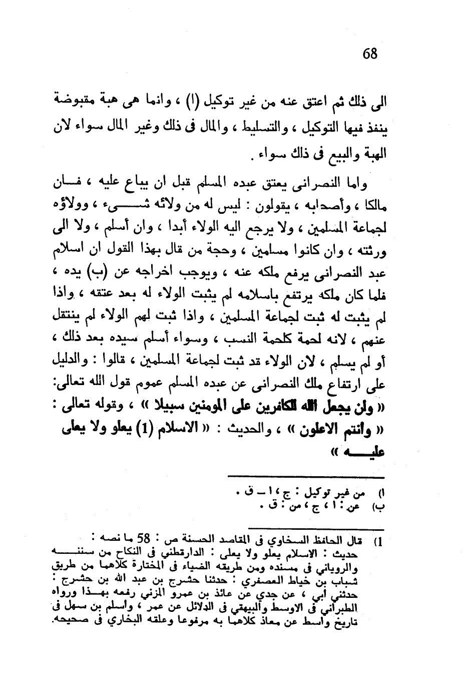 إِلَى ذَلِكَ ثُمَّ أَعْتَقَ عَنْهُ مِنْ غَيْرِ تَوْكِيلٍ وَإِنَّمَا هِيَ هِبَةٌ مَقْبُوضَةٌ يَنْفُذُ فِيهَا التَّوْكِيلُ وَالتَّسْلِيطُ وَالْمَالُ فِي ذَلِكَ وَغَيْرُ الْمَالِ سَوَاءٌ لِأَنَّ الْهِبَةَ وَالْبَيْعَ فِي ذَلِكَ سَوَاءٌ وَأَمَّا النَّصْرَانِيُّ يُعْتِقُ عَبْدَهُ الْمُسْلِمَ قَبْلَ أَنْ يُبَاعَ عَلَيْهِ فَإِنَّ مَالِكًا وَأَصْحَابَهُ يَقُولُونَ لَيْسَ لَهُ مِنْ وَلَائِهِ شَيْءٌ وَوَلَاؤُهُ لِجَمَاعَةِ الْمُسْلِمِينَ وَلَا يَرْجِعُ إِلَيْهِ الْوَلَاءُ أَبَدًا وَإِنْ أَسْلَمَ وَلَا إِلَى وَرَثَتِهِ وَإِنْ كَانُوا مُسْلِمِينَ وَحُجَّةُ مَنْ قَالَ بِهَذَا الْقَوْلِ أَنَّ إِسْلَامَ عَبْدِ النَّصْرَانِيِّ يَرْفَعُ مِلْكَهُ عَنْهُ وَيُوجِبُ إِخْرَاجَهُ عَنْ يَدِهِ فَلَمَّا كَانَ مِلْكُهُ يَرْتَفِعُ بِإِسْلَامِهِ لَمْ يَثْبُتِ الْوَلَاءُ لَهُ بَعْدَ عِتْقِهِ وَإِذَا لَمْ يَثْبُتْ لَهُ ثَبَتَ لِجَمَاعَةِ الْمُسْلِمِينَ وَإِذَا ثَبَتَ لَهُمُ الْوَلَاءُ لَمْ يَنْتَقِلْ عَنْهُمْ لِأَنَّهُ لُحْمَةٌ كَلُحْمَةِ النَّسَبِ وَسَوَاءٌ أَسْلَمَ سَيِّدُهُ بَعْدَ ذَلِكَ أَوْ لَمْ يُسْلِمْ لِأَنَّ الْوَلَاءَ قَدْ ثَبَتَ لِجَمَاعَةِ الْمُسْلِمِينَ قَالُوا وَالدَّلِيلُ عَلَى ارْتِفَاعِ مِلْكِ النَّصْرَانِيِّ عَنْ عَبْدِهِ الْمُسْلِمِ عُمُومُ قَوْلِ اللَّهِ تَعَالَى وَلَنْ يَجْعَلَ اللَّهُ لِلْكَافِرِينَ عَلَى الْمُؤْمِنِينَ سَبِيلًا وَقَوْلِهِ تَعَالَى وَأَنْتُمُ الْأَعْلَوْنَ وَالْحَدِيثِ الْإِسْلَامُ يَعْلُو وَلَا يُعْلَى عَلَيْهِ
