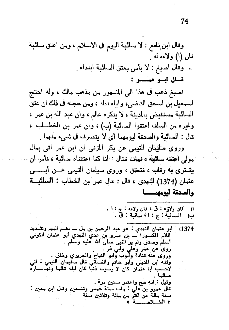 وَقَالَ ابْنُ نَافِعٍ لَا سَائِبَةَ الْيَوْمَ فِي الْإِسْلَامِ وَمَنْ أَعْتَقَ سَائِبَةً فَإِنَّ وَلَاءَهُ لَهُ وَقَالَ أَصْبَغُ لَا بَأْسَ بِعِتْقِ السَّائِبَةِ ابْتِدَاءً قَالَ أَبُو عُمَرَ أَصْبَغُ ذَهَبَ فِي هَذَا إِلَى الْمَشْهُورِ مِنْ مَذْهَبِ مَالِكٍ وَلَهُ احْتَجَّ اسمعيل بن اسحق الْقَاضِي وَإِيَّاهُ تَقَلَّدَ وَمِنْ حُجَّتِهِ فِي ذَلِكَ أَنَّ عِتْقَ السَّائِبَةِ مُسْتَفِيضٌ بِالْمَدِينَةِ لَا يُنْكِرُهُ عَالِمٌ وَأَنَّ عَبْدَ اللَّهِ بْنَ عُمَرَ وَغَيْرَهُ مِنَ السَّلَفِ أَعْتَقُوا السَّائِبَةَ وَأَنَّ عُمَرَ بْنَ الْخَطَّابِ قَالَ السَّائِبَةُ وَالصَّدَقَةُ لِيَوْمِهِمَا أَيْ لَا يُتَصَرَّفُ فِي شَيْءٍ مِنْهُمَا وَرَوَى سُلَيْمَانُ التَّيْمِيُّ عَنْ بَكْرٍ الْمُزَنِيِّ أَنَّ ابْنَ عُمَرَ أُتِيَ بِمَالِ مَوْلًى أَعْتَقَهُ سَائِبَةً فَمَاتَ فَقَالَ إِنَّا كُنَّا أَعْتَقْنَاهُ سَائِبَةً فَأَمَرَ أَنْ يُشْتَرَى بِهِ رِقَابٌ فَتُعْتَقَ وَرَوَى سُلَيْمَانُ التَّيْمِيُّ عَنْ أَبِي عُثْمَانَ النَّهْدِيِّ قَالَ قَالَ عُمَرُ بْنُ الْخَطَّابِ السَّائِبَةُ وَالصَّدَقَةُ لِيَوْمِهِمَا
