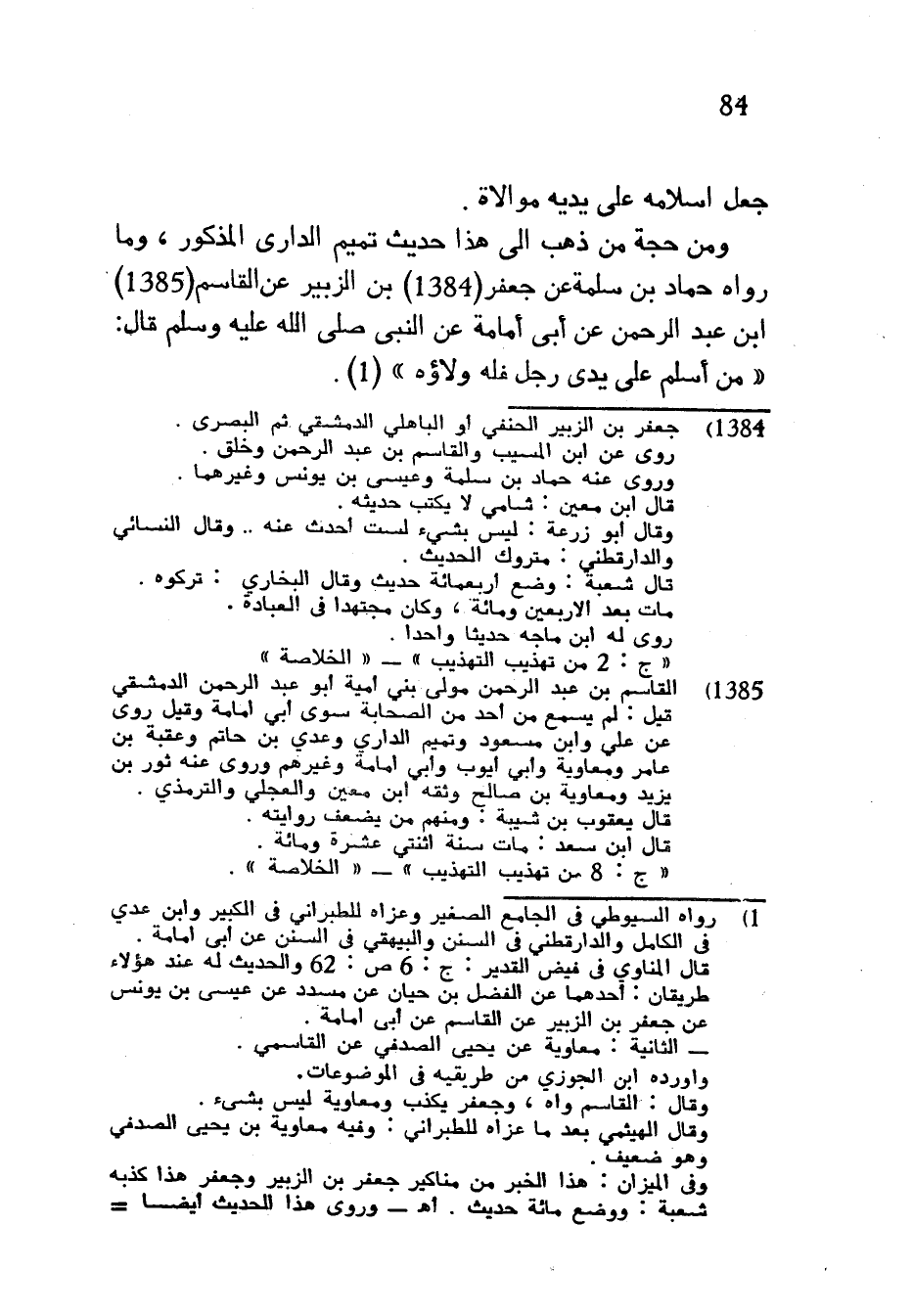 جَعَلَ إِسْلَامَهُ عَلَى يَدَيْهِ مُوَالَاةً وَمِنْ حُجَّةِ مَنْ ذَهَبَ إِلَى هَذَا حَدِيثُ تَمِيمٍ الدَّارِيِّ الْمَذْكُورُ وَمَا رَوَاهُ حَمَّادُ بْنُ سَلَمَةَ عَنْ جعفر بن الزبير عن القاسم ابن عَبْدِ الرَّحْمَنِ عَنْ أَبِي أُمَامَةَ عَنِ النَّبِيِّ صَلَّى اللَّهُ عَلَيْهِ وَسَلَّمَ قَالَ مَنْ أَسْلَمَ عَلَى يَدَيْ رَجُلٍ فَلَهُ وَلَاؤُهُ