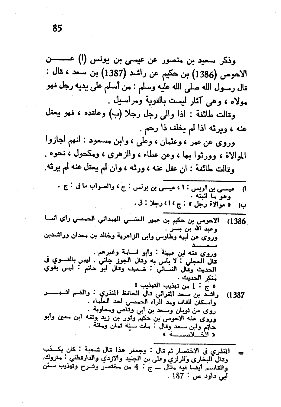 وَذَكَرَ سَعِيدُ بْنُ مَنْصُورٍ عَنْ عِيسَى بْنِ يُونُسَ عَنِ الْأَحْوَصِ بْنِ حَكِيمٍ عَنْ رَاشِدِ بْنِ سَعْدٍ قَالَ قَالَ رَسُولُ اللَّهِ صَلَّى اللَّهُ عَلَيْهِ وَسَلَّمَ مَنْ أَسْلَمَ عَلَى يَدَيْهِ رَجُلٌ فَهُوَ مَوْلَاهُ وَهِيَ آثَارٌ لَيْسَتْ بِالْقَوِيَّةِ وَمَرَاسِيلُ وَقَالَتْ طَائِفَةٌ إِذَا وَالَى رَجُلٌ رَجُلًا وَعَاقَدَهُ فَهُوَ يَعْقِلُ عَنْهُ وَيَرِثُهُ إِذَا لَمْ يُخْلِفْ ذَا رَحِمٍ وَرُوِيَ عَنْ عُمَرَ وَعُثْمَانَ وَعَلِيٍّ وَابْنِ مَسْعُودٍ أَنَّهُمْ أَجَازُوا الْمُوَالَاةَ وَوَرَّثُوا بِهَا وَعَنْ عَطَاءٍ وَالزُّهْرِيِّ وَمَكْحُولٍ نَحْوَهُ وَقَالَتْ طَائِفَةٌ إِنْ عَقَلَ عَنْهُ وَرِثَهُ وَإِنْ لَمْ يَعْقِلْ عَنْهُ لَمْ يَرِثْهُ