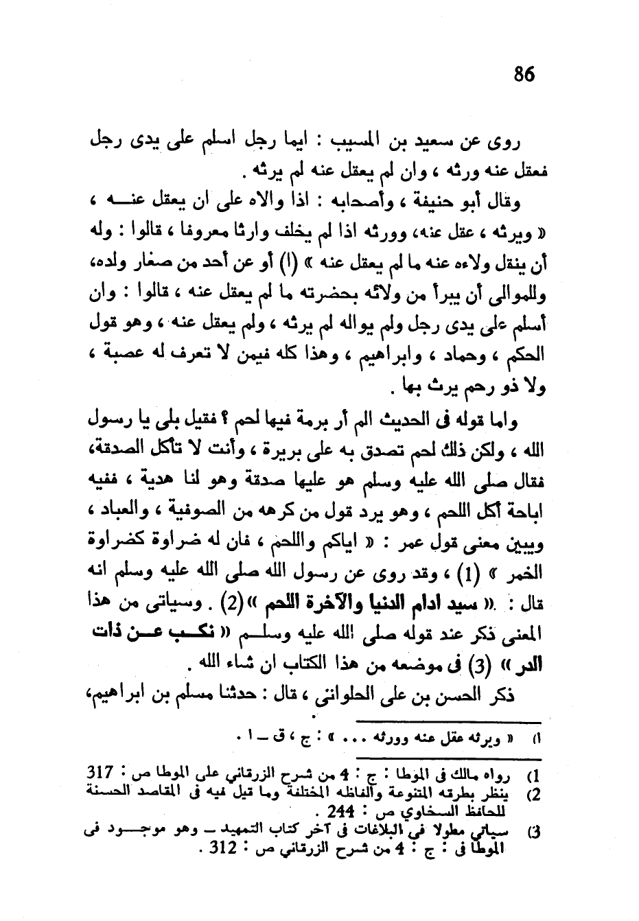 رُوِيَ عَنْ سَعِيدِ بْنِ الْمُسَيَّبِ أَيُّمَا رَجُلٍ أَسْلَمَ عَلَى يَدَيْ رَجُلٍ فَعَقَلَ عَنْهُ وَرِثَهُ وَإِنْ لَمْ يَعْقِلْ عَنْهُ لَمْ يَرِثْهُ وَقَالَ أَبُو حَنِيفَةَ وَأَصْحَابُهُ إِذَا وَالَاهُ عَلَى أَنْ يَعْقِلَ عَنْهُ وَيَرِثَهُ عَقَلَ عَنْهُ وَوَرِثَهُ إِذَا لَمْ يُخْلِفْ وَارِثًا مَعْرُوفًا قَالُوا وَلَهُ أَنْ يَنْقُلَ وَلَاءَهُ عَنْهُ مَا لَمْ يَعْقِلْ عَنْهُ أو عن أحد من صغار وَلَدِهِ وَلِلْمُوَالِي أَنْ يَبْرَأَ مِنْ وَلَائِهِ بِحَضْرَتِهِ مَا لَمْ يَعْقِلْ عَنْهُ قَالُوا وَإِنْ أَسْلَمَ عَلَى يَدَيْ رَجُلٍ وَلَمْ يُوَالِهِ لَمْ يَرِثْهُ وَلَمْ يَعْقِلْ عَنْهُ وَهُوَ قَوْلُ الْحَكَمِ وَحَمَّادٍ وَإِبْرَاهِيمَ وَهَذَا كُلُّهُ فِيمَنْ لَا تُعْرَفُ لَهُ عَصَبَةٌ وَلَا ذُو رَحِمٍ يَرِثُ بِهَا وَأَمَّا قَوْلُهُ فِي الْحَدِيثِ أَلَمْ أَرَ بُرْمَةً فِيهَا لَحْمٌ فَقِيلَ بَلَى يَا رَسُولَ اللَّهِ وَلَكِنْ ذَلِكَ لَحْمٌ تُصُدِّقَ بِهِ عَلَى بَرِيرَةَ وَأَنْتَ لَا تَأْكُلُ الصَّدَقَةَ فَقَالَ صَلَّى اللَّهُ عَلَيْهِ وَسَلَّمَ هُوَ عَلَيْهَا صَدَقَةٌ وَهُوَ لَنَا هَدِيَّةٌ فَفِيهِ إِبَاحَةُ أَكْلِ اللَّحْمِ وَهُوَ يَرُدُّ قَوْلَ مَنْ كَرِهَهُ مِنَ الصُّوفِيَّةِ وَالْعُبَّادِ وَيُبَيِّنُ مَعْنَى قَوْلِ عُمَرَ إِيَّاكُمْ وَاللَّحْمَ فَإِنَّ لَهُ ضَرَاوَةً كَضَرَاوَةِ الْخَمْرِ وَقَدْ رُوِيَ عَنْ رَسُولِ اللَّهِ صَلَّى اللَّهُ عَلَيْهِ وَسَلَّمَ أَنَّهُ قَالَ سَيِّدُ إِدَامِ الدُّنْيَا وَالْآخِرَةِ اللَّحْمُ وَسَيَأْتِي مِنْ هَذَا الْمَعْنَى ذِكْرٌ عِنْدَ قَوْلِهِ صَلَّى اللَّهُ عَلَيْهِ وَسَلَّمَ نَكِّبْ عَنْ ذَاتِ الدَّرِّ فِي مَوْضِعِهِ مِنْ هَذَا الْكِتَابِ إِنْ شَاءَ اللَّهُ ذَكَرَ الْحَسَنُ بْنُ عَلِيٍّ الْحَلْوَانِيُّ قَالَ حَدَّثَنَا مُسْلِمُ بْنُ إِبْرَاهِيمَ