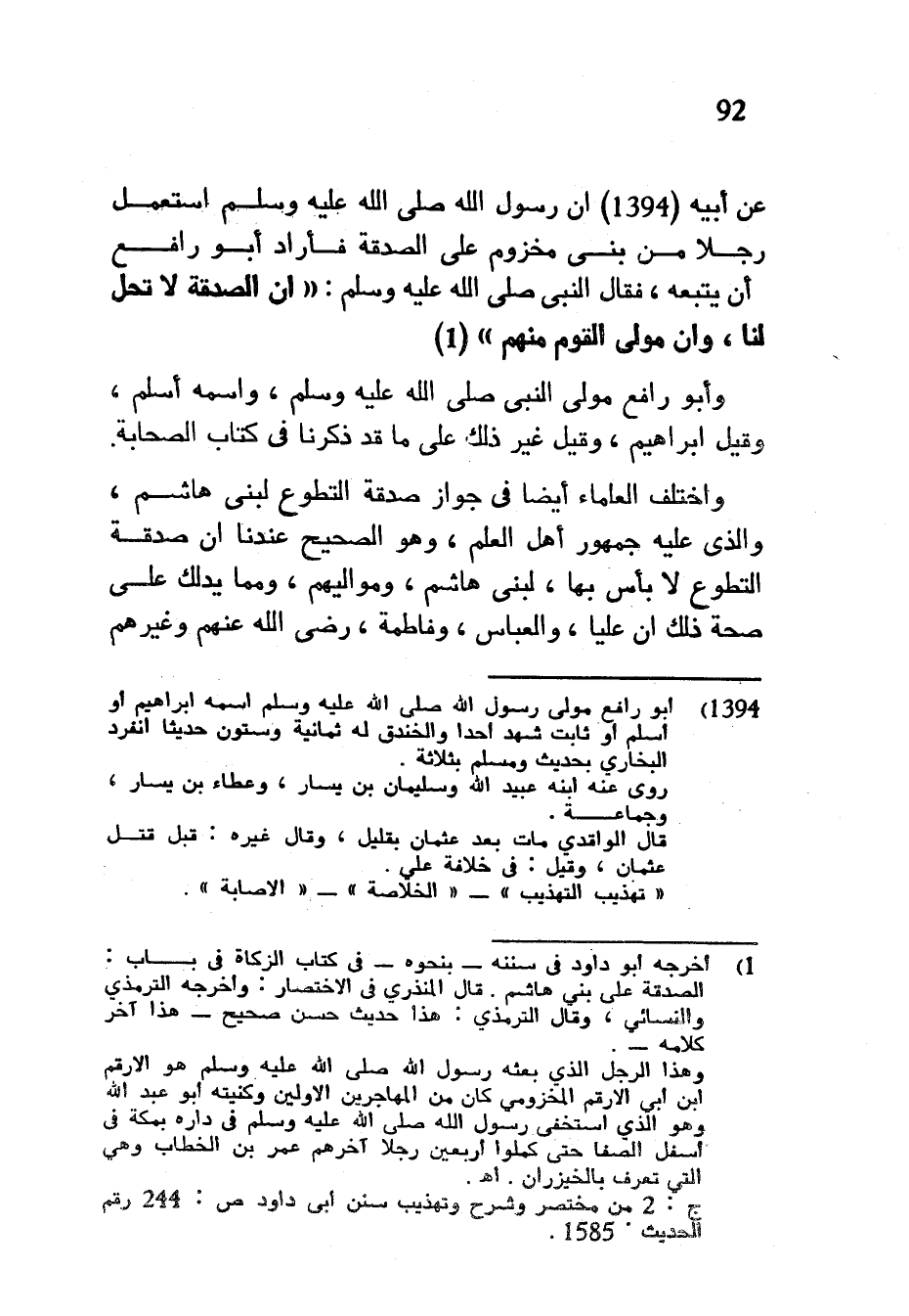 عَنْ أَبِيهِ أَنَّ رَسُولَ اللَّهِ صَلَّى اللَّهُ عَلَيْهِ وَسَلَّمَ اسْتَعْمَلَ رَجُلًا مِنْ بَنِي مَخْزُومٍ عَلَى الصَّدَقَةِ فَأَرَادَ أَبُو رَافِعٍ أَنْ يَتْبَعَهُ فَقَالَ النَّبِيُّ صَلَّى اللَّهُ عَلَيْهِ وَسَلَّمَ إِنَّ الصَّدَقَةَ لَا تَحِلُّ لَنَا وَإِنَّ مَوْلَى الْقَوْمِ مِنْهُمْ وَأَبُو رَافِعٍ مَوْلَى النَّبِيِّ صَلَّى اللَّهُ عَلَيْهِ وَسَلَّمَ وَاسْمُهُ أَسْلَمُ وَقِيلَ إِبْرَاهِيمُ وقيل غر ذَلِكَ عَلَى مَا قَدْ ذَكَرْنَا فِي كِتَابِ الصَّحَابَةِ وَاخْتَلَفَ الْعُلَمَاءُ أَيْضًا فِي جَوَازِ صَدَقَةِ التَّطَوُّعِ لِبَنِي هَاشِمٍ وَالَّذِي عَلَيْهِ جُمْهُورُ أَهْلِ الْعِلْمِ وَهُوَ الصَّحِيحُ عِنْدَنَا أَنَّ صَدَقَةَ التَّطَوُّعِ لَا بَأْسَ بِهَا لِبَنِي هَاشِمٍ وَمَوَالِيهِمْ وَمِمَّا يَدُلُّكَ عَلَى صِحَّةِ ذَلِكَ أَنَّ عَلِيًّا وَالْعَبَّاسَ وَفَاطِمَةَ رَضِيَ اللَّهُ عَنْهُمْ وَغَيْرَهُمْ