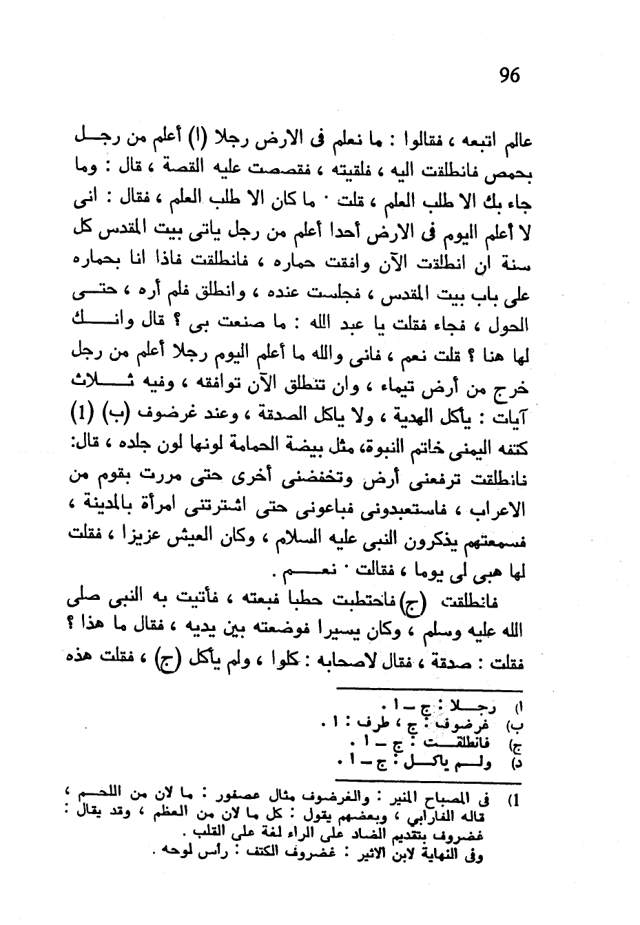 عالم ابتعه فَقَالُوا مَا نَعْلَمُ فِي الْأَرْضِ رَجُلًا أَعْلَمَ من رجل بحمص فانطلقلت إِلَيْهِ فَلَقِيتُهُ فَقَصَصْتُ عَلَيْهِ الْقِصَّةَ قَالَ وَمَا جَاءَ بِكَ إِلَّا طَلَبُ الْعِلْمِ قُلْتُ مَا كَانَ إِلَّا طَلَبُ الْعِلْمِ فَقَالَ إِنِّي لَا أَعْلَمُ الْيَوْمَ فِي الْأَرْضِ أَحَدًا أَعْلَمَ مِنْ رَجُلٍ يَأْتِي بَيْتَ الْمَقْدِسِ كُلَّ سَنَةٍ إِنِ انْطَلَقْتَ الْآنَ وَافَقْتَ حِمَارَهُ فَانْطَلَقْتُ فَإِذَا أَنَا بِحِمَارِهِ عَلَى بَابِ بَيْتِ الْمَقْدِسِ فَجَلَسْتُ عِنْدَهُ وَانْطَلَقَ فَلَمْ أَرَهُ حَتَّى الْحَوْلِ فَجَاءَ فَقُلْتُ يَا عَبْدَ اللَّهِ مَا صَنَعْتَ بِي قَالَ وأنك لها هنا قُلْتُ نَعَمْ فَإِنِّي وَاللَّهِ مَا أَعْلَمُ الْيَوْمَ رَجُلًا أَعْلَمَ مِنْ رَجُلٍ خَرَجَ مِنْ أَرْضِ تَيْمَاءَ وَإِنْ تَنْطَلِقِ الْآنَ تُوَافِقْهُ وَفِيهِ ثَلَاثُ آيَاتٍ يَأْكُلُ الْهَدِيَّةَ وَلَا يَأْكُلُ الصَّدَقَةَ وَعِنْدَ غُرْضُوفِ كَتِفِهِ الْيُمْنَى خَاتَمُ النُّبُوَّةِ مِثْلُ بَيْضَةِ الْحَمَامَةِ لَوْنُهَا لَوْنُ جِلْدِهِ قَالَ فَانْطَلَقْتُ تَرْفَعُنِي أَرْضٌ وَتَخْفِضُنِي أُخْرَى حَتَّى مَرَرْتُ بِقَوْمٍ مِنَ الْأَعْرَابِ فَاسْتَعْبَدُونِي فَبَاعُونِي حَتَّى اشْتَرَتْنِي امْرَأَةٌ بِالْمَدِينَةِ فَسَمِعْتُهُمْ يَذْكُرُونَ النَّبِيَّ عَلَيْهِ السَّلَامُ وَكَانَ الْعَيْشُ عَزِيزًا فَقُلْتُ لَهَا هَبِي لِي يَوْمًا فَقَالَتْ نَعَمْ فَانْطَلَقْتُ فَاحْتَطَبْتُ حَطَبًا فَبِعْتُهُ فَأَتَيْتُ بِهِ النَّبِيَّ صَلَّى اللَّهُ عَلَيْهِ وَسَلَّمَ وَكَانَ يَسِيرًا فَوَضَعْتُهُ بَيْنَ يَدَيْهِ فَقَالَ مَا هَذَا فَقُلْتُ صَدَقَةٌ فَقَالَ لِأَصْحَابِهِ كُلُوا وَلَمْ يَأْكُلْ فَقُلْتُ هذه