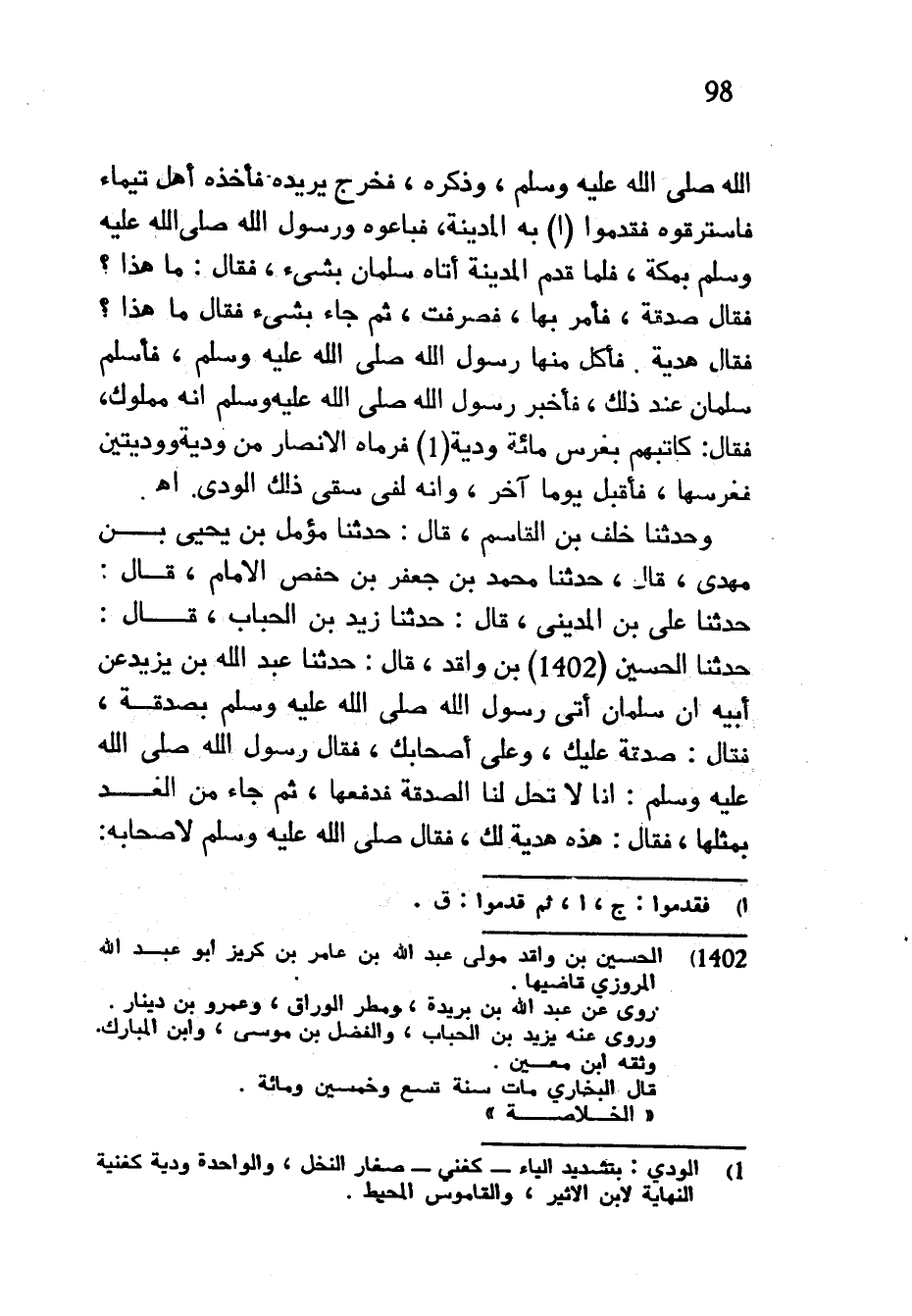 اللَّهِ صَلَّى اللَّهُ عَلَيْهِ وَسَلَّمَ وَذِكْرِهِ فَخَرَجَ يُرِيدُهُ فَأَخَذَهُ أَهْلُ تَيْمَاءَ فَاسْتَرَقُّوهُ فَقَدِمُوا بِهِ الْمَدِينَةَ فَبَاعُوهُ وَرَسُولُ اللَّهِ صَلَّى اللَّهُ عَلَيْهِ وَسَلَّمَ بِمَكَّةَ فَلَمَّا قَدِمَ الْمَدِينَةَ أَتَاهُ سَلْمَانُ بِشَيْءٍ فَقَالَ مَا هَذَا فَقَالَ صَدَقَةٌ فَأَمَرَ بِهَا فَصُرِفَتْ ثُمَّ جَاءَ بِشَيْءٍ فَقَالَ مَا هَذَا فَقَالَ هَدِيَّةٌ فَأَكَلَ مِنْهَا رَسُولُ اللَّهِ صَلَّى اللَّهُ عَلَيْهِ وَسَلَّمَ فَأَسْلَمَ سَلْمَانُ عِنْدَ ذَلِكَ فَأَخْبَرَ رَسُولَ اللَّهِ صَلَّى اللَّهُ عَلَيْهِ وَسَلَّمَ أَنَّهُ مَمْلُوكٌ فَقَالَ كَاتِبْهُمْ بِغَرْسِ مِائَةِ وَدِيَّةٍ فَرَمَاهُ الْأَنْصَارُ مِنْ وَدِيَّةٍ وَوَدِيَّتَيْنِ فَغَرَسَهَا فَأَقْبَلَ يَوْمًا آخَرَ وَإِنَّهُ لَفِي سَقْيِ ذَلِكَ الودي أو وَحَدَّثَنَا خَلَفُ بْنُ الْقَاسِمِ قَالَ حَدَّثَنَا مُؤَمَّلُ بْنُ يَحْيَى بْنِ مَهْدِيٍّ قَالَ حَدَّثَنَا مُحَمَّدُ بْنُ جَعْفَرِ بْنِ حَفْصٍ الْإِمَامُ قَالَ حَدَّثَنَا عَلِيُّ بْنُ الْمَدِينِيِّ قَالَ حَدَّثَنَا زَيْدُ بْنُ الْحُبَابِ قَالَ حَدَّثَنَا الْحُسَيْنُ بْنُ وَاقِدٍ قَالَ حَدَّثَنَا عَبْدُ اللَّهِ بْنُ يَزِيدَ عَنْ أَبِيهِ أَنَّ سَلْمَانَ أَتَى رَسُولَ اللَّهِ صَلَّى اللَّهُ عَلَيْهِ وَسَلَّمَ بِصَدَقَةٍ فَقَالَ صَدَقَةٌ عَلَيْكَ وَعَلَى أَصْحَابِكَ فَقَالَ رَسُولُ اللَّهِ صَلَّى اللَّهُ عَلَيْهِ وَسَلَّمَ إِنَّا لَا تَحِلُّ لَنَا الصَّدَقَةُ فَدَفَعَهَا ثُمَّ جَاءَ مِنَ الْغَدِ بِمِثْلِهَا فَقَالَ هَذِهِ هَدِيَّةٌ لَكَ فَقَالَ صَلَّى اللَّهُ عَلَيْهِ وَسَلَّمَ لأصحابه
