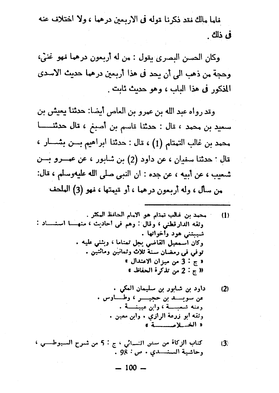 فَأَمَّا مَالِكٌ فَقَدْ ذَكَرْنَا قَوْلَهُ فِي الْأَرْبَعِينَ دِرْهَمًا وَلَا اخْتِلَافَ عَنْهُ فِي ذَلِكَ وَكَانَ الْحَسَنُ الْبَصْرِيُّ يَقُولُ مَنْ لَهُ أَرْبَعُونَ دِرْهَمًا فَهُوَ غَنِيٌّ وَحُجَّةُ مَنْ ذَهَبَ إِلَى أَنْ يَحُدَّ فِي هَذَا أَرْبَعِينَ دِرْهَمًا حَدِيثُ الْأَسَدِيِّ الْمَذْكُورُ فِي هَذَا الْبَابِ وَهُوَ حَدِيثٌ ثَابِتٌ وَقَدْ رَوَاهُ عَبْدُ اللَّهِ بْنُ عَمْرِو بْنِ الْعَاصِ أَيْضًا حَدَّثَنَا يَعِيشُ بْنُ سَعِيدِ بْنِ مُحَمَّدٍ قَالَ حَدَّثَنَا قَاسِمُ بْنُ أَصْبَغَ قَالَ حَدَّثَنَا مُحَمَّدُ بْنُ غَالِبٍ التَّمْتَامُ قَالَ حَدَّثَنَا إِبْرَاهِيمُ بْنُ بَشَّارٍ قَالَ حَدَّثَنَا سُفْيَانُ عَنْ دَاوُدَ بْنِ شَابُورٍ عَنْ عَمْرِو بْنِ شُعَيْبٍ عَنْ أَبِيهِ عَنْ جَدِّهِ أَنَّ النَّبِيَّ صَلَّى اللَّهُ عَلَيْهِ وَسَلَّمَ قَالَ مَنْ سَأَلَ وَلَهُ أَرْبَعُونَ دِرْهَمًا أَوْ قِيمَتُهَا فَهُوَ الْمُلْحِفُ