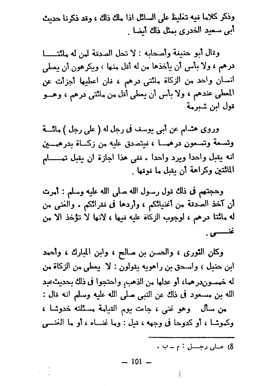 وَذَكَرَ كَلَامًا فِيهِ تَغْلِيظٌ عَلَى السَّائِلِ إِذَا مَلَكَ ذَلِكَ وَقَدْ ذَكَرْنَا حَدِيثَ أَبِي سَعِيدٍ الْخُدْرِيِّ بِمِثْلِ ذَلِكَ أَيْضًا وَقَالَ أَبُو حَنِيفَةَ وَأَصْحَابُهُ لَا تَحِلُّ الصَّدَقَةُ لِمَنْ لَهُ مِائَتَا دِرْهَمٍ وَلَا بَأْسَ أَنْ يَأْخُذَهَا مَنْ لَهُ أَقَلُّ مِنْهَا وَيَكْرَهُونَ أَنْ يُعْطَى إِنْسَانٌ وَاحِدٌ مِنَ الزَّكَاةِ مِائَتَيْ دِرْهَمٍ فَإِنْ أُعْطِيَهَا أَجْزَأَتْ عَنِ الْمُعْطِي عِنْدَهُمْ وَلَا بَأْسَ أَنْ يُعْطَى أَقَلَّ مِنْ مِائَتَيْ دِرْهَمٍ وَهُوَ قَوْلُ ابْنِ شُبْرُمَةَ وَرَوَى هِشَامٌ عَنْ أَبِي يُوسُفَ فِي رَجُلٍ لَهُ (عَلَى رَجُلٍ) مِائَةٌ وَتِسْعَةٌ وَتِسْعُونَ دِرْهَمًا فَيَتَصَدَّقُ عَلَيْهِ مِنْ زَكَاةٍ بِدِرْهَمَيْنِ أَنَّهُ يَقْبَلُ وَاحِدًا وَيَرُدُّ وَاحِدًا فَفِي هَذَا إِجَازَةٌ أَنْ يَقْبَلَ تَمَامَ الْمِائَتَيْنِ وَكَرَاهَةُ أَنْ يَقْبَلَ مَا فَوْقَهَا وَحُجَّتُهُمْ فِي ذَلِكَ قَوْلُ رَسُولِ اللَّهِ صَلَّى اللَّهُ عَلَيْهِ وَسَلَّمَ أُمِرْتُ أَنْ آخُذَ الصَّدَقَةَ مِنْ أَغْنِيَائِكُمْ وَأَرُدَّهَا فِي فُقَرَائِكُمْ وَالْغَنِيُّ مَنْ لَهُ مِائَتَا دِرْهَمٍ لِوُجُوبِ الزَّكَاةِ عَلَيْهِ فِيهَا لِأَنَّهَا لَا تُؤْخَذُ إِلَّا مِنْ غَنِيٍّ وَكَانَ الثَّوْرِيُّ وَالْحَسَنُ بْنُ صَالِحٍ وَابْنُ المبارك وأحمد ابن حَنْبَلٍ وَإِسْحَاقُ بْنُ رَاهَوَيْهِ يَقُولُونَ لَا يُعْطَى مِنَ الزَّكَاةِ مَنْ لَهُ خَمْسُونَ دِرْهَمًا أَوْ عِدْلُهَا مِنَ الذَّهَبِ وَاحْتَجُّوا فِي ذَلِكَ بِحَدِيثِ عَبْدِ اللَّهِ بْنِ مَسْعُودٍ فِي ذَلِكَ عَنِ النَّبِيِّ صَلَّى اللَّهُ عَلَيْهِ وَسَلَّمَ أَنَّهُ قَالَ مَنْ سَأَلَ وَهُوَ غَنِيٌّ جَاءَتْ يَوْمَ الْقِيَامَةِ مسئلته خدوشا وكموشا أَوْ كُدُوحًا فِي وَجْهِهِ قِيلَ وَمَا غِنَاهُ أَوْ مَا الْغِنَى