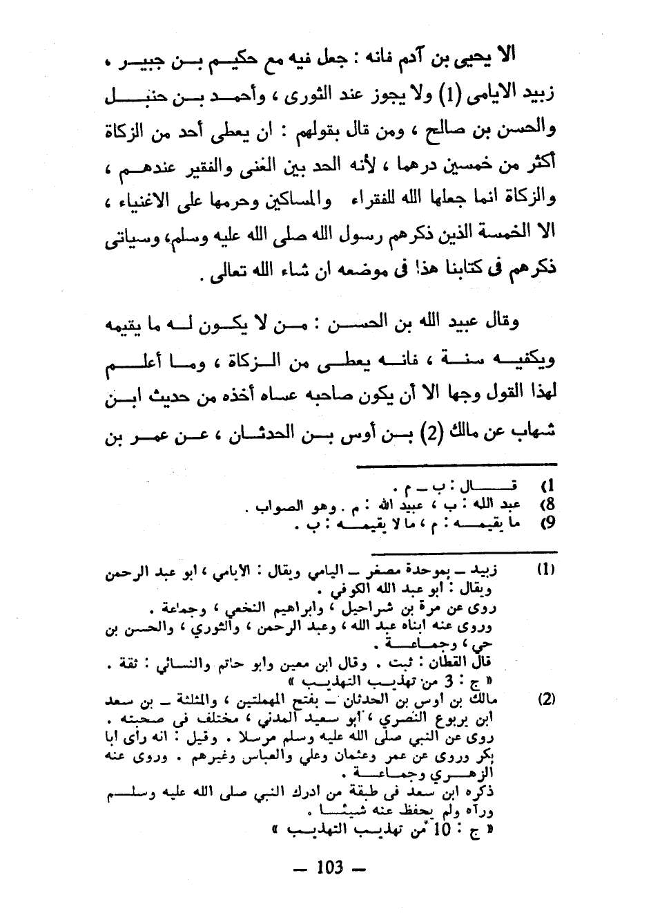 إِلَّا يَحْيَى بْنَ آدَمَ فَإِنَّهُ جَعَلَ فِيهِ مَعَ حَكِيمِ بْنِ جُبَيْرٍ زُبَيْدٌ الْإِيَامِيُّ وَلَا يَجُوزُ عِنْدَ الثَّوْرِيِّ وَأَحْمَدَ بْنِ حَنْبَلٍ وَالْحَسَنِ بْنِ صَالِحٍ وَمَنْ قَالَ بِقَوْلِهِمْ أَنْ يُعْطَى أَحَدٌ مِنَ الزَّكَاةِ أَكْثَرَ مِنْ خَمْسِينَ دِرْهَمًا لِأَنَّهُ الْحَدُّ بَيْنَ الْغَنِيِّ وَالْفَقِيرِ عِنْدَهُمْ وَالزَّكَاةُ إِنَّمَا جَعَلَهَا اللَّهُ لِلْفُقَرَاءِ وَالْمَسَاكِينِ وَحَرَّمَهَا عَلَى الْأَغْنِيَاءِ إِلَّا الْخَمْسَةَ الَّذِينَ ذَكَرَهُمْ رَسُولُ اللَّهِ صَلَّى اللَّهُ عَلَيْهِ وَسَلَّمَ وَسَيَأْتِي ذِكْرُهُمْ فِي كِتَابِنَا هَذَا فِي مَوْضِعِهِ إِنْ شَاءَ اللَّهُ تَعَالَى وَقَالَ عُبَيْدُ اللَّهِ بْنُ الْحَسَنِ مَنْ لَا يَكُونُ لَهُ مَا يُقِيمُهُ وَيَكْفِيهِ سَنَةً فَإِنَّهُ يُعْطَى مِنَ الزَّكَاةِ وَمَا أَعْلَمُ لِهَذَا الْقَوْلِ وَجْهًا إِلَّا أَنْ يَكُونَ صَاحِبُهُ عَسَاهُ أَخَذَهُ مِنْ حَدِيثِ ابْنِ شِهَابٍ عَنْ مَالِكِ بْنِ أَوْسِ بْنِ الْحَدَثَانِ عَنْ عُمَرَ بْنِ