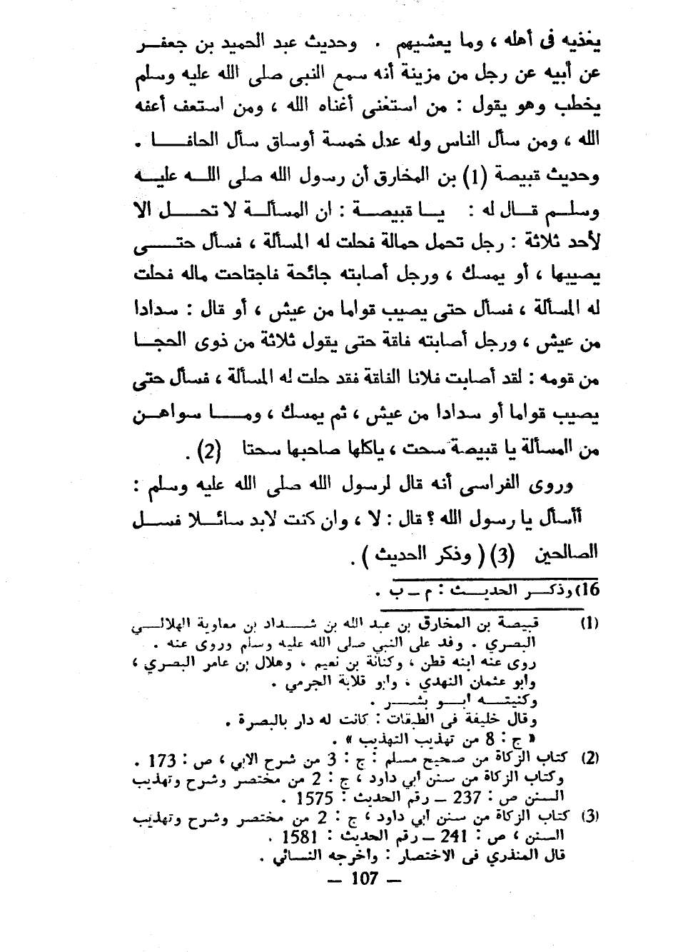يُغَذِّيهِ فِي أَهْلِهِ وَمَا يُعَشِّيهِمْ وَحَدِيثُ عَبْدِ الْحَمِيدِ بْنِ جَعْفَرٍ عَنْ أَبِيهِ عَنْ رَجُلٍ مِنْ مُزَيْنَةَ أَنَّهُ سَمِعَ النَّبِيَّ صَلَّى اللَّهُ عَلَيْهِ وَسَلَّمَ يَخْطُبُ وَهُوَ يَقُولُ مَنِ اسْتَغْنَى أغناه الله ومن استعف أعفه الله ومن سَأَلَ النَّاسَ وَلَهُ عِدْلُ خَمْسَةِ أَوْسَاقٍ سَأَلَ إِلْحَافًا وَحَدِيثُ قَبِيصَةَ بْنِ الْمُخَارِقِ أَنَّ رَسُولَ اللَّهِ صَلَّى اللَّهُ عَلَيْهِ وَسَلَّمَ قَالَ لَهُ يَا قَبِيصَةُ إِنَّ الْمَسْأَلَةَ لَا تَحِلُّ إِلَّا لِأَحَدِ ثَلَاثَةٍ رَجُلٌ تَحَمَّلَ حَمَالَةً فَحَلَّتْ لَهُ الْمَسْأَلَةُ فَسَأَلَ حَتَّى يُصِيبَهَا أَوْ يُمْسِكَ وَرَجُلٌ أَصَابَتْهُ جَائِحَةٌ فَاجْتَاحَتْ مَالَهُ فَحَلَّتْ لَهُ الْمَسْأَلَةُ فَسَأَلَ حَتَّى يُصِيبَ قِوَامًا مِنْ عَيْشٍ أَوْ قَالَ سَدَادًا مِنْ عَيْشٍ وَرَجُلٌ أَصَابَتْهُ فَاقَةٌ حَتَّى يَقُولَ ثَلَاثَةٌ مِنْ ذَوِي الْحِجَا مِنْ قَوْمِهِ لَقَدْ أَصَابَتْ فُلَانًا الْفَاقَةُ فَقَدْ حَلَّتْ لَهُ الْمَسْأَلَةُ فَسَأَلَ حَتَّى يُصِيبَ قِوَامًا أَوْ سَدَادًا مِنْ عَيْشٍ ثُمَّ يُمْسِكُ وَمَا سِوَاهُنَّ مِنَ الْمَسْأَلَةِ يَا قَبِيصَةُ سُحْتٌ يَأْكُلُهَا صَاحِبُهَا سُحْتًا وَرَوَى الْفِرَاسِيُّ أَنَّهُ قَالَ لِرَسُولِ اللَّهِ صَلَّى اللَّهُ عَلَيْهِ وَسَلَّمَ أَأَسْأَلُ يَا رَسُولَ اللَّهِ قَالَ لَا وَإِنْ كُنْتَ لَا بُدَّ سَائِلًا فَسَلِ الصَّالِحِينَ (وَذَكَرَ الْحَدِيثَ)