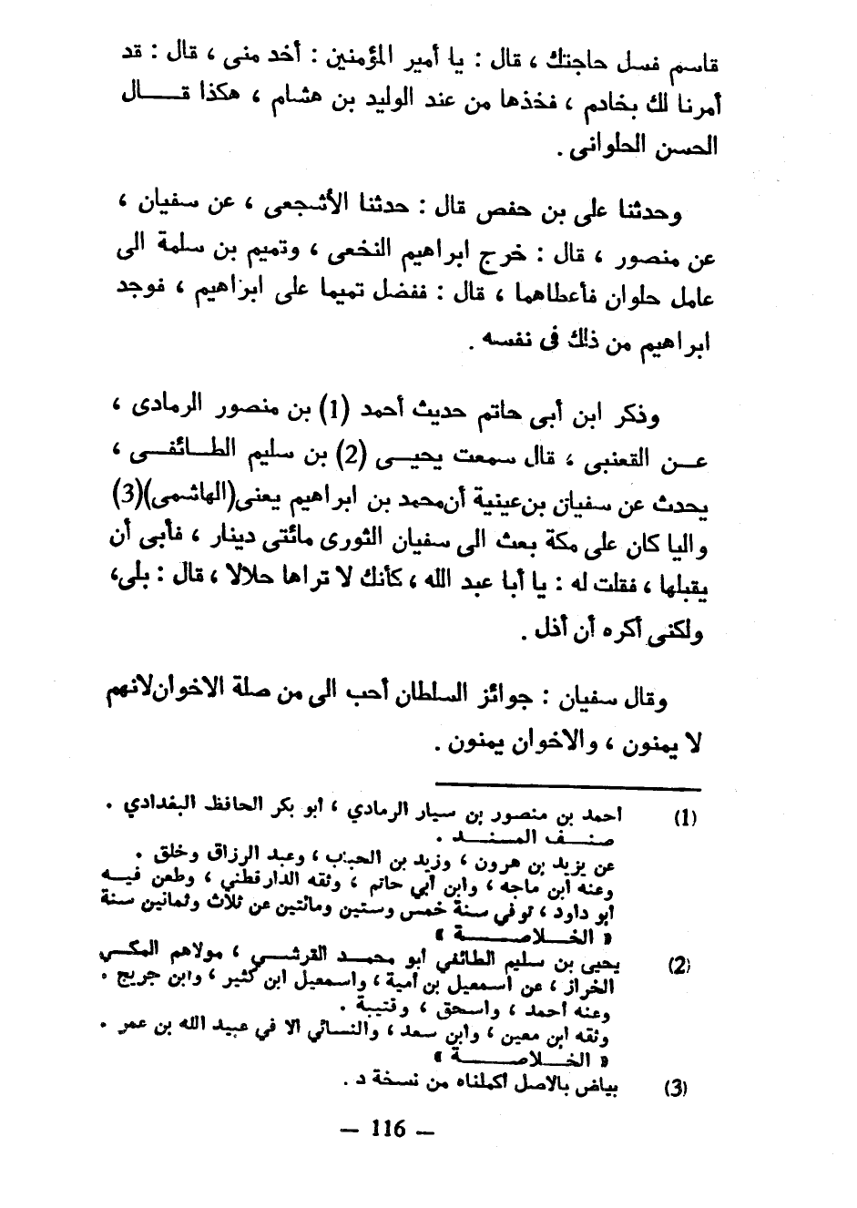 قَاسِمٌ فَسَلْ حَاجَتَكَ قَالَ يَا أَمِيرَ الْمُؤْمِنِينَ أُخِذَ مِنِّي قَالَ قَدْ أَمَرْنَا لَكَ بِخَادِمٍ فَخُذْهَا مِنْ عِنْدِ الْوَلِيدِ بْنِ هِشَامٍ هَكَذَا قَالَ الْحَسَنُ الْحُلْوَانِيُّ وَحَدَّثَنَا عَلِيُّ بْنُ حَفْصٍ قَالَ حَدَّثَنَا الْأَشْجَعِيُّ عَنْ سُفْيَانَ عَنْ مَنْصُورٍ قَالَ خَرَجَ إِبْرَاهِيمُ النَّخَعِيُّ وَتَمِيمُ بْنُ سَلَمَةَ إِلَى عَامِلِ حُلْوَانَ فَأَعْطَاهُمَا قَالَ فَفَضَّلَ تَمِيمًا عَلَى إِبْرَاهِيمَ فَوَجَدَ إِبْرَاهِيمُ مِنْ ذَلِكَ فِي نَفْسِهِ وَذَكَرَ ابْنُ أَبِي حَاتِمٍ حَدِيثَ أَحْمَدَ بن منصور الرمادي عن القعنبي قال سَمِعْتُ يَحْيَى بْنَ سَلِيمٍ الطَّائِفِيَّ يُحَدِّثُ عَنْ سُفْيَانَ بْنِ عُيَيْنَةَ أَنَّ مُحَمَّدَ بْنَ إِبْرَاهِيمَ يَعْنِي (الْهَاشِمِيَّ) وَالِيًا كَانَ عَلَى مَكَّةَ بَعَثَ إِلَى سُفْيَانَ الثَّوْرِيِّ مِائَتَيْ دِينَارٍ فَأَبَى أَنْ يَقْبَلَهَا فَقُلْتُ لَهُ يَا أَبَا عَبْدِ اللَّهِ كَأَنَّكَ لَا تَرَاهَا حَلَالًا قَالَ بَلَى وَلَكِنِّي أَكْرَهُ أَنْ أُذَلَّ وَقَالَ سُفْيَانُ جَوَائِزُ السُّلْطَانِ أَحَبُّ إِلَيَّ مِنْ صِلَةِ الْإِخْوَانِ لِأَنَّهُمْ لَا يَمُنُّونَ وَالْإِخْوَانُ يَمُنُّونَ