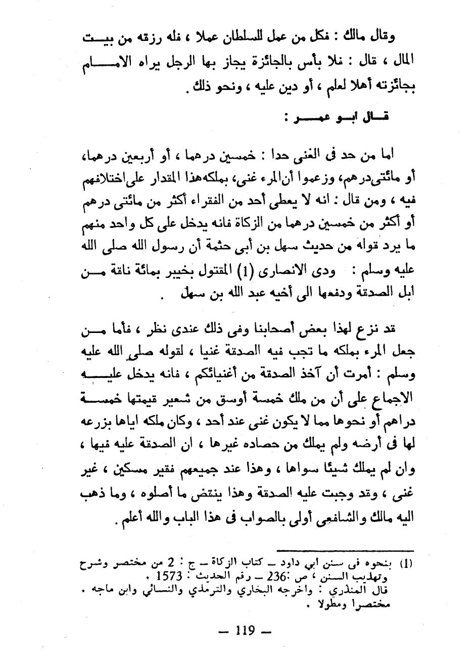 وَقَالَ مَالِكٌ فَكُلٌّ مَنْ عَمِلَ لِلسُّلْطَانِ عَمَلًا فَلَهُ رِزْقُهُ مِنْ بَيْتِ الْمَالِ قَالَ فَلَا بأس بالجائزة يجاز بِهَا الرَّجُلُ يَرَاهُ الْإِمَامُ بِجَائِزَتِهِ أَهْلًا لِعِلْمٍ أَوْ دَيْنٍ عَلَيْهِ وَنَحْوُ ذَلِكَ قَالَ أَبُو عُمَرَ أَمَّا مَنْ حَدَّ فِي الْغِنَى حَدًّا خَمْسِينَ دِرْهَمًا أَوْ أَرْبَعِينَ دِرْهَمًا أَوْ مِائَتَيْ دِرْهَمٍ وَزَعَمُوا أَنَّ الْمَرْءَ غَنِيٌّ بِمَلْكِهِ هَذَا الْمِقْدَارَ عَلَى اخْتِلَافِهِمْ فِيهِ وَمَنْ قَالَ إِنَّهُ لَا يُعْطَى أَحَدٌ مِنَ الْفُقَرَاءِ أَكْثَرَ مِنْ مِائَتَيْ دِرْهَمٍ أَوْ أَكْثَرَ مِنْ خَمْسِينَ دِرْهَمًا مِنَ الزَّكَاةِ فَإِنَّهُ يَدْخُلُ عَلَى كُلِّ وَاحِدٍ مِنْهُمْ مَا يَرُدُّ قَوْلَهُ مِنْ حَدِيثِ سَهْلِ بْنِ أَبِي حَثْمَةَ أَنَّ رَسُولَ اللَّهِ صَلَّى اللَّهُ عَلَيْهِ وَسَلَّمَ وَدَى الْأَنْصَارِيَّ الْمَقْتُولَ بِخَيْبَرَ بِمِائَةِ نَاقَةٍ مِنْ إِبِلِ الصَّدَقَةِ وَدَفَعَهَا إِلَى أَخِيهِ عَبْدِ اللَّهِ بْنِ سَهْلٍ قَدْ نَزَعَ لِهَذَا بَعْضُ أَصْحَابِنَا وَفِي ذَلِكَ عِنْدِي نَظَرٌ فَأَمَّا مَنْ جَعَلَ الْمَرْءَ بِمَلْكِهِ مَا تَجِبُ فِيهِ الصَّدَقَةُ غَنِيًّا لِقَوْلِهِ صَلَّى اللَّهُ عَلَيْهِ وَسَلَّمَ أُمِرْتُ أَنْ آخُذَ الصَّدَقَةَ مِنْ أَغْنِيَائِكُمْ فَإِنَّهُ يَدْخُلُ عَلَيْهِ الْإِجْمَاعُ عَلَى أَنَّ مَنْ مَلَكَ خَمْسَةَ أَوْسُقٍ مِنْ شَعِيرٍ قِيمَتُهَا خَمْسَةُ دَرَاهِمَ أَوْ نَحْوُهَا مِمَّا لَا يَكُونُ غِنًى عِنْدَ أَحَدٍ وَكَانَ مَلْكُهُ إِيَّاهَا بِزَرْعِهِ لَهَا فِي أَرْضِهِ وَلَمْ يَمْلِكْ مِنْ حَصَادِهِ غَيْرَهَا أَنَّ الصَّدَقَةَ عَلَيْهِ فِيهَا وَإِنْ لَمْ يَمْلِكْ شيئا سوها وَهَذَا عِنْدَ جَمِيعِهِمْ فَقِيرٌ مِسْكِينٌ غَيْرُ غَنِيٍّ وَقَدْ وَجَبَتْ عَلَيْهِ الصَّدَقَةُ وَهَذَا يَنْقُضُ مَا أَصَّلُوهُ وَمَا ذَهَبَ إِلَيْهِ مَالِكٌ وَالشَّافِعِيُّ أَوْلَى بِالصَّوَابِ فِي هَذَا الْبَابِ وَاللَّهُ أَعْلَمُ