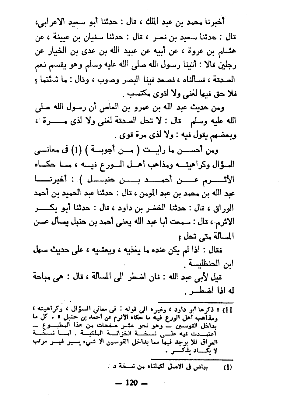 أَخْبَرَنَا مُحَمَّدُ بْنُ عَبْدِ الْمَلِكِ قَالَ حَدَّثَنَا أَبُو سَعِيدٍ الْأَعْرَابِيُّ قَالَ حَدَّثَنَا سَعِيدُ بْنُ نَصْرٍ قَالَ حَدَّثَنَا سُفْيَانُ بْنُ عُيَيْنَةَ عَنْ هِشَامِ بْنِ عُرْوَةَ عَنْ أَبِيهِ عَنْ عُبَيْدِ اللَّهِ بْنِ عَدِيِّ بْنِ الْخِيَارِ عَنْ رجلين قَالَا أَتَيْنَا رَسُولَ اللَّهِ صَلَّى اللَّهُ عَلَيْهِ وَسَلَّمَ وَهُوَ يُقَسِّمُ نِعَمَ الصَّدَقَةِ فَسَأَلْنَاهُ فَصَعَّدَ فِينَا الْبَصَرَ وَصَوَّبَ وَقَالَ مَا شِئتُمَا فَلَا حَقَّ فِيهَا لِغَنِيٍّ وَلَا لِقَوِيٍّ مُكْتَسِبٍ وَمِنْ حَدِيثِ عَبْدِ اللَّهِ بْنِ عَمْرِو بْنِ الْعَاصِ أَنَّ رسول الله صلى الله عليه وسلم قَالَ لَا تَحِلُّ الصَّدَقَةُ لِغَنِيٍّ وَلَا لِذِي مِرَّةٍ وَبَعْضُهُمْ يَقُولُ فِيهِ وَلَا لِذِي مِرَّةٍ قَوِيٍّ وَمِنْ أَحْسَنِ مَا رَأَيْتُ (مِنْ أَجْوِبَةٍ) فِي مَعَانِي السُّؤَالِ وَكَرَاهِيَتِهِ وَمَذَاهِبِ أَهْلِ الْوَرَعِ فِيهِ مَا حَكَاهُ الْأَثْرَمُ عَنْ أَحْمَدَ بْنِ حَنْبَلٍ) أَخْبَرَنَا عَبْدُ اللَّهِ بْنُ مُحَمَّدِ بْنِ عَبْدِ الْمُؤْمِنِ قَالَ حَدَّثَنَا عَبْدُ الْحَمِيدِ بْنُ أَحْمَدَ الْوَرَّاقُ قَالَ حَدَّثَنَا الْخَضِرُ بْنُ دَاوُدَ قَالَ حَدَّثَنَا أَبُو بَكْرٍ الْأَثْرَمُ قَالَ سَمِعْتُ أَبَا عَبْدِ اللَّهِ يَعْنِي أَحْمَدَ بْنَ حَنْبَلٍ يَسْأَلُ عَنِ الْمَسْأَلَةِ مَتَى تَحِلُّ فَقَالَ إِذَا لَمْ يَكُنْ عِنْدَهُ مَا يُغَذِّيهِ وَيُعَشِّيهِ عَلَى حديث سهل ابن الْحَنْظَلِيَّةِ قِيلَ لِأَبِي عَبْدِ اللَّهِ فَإِنِ اضْطُرَّ إِلَى الْمَسْأَلَةِ قَالَ هِيَ مُبَاحَةٌ لَهُ إِذَا اضطر