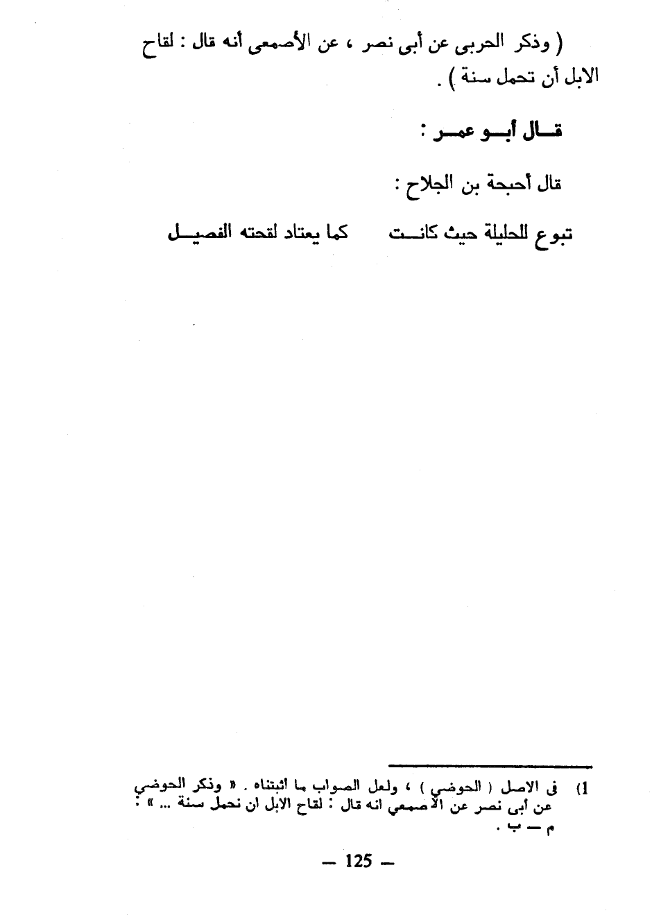 (وَذَكَرَ الْحَرْبِيُّ عَنْ أَبِي نَصْرٍ عَنِ الْأَصْمَعِيِّ أَنَّهُ قَالَ لِقَاحُ الْإِبِلِ أَنْ تَحْمِلَ سَنَةً) قَالَ أَبُو عُمَرَ قَالَ أَحْبَحَةُ بْنُ الْجَلَّاحِ ... تبوع للحليلة حيث كانت ... كما يعتاد لقحت الفصيل