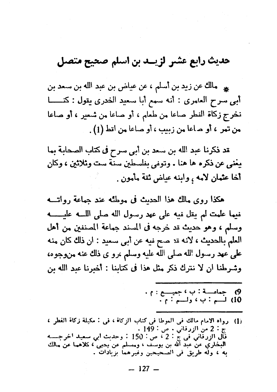 حديث رابع عَشَرَ لِزَيْدِ بْنِ أَسْلَمَ صَحِيحٌ مُتَّصِلٌ مَالِكٌ عن زيد ابن أَسْلَمَ عَنْ عِيَاضِ بْنِ عَبْدِ اللَّهِ بْنِ سَعْدِ بْنِ أَبِي سَرْحٍ الْعَامِرِيِّ أَنَّهُ سَمِعَ أَبَا سَعِيدٍ الْخُدْرِيَّ يَقُولُ كُنَّا نُخْرِجُ زَكَاةَ الْفِطْرِ صَاعًا مِنْ طَعَامٍ أَوْ صَاعًا مِنْ شَعِيرٍ أَوْ صَاعًا مِنْ تَمْرٍ أَوْ صَاعًا مِنْ زَبِيبٍ أَوْ صَاعًا مِنْ أَقِطٍ قَدْ ذَكَرْنَا عَبْدَ اللَّهِ بْنِ سَعْدِ بْنِ أَبِي سَرْحٍ فِي كِتَابِ الصَّحَابَةِ بِمَا يُغْنِي عَنْ ذِكْرِهِ ها هنا وَتُوُفِّيَ بِفِلَسْطِينَ سَنَةَ سِتٍّ وَثَلَاثِينَ وَكَانَ أَخَا عُثْمَانَ لِأُمِّهِ وَابْنُهُ عِيَاضٌ ثِقَةٌ مَأْمُونٌ هَكَذَا رَوَى مَالِكٌ هَذَا الْحَدِيثَ فِي مُوَطَّئِهِ عِنْدَ جَمَاعَةِ رُوَاتِهِ فِيمَا عَلِمْتُ لَمْ يَقُلْ فِيهِ عَلَى عَهْدِ رَسُولِ اللَّهِ صَلَّى اللَّهُ عَلَيْهِ وَسَلَّمَ وَهُوَ حَدِيثٌ قَدْ خَرَّجَهُ فِي الْمُسْنَدِ جَمَاعَةُ الْمُصَنِّفِينَ مِنْ أَهْلِ الْعِلْمِ بِالْحَدِيثِ لِأَنَّهُ قَدْ صَحَّ فِيهِ عَنْ أَبِي سَعِيدٍ إِنَّ ذَلِكَ كَانَ مِنْهُ عَلَى عَهْدِ رَسُولِ اللَّهِ صَلَّى اللَّهُ عَلَيْهِ وَسَلَّمَ رَوَى ذَلِكَ عَنْهُ مِنْ وُجُوهٍ وَشَرْطُنَا أَنْ لَا نَتْرُكَ ذِكْرَ مِثْلَ هَذَا فِي كِتَابِنَا أَخْبَرَنَا عَبْدُ اللَّهِ بْنُ