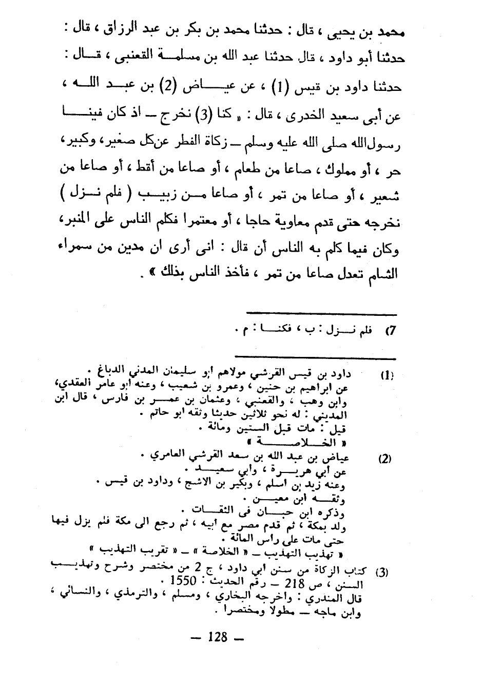 مُحَمَّدِ بْنِ يَحْيَى قَالَ حَدَّثَنَا مُحَمَّدُ بْنُ بَكْرِ بْنِ عَبْدِ الرَّزَّاقِ قَالَ حَدَّثَنَا أَبُو دَاوُدَ قَالَ حَدَّثَنَا عَبْدُ اللَّهِ بْنُ مَسْلَمَةَ الْقَعْنَبِيُّ قَالَ حَدَّثَنَا دَاوُدُ بْنُ قَيْسٍ عَنْ عِيَاضِ بْنِ عَبْدِ اللَّهِ عَنْ أَبِي سَعِيدٍ الْخُدْرِيِّ قال كنا نخرج إذا كَانَ فِينَا رَسُولُ اللَّهِ صَلَّى اللَّهُ عَلَيْهِ وَسَلَّمَ زَكَاةَ الْفِطْرِ عَنْ كُلِّ صَغِيرٍ وَكَبِيرٍ حُرٍّ أَوْ مَمْلُوكٍ صَاعًا مِنْ طَعَامٍ أَوْ صَاعًا مِنْ أَقِطٍ أَوْ صَاعًا مِنْ شَعِيرٍ أَوْ صَاعًا مِنْ تَمْرٍ أَوْ صَاعًا مِنْ زَبِيبٍ (فَلَمْ نَزَلْ) نُخْرِجُهُ حَتَّى قَدِمَ مُعَاوِيَةُ حَاجًّا أَوْ مُعْتَمِرًا فَكَلَّمَ النَّاسَ عَلَى الْمِنْبَرِ وَكَانَ فِيمَا كَلَّمَ بِهِ النَّاسَ أَنْ قَالَ إِنِّي أَرَى أَنَّ مُدَّيْنِ مِنْ سَمْرَاءِ الشَّامِ تَعَدِلُ صَاعًا مِنْ تَمْرٍ فَأَخَذَ النَّاسُ بِذَلِكَ