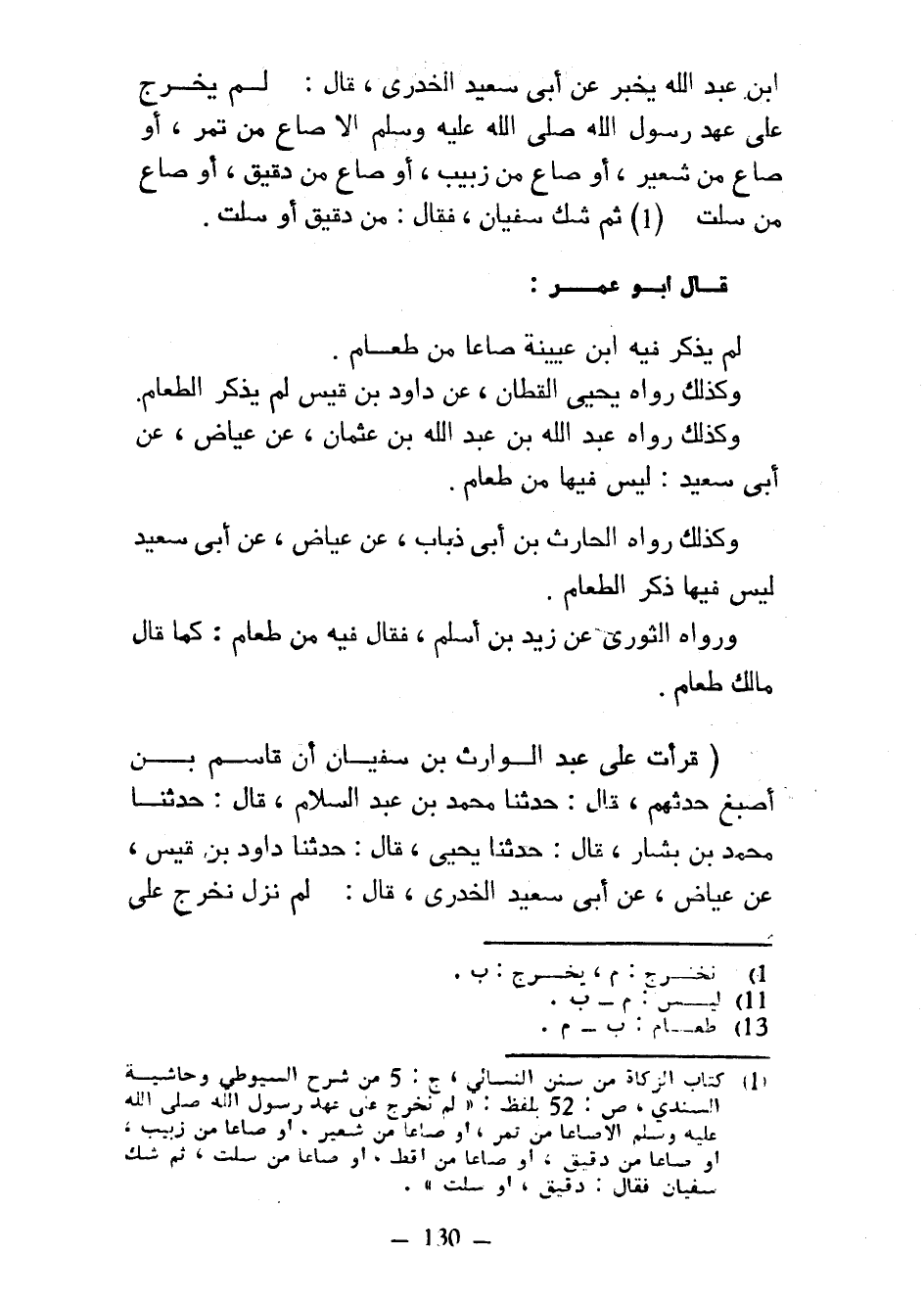 ابن عَبْدِ اللَّهِ يُخْبِرُ عَنْ أَبِي سَعِيدٍ الْخُدْرِيِّ قَالَ لَمْ يُخْرَجْ عَلَى عَهْدِ رَسُولِ اللَّهِ صَلَّى اللَّهُ عَلَيْهِ وَسَلَّمَ إِلَّا صَاعٌ مِنْ تَمْرٍ أَوْ صَاعٌ مِنْ شَعِيرٍ أَوْ صَاعٌ مِنْ زَبِيبٍ أَوْ صَاعٌ مِنْ دَقِيقٍ أَوْ صَاعٌ مِنْ سُلْتٍ ثُمَّ شَكَّ سُفْيَانُ فَقَالَ مِنْ دَقِيقٍ أَوْ سُلْتٍ قَالَ أَبُو عُمَرَ لم ذكر فِيهِ ابْنُ عُيَيْنَةَ صَاعًا مِنْ طَعَامٍ وَكَذَلِكَ رَوَاهُ يَحْيَى الْقَطَّانُ عَنْ دَاوُدَ بْنِ قَيْسٍ لَمْ يَذْكُرِ الطَّعَامَ وَكَذَلِكَ رَوَاهُ عَبْدُ اللَّهِ بن عبد الله بن عثمان عن عياض عَنْ أَبِي سَعِيدٍ لَيْسَ فِيهَا مِنْ طَعَامٍ وَكَذَلِكَ رَوَاهُ الْحَارِثُ بْنُ أَبِي ذُبَابٍ عَنْ عِيَاضٍ عَنْ أَبِي سَعِيدٍ لَيْسَ فِيهَا ذِكْرُ الطَّعَامِ وَرَوَاهُ الثَّوْرِيُّ عَنْ زَيْدِ بْنِ أَسْلَمَ فَقَالَ فِيهِ مِنْ طَعَامٍ كَمَا قَالَ مَالِكٌ طعام (قَرَأْتُ عَلَى عَبْدِ الْوَارِثِ بْنِ سُفْيَانَ أَنَّ قَاسِمَ بْنَ أَصْبَغَ حَدَّثَهُمْ قَالَ حَدَّثَنَا مُحَمَّدُ بْنُ عَبْدِ السَّلَامِ قَالَ حَدَّثَنَا مُحَمَّدُ بْنُ بَشَّارٍ قَالَ حَدَّثَنَا يَحْيَى قَالَ حَدَّثَنَا دَاوُدُ بْنُ قَيْسٍ عَنْ عِيَاضٍ عَنْ أَبِي سَعِيدٍ الْخُدْرِيِّ قَالَ لَمْ نَزَلْ نُخْرِجُ عَلَى