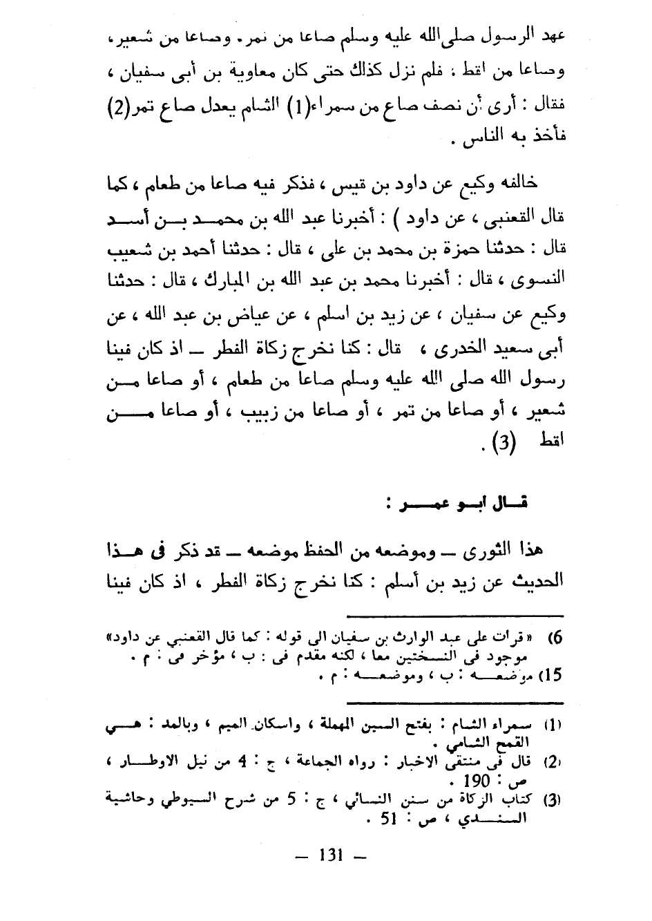 عَهْدِ الرَّسُولِ صَلَّى اللَّهُ عَلَيْهِ وَسَلَّمَ صَاعًا مِنْ تَمْرٍ وَصَاعًا مِنْ شَعِيرٍ وَصَاعًا مِنْ أَقِطٍ فَلَمْ نَزَلْ كَذَلِكَ حَتَّى كَانَ مُعَاوِيَةُ بْنُ أَبِي سُفْيَانَ فَقَالَ أَرَى أَنَّ نِصْفَ صَاعٍ مِنْ سَمْرَاءِ الشَّامِ يَعْدِلُ صَاعَ تَمْرٍ فَأَخَذَ بِهِ النَّاسُ خَالَفَهُ وَكِيعٌ عَنْ دَاوُدَ بْنِ قَيْسٍ فَذَكَرَ فِيهِ صَاعًا مِنْ طَعَامٍ كَمَا قَالَ الْقَعْنَبِيُّ عَنْ دَاوُدَ) أَخْبَرَنَا عَبْدُ اللَّهِ بْنُ مُحَمَّدِ بْنِ أَسَدٍ قَالَ حَدَّثَنَا حَمْزَةُ بْنُ مُحَمَّدِ بْنِ عَلِيٍّ قَالَ حَدَّثَنَا أَحْمَدُ بْنُ شُعَيْبٍ النَّسَوِيُّ قَالَ أَخْبَرَنَا مُحَمَّدُ بْنُ عَبْدِ اللَّهِ بْنِ الْمُبَارَكِ قَالَ حَدَّثَنَا وكيع عن سفيان عن زيد ابن أَسْلَمَ عَنْ عِيَاضِ بْنِ عَبْدِ اللَّهِ عَنْ أَبِي سَعِيدٍ الْخُدْرِيِّ قَالَ كُنَّا نُخْرِجُ زَكَاةَ الْفِطْرِ إِذْ كَانَ فِينَا رَسُولُ اللَّهِ صَلَّى اللَّهُ عَلَيْهِ وَسَلَّمَ صَاعًا مِنْ طَعَامٍ أَوْ صَاعًا مِنْ شَعِيرٍ أَوْ صَاعًا مِنْ تَمْرٍ أَوْ صَاعًا مِنْ زَبِيبٍ أَوْ صَاعًا مِنْ أَقِطٍ قَالَ أَبُو عُمَرَ هَذَا الثَّوْرِيُّ وَمَوْضِعُهُ من الحفظ وموضعه قَدْ ذَكَرَ فِي هَذَا الْحَدِيثِ عَنْ زَيْدِ بْنِ أَسْلَمَ كُنَّا نُخْرِجُ زَكَاةَ الْفِطْرِ إِذْ كان فينا