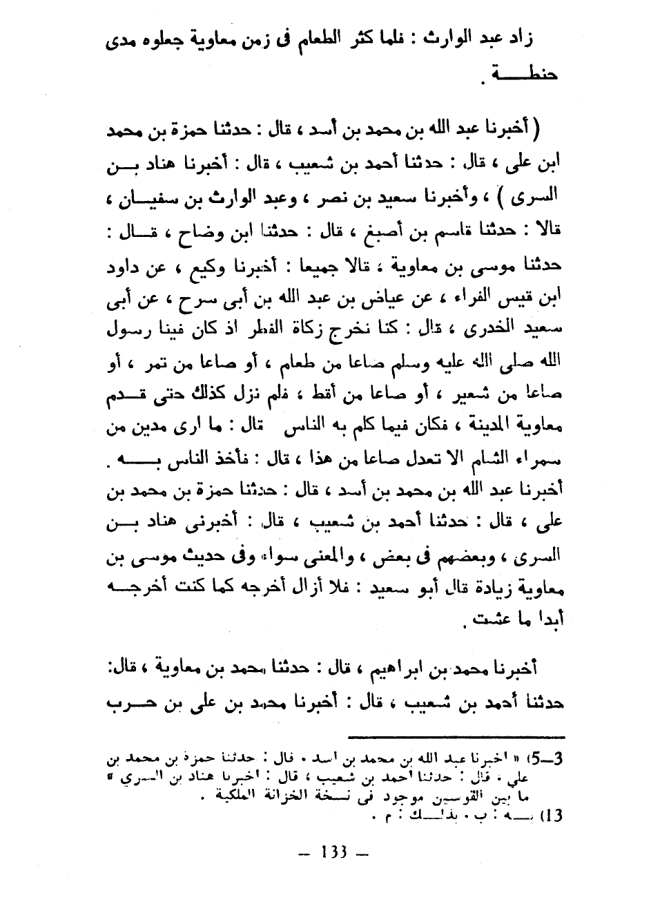 زَادَ عَبْدُ الْوَارِثِ فَلَمَّا كَثُرَ الطَّعَامُ فِي زمن معاوية جعلوه مدى حِنْطَةٍ (أَخْبَرَنَا عَبْدُ اللَّهِ بْنُ مُحَمَّدِ بْنِ أَسَدٍ قال حدثنا حمزة بن محمد ابن عَلِيٍّ قَالَ حَدَّثَنَا أَحْمَدُ بْنُ شُعَيْبٍ قَالَ أَخْبَرَنَا هَنَّادُ بْنُ السَّرِيِّ وَأَخْبَرَنَا سَعِيدُ بْنُ نَصْرٍ وَعَبْدُ الْوَارِثِ بْنُ سُفْيَانَ قَالَا حَدَّثَنَا قَاسِمُ بْنُ أَصْبَغَ قَالَ حَدَّثَنَا ابْنُ وَضَّاحٍ قَالَ حَدَّثَنَا مُوسَى بْنُ مُعَاوِيَةَ قَالَا جَمِيعًا أخبرنا وكيع عن داود ابن قَيْسٍ الْفَرَّاءِ عَنْ عِيَاضِ بْنِ عَبْدِ اللَّهِ بْنِ أَبِي سَرْحٍ عَنْ أَبِي سَعِيدٍ الْخُدْرِيِّ قَالَ كُنَّا نُخْرِجُ زَكَاةَ الْفِطْرِ إِذْ كَانَ فِينَا رَسُولُ اللَّهِ صَلَّى اللَّهُ عَلَيْهِ وَسَلَّمَ صَاعًا مِنْ طَعَامٍ أَوْ صَاعًا مِنْ تَمْرٍ أَوْ صَاعًا مِنْ شَعِيرٍ أو صاعا من أَقِطٍ فَلَمْ نَزَلْ كَذَلِكَ حَتَّى قَدِمَ مُعَاوِيَةُ الْمَدِينَةَ فَكَانَ فِيمَا كَلَّمَ بِهِ النَّاسَ قَالَ مَا أَرَى مُدَّيْنِ مِنْ سَمْرَاءِ الشَّامِ إِلَّا تَعْدِلُ صَاعًا مِنْ هَذَا قَالَ فَأَخَذَ النَّاسُ بِهِ أَخْبَرَنَا عَبْدُ اللَّهِ بْنُ مُحَمَّدِ بْنِ أَسَدٍ قَالَ حَدَّثَنَا حَمْزَةُ بْنُ مُحَمَّدِ بْنِ عَلِيٍّ قَالَ حَدَّثَنَا أَحْمَدُ بْنُ شُعَيْبٍ قَالَ أَخْبَرَنِي هَنَّادُ بْنُ السَّرِيِّ وَبَعْضُهُمْ فِي بَعْضٍ وَالْمَعْنَى سَوَاءٌ وَفِي حَدِيثِ مُوسَى بْنِ مُعَاوِيَةَ زِيَادَةٌ قَالَ أَبُو سَعِيدٍ فَلَا أَزَالُ أُخْرِجُهُ كَمَا كُنْتُ أُخْرِجُهُ أَبَدًا مَا عِشْتُ أَخْبَرَنَا مُحَمَّدُ بْنُ إِبْرَاهِيمَ قَالَ حَدَّثَنَا مُحَمَّدُ بْنُ مُعَاوِيَةَ قَالَ حَدَّثَنَا أَحْمَدُ بْنُ شُعَيْبٍ قَالَ أَخْبَرَنَا مُحَمَّدُ بْنُ عَلِيِّ بْنِ حَرْبٍ