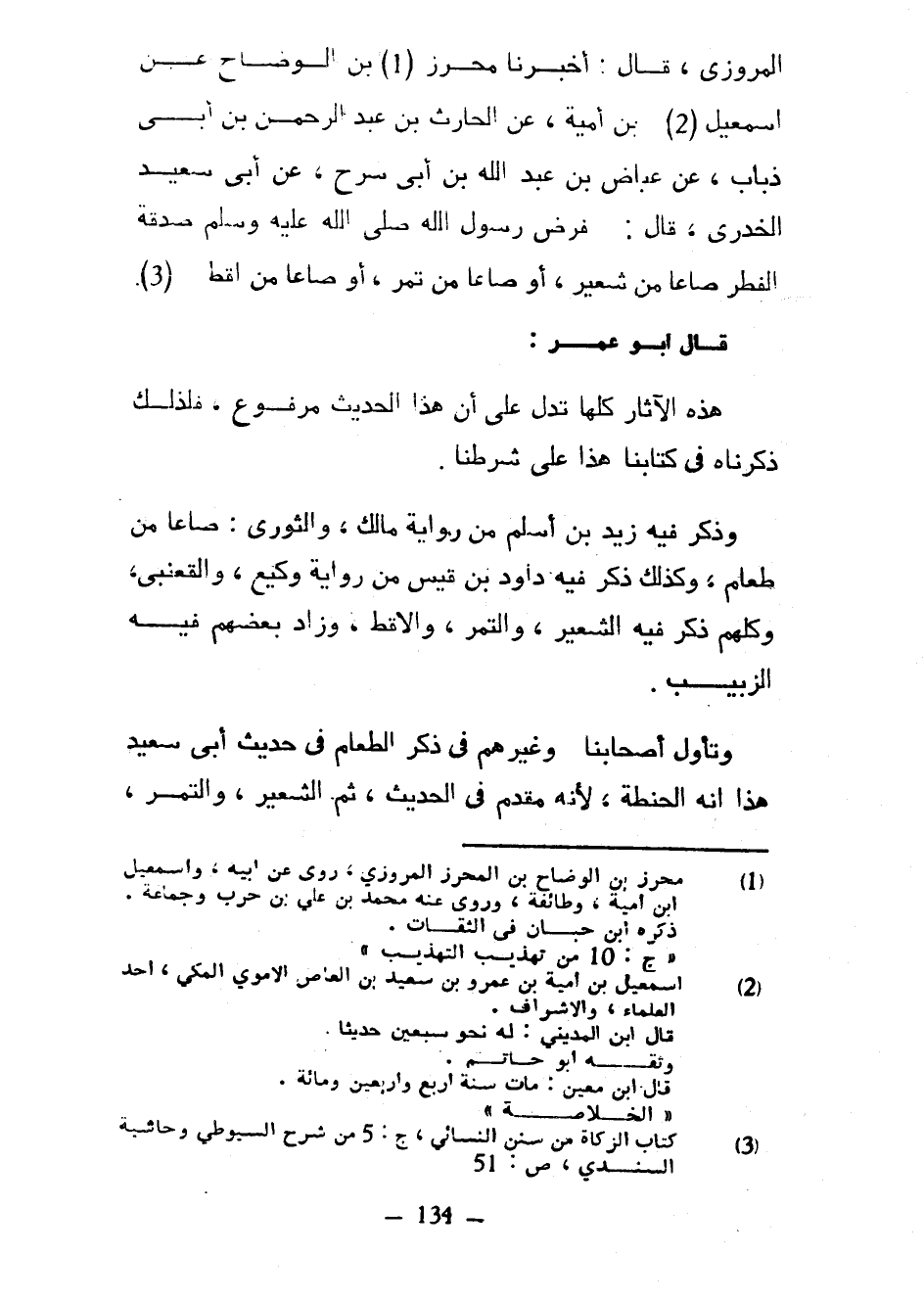 الْمَرْوَزِيُّ قَالَ أَخْبَرَنَا مُحْرِزُ بْنُ الْوَضَّاحِ عَنْ إسمعيل بْنِ أُمَيَّةَ عَنِ الْحَارِثِ بْنِ عَبْدِ الرَّحْمَنِ بْنِ أَبِي ذُبَابٍ عَنْ عِيَاضِ بْنِ عَبْدِ اللَّهِ بْنِ أَبِي سَرْحٍ عَنْ أَبِي سَعِيدٍ الْخُدْرِيِّ قَالَ فَرَضَ رَسُولُ اللَّهِ صَلَّى اللَّهُ عَلَيْهِ وَسَلَّمَ صَدَقَةَ الْفِطْرِ صَاعًا مِنْ شَعِيرٍ أَوْ صَاعًا مِنْ تَمْرٍ أَوْ صَاعًا مِنْ أَقِطٍ قَالَ أَبُو عُمَرَ هَذِهِ الْآثَارُ كُلُّهَا تَدُلُّ عَلَى أَنَّ هَذَا الْحَدِيثَ مَرْفُوعٌ فَلِذَلِكَ ذَكَرْنَاهُ فِي كِتَابِنَا هَذَا عَلَى شَرْطِنَا وَذَكَرَ فِيهِ زَيْدُ بْنُ أَسْلَمَ مِنْ رِوَايَةِ مَالِكٍ وَالثَّوْرِيِّ صَاعًا مِنْ طَعَامٍ وَكَذَلِكَ ذَكَرَ فِيهِ دَاوُدُ بْنُ قَيْسٍ مِنْ رِوَايَةِ وَكِيعٍ وَالْقَعْنَبِيِّ وَكُلُّهُمْ ذَكَرَ فِيهِ الشَّعِيرَ وَالتَّمْرَ وَالْأَقِطَ وَزَادَ بَعْضُهُمْ فِيهِ الزَّبِيبَ وَتَأَوَّلَ أَصْحَابُنَا وَغَيْرُهُمْ فِي ذِكْرِ الطَّعَامِ فِي حَدِيثِ أَبِي سَعِيدٍ هَذَا أَنَّهُ الْحِنْطَةُ لِأَنَّهُ مُقَدَّمٌ فِي الْحَدِيثِ ثُمَّ الشعير والتمر