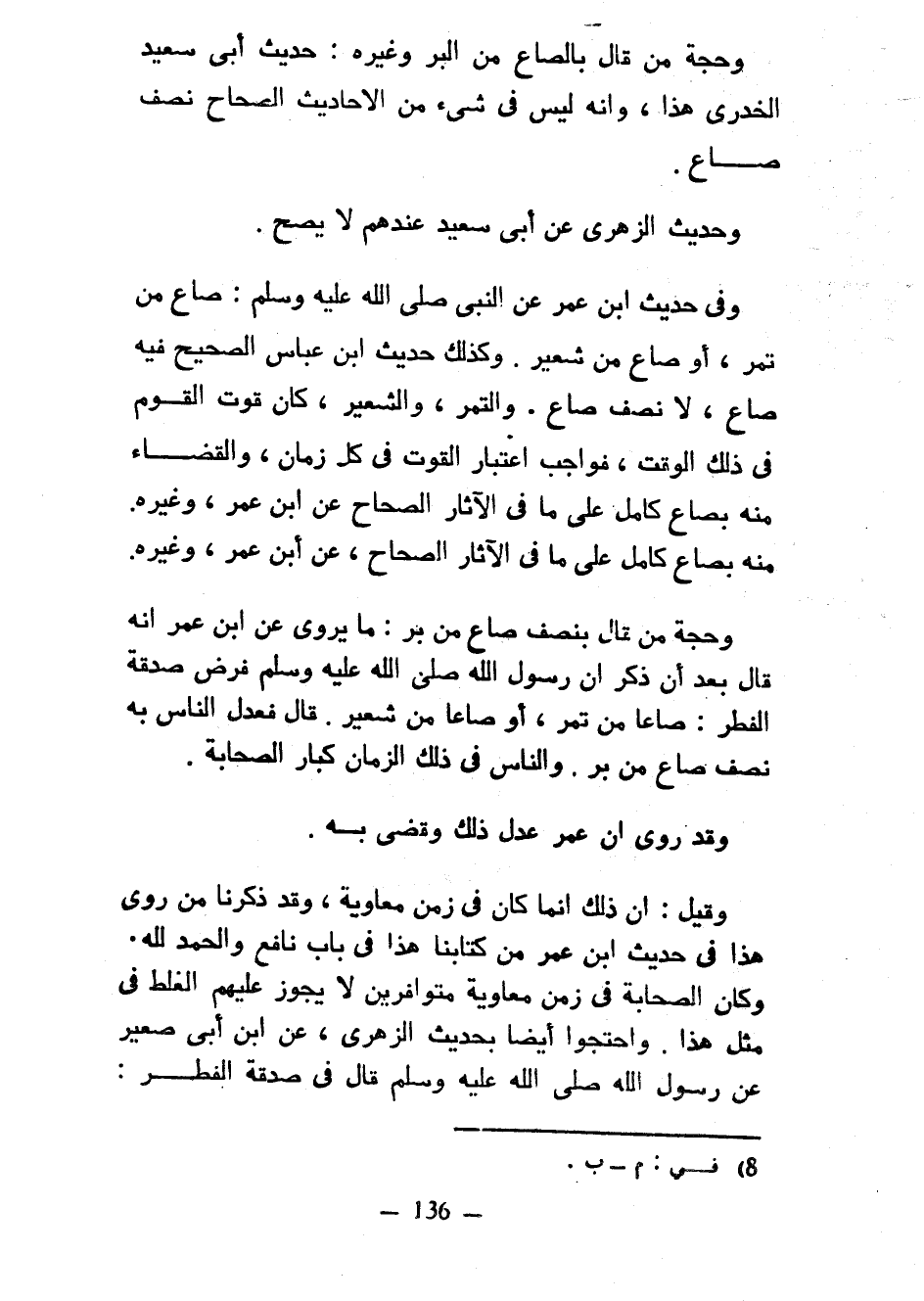 وَحُجَّةُ مَنْ قَالَ بِالصَّاعِ مِنَ الْبُرِّ وَغَيْرِهِ حَدِيثُ أَبِي سَعِيدٍ الْخُدْرِيِّ هَذَا وَأَنَّهُ لَيْسَ فِي شَيْءٍ مِنَ الْأَحَادِيثِ الصِّحَاحِ نِصْفُ صَاعٍ وَحَدِيثُ الزُّهْرِيِّ عَنْ أَبِي سَعِيدِ عِنْدَهُمْ لَا يَصِحُّ وَفِي حَدِيثِ ابْنِ عُمَرَ عَنِ النَّبِيِّ صَلَّى اللَّهُ عَلَيْهِ وَسَلَّمَ صَاعٌ مِنْ تَمْرٍ أَوْ صَاعٌ مِنْ شَعِيرٍ وَكَذَلِكَ حَدِيثُ ابْنِ عَبَّاسٍ الصَّحِيحُ فِيهِ صَاعٌ لَا نِصْفَ صَاعٍ وَالتَّمْرُ وَالشَّعِيرُ كَانَ قُوتَ الْقَوْمِ فِي ذَلِكَ الْوَقْتِ فَوَاجِبٌ اعْتِبَارُ الْقُوتِ فِي كُلِّ زَمَانٍ وَالْقَضَاءُ مِنْهُ بِصَاعٍ كَامِلٍ عَلَى مَا فِي الاثار الصحاح عن ابن عمر وغيره مِنْهُ بِصَاعٍ كَامِلٍ عَلَى مَا فِي الْآثَارِ الصِّحَاحِ عَنِ ابْنِ عُمَرَ وَغَيْرِهِ وَحُجَّةُ مَنْ قَالَ بِنِصْفِ صَاعٍ مِنْ بُرٍّ مَا يُرْوَى عَنِ ابْنِ عُمَرَ أَنَّهُ قَالَ بَعْدَ أَنْ ذَكَرَ أَنَّ رَسُولَ اللَّهِ صَلَّى اللَّهُ عَلَيْهِ وَسَلَّمَ فَرَضَ صَدَقَةَ الْفِطْرِ صَاعًا مِنْ تَمْرٍ أَوْ صَاعًا مِنْ شَعِيرٍ قَالَ فَعَدَلَ النَّاسُ بِهِ نِصْفَ صَاعٍ مِنْ بُرٍّ وَالنَّاسُ فِي ذَلِكَ الزَّمَانِ كِبَارُ الصَّحَابَةِ وَقَدْ رُوِيَ أَنَّ عُمَرَ عَدَلَ ذَلِكَ وَقَضَى بِهِ وَقِيلَ إِنَّ ذَلِكَ إِنَّمَا كَانَ فِي زَمَنِ مُعَاوِيَةَ وَقَدْ ذَكَرْنَا مَنْ رَوَى هَذَا فِي حَدِيثِ ابْنِ عُمَرَ مِنْ كِتَابِنَا هَذَا فِي بَابِ نَافِعٍ وَالْحَمْدُ لِلَّهِ وَكَانَ الصَّحَابَةُ فِي زَمَنِ مُعَاوِيَةَ مُتَوَافِرِينَ لَا يَجُوزُ عَلَيْهِمُ الْغَلَطُ فِي مِثْلِ هَذَا وَاحْتَجُّوا أَيْضًا بِحَدِيثِ الزُّهْرِيِّ عَنِ ابْنِ أَبِي صَغِيرٍ عَنْ رَسُولِ اللَّهِ صَلَّى اللَّهُ عَلَيْهِ وَسَلَّمَ قَالَ فِي صَدَقَةِ الْفِطْرِ