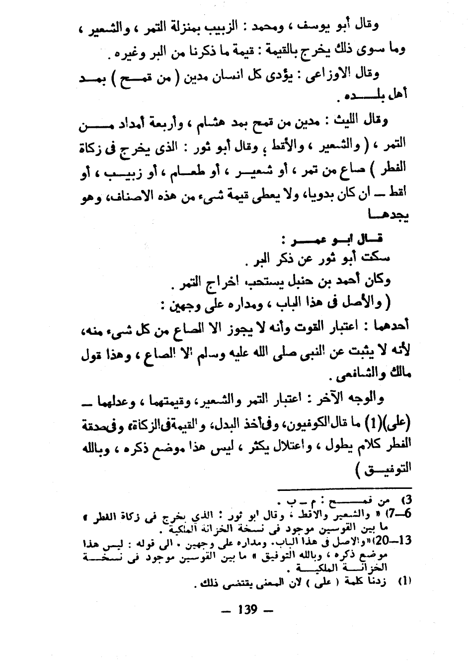 وَقَالَ أَبُو يُوسُفَ وَمُحَمَّدٌ الزَّبِيبُ بِمَنْزِلَةِ التَّمْرِ وَالشَّعِيرِ وَمَا سِوَى ذَلِكَ يَخْرُجُ بِالْقِيمَةِ قِيمَةُ مَا ذَكَرْنَا مِنَ الْبُرِّ وَغَيْرِهِ وَقَالَ الْأَوْزَاعِيُّ يُؤَدِّي كُلُّ إِنْسَانٍ مُدَّيْنِ (مِنْ قَمْحٍ) بِمَدِّ أَهْلِ بَلَدِهِ وَقَالَ اللَّيْثُ مُدَّيْنِ مِنْ قَمْحٍ بِمُدِّ هِشَامٍ وَأَرْبَعَةَ أَمْدَادٍ مِنَ التَّمْرِ (وَالشَّعِيرِ وَالْأَقِطِ وَقَالَ أَبُو ثَوْرٍ الَّذِي يُخْرِجُ فِي زكاة الفطر) صاع مِنْ تَمْرٍ أَوْ شَعِيرٍ أَوْ طَعَامٍ أَوْ زَبِيبٍ أَوْ أَقِطٍ إِنْ كَانَ بَدَوِيًّا وَلَا يُعْطَى قِيمَةَ شَيْءٍ مِنْ هَذِهِ الْأَصْنَافِ وَهُوَ يَجِدُهَا قَالَ أَبُو عُمَرَ سَكَتَ أَبُو ثَوْرٍ عَنْ ذِكْرِ الْبُرِّ وَكَانَ أَحْمَدُ بْنُ حَنْبَلٍ يَسْتَحِبُّ إِخْرَاجَ التَّمْرِ (وَالْأَصْلُ فِي هَذَا الْبَابِ وَمَدَارُهُ عَلَى وَجْهَيْنِ أَحَدُهُمَا اعْتِبَارُ الْقُوتِ وَأَنَّهُ لَا يَجُوزُ إِلَّا الصَّاعُ مِنْ كُلِّ شَيْءٍ مِنْهُ لِأَنَّهُ لَا يَثْبُتُ عَنِ النَّبِيِّ صَلَّى اللَّهُ عَلَيْهِ وَسَلَّمَ إِلَّا الصَّاعُ وَهَذَا قَوْلُ مَالِكٍ وَالشَّافِعِيِّ وَالْوَجْهُ الْآخَرُ اعْتِبَارُ التَّمْرِ وَالشَّعِيرِ وَقِيمَتِهِمَا وَعِدْلِهِمَا (عَلَى) مَا قَالَ الْكُوفِيُّونَ وَفِي أَخْذِ الْبَدَلِ وَالْقِيمَةِ فِي الزَّكَاةِ وَفِي صَدَقَةِ الْفِطْرِ كَلَامٌ يَطُولُ وَاعْتِلَالٌ يَكْثُرُ لَيْسَ هَذَا مَوْضِعَ ذِكْرِهِ وَبِاللَّهِ التَّوْفِيقُ)