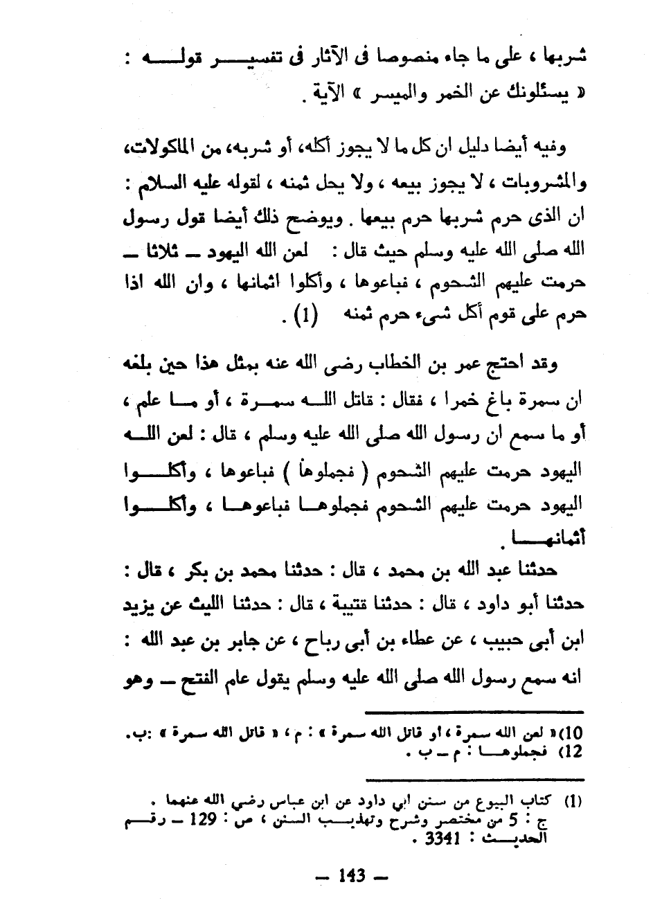 شُرْبِهَا عَلَى مَا جَاءَ مَنْصُوصًا فِي الْآثَارِ في تفسير قوله يسئلونك عَنِ الْخَمْرِ وَالْمَيْسِرِ الْآيَةَ وَفِيهِ أَيْضًا دَلِيلٌ أَنَّ كُلَّ مَا لَا يَجُوزُ أَكْلُهُ أَوْ شُرْبُهُ مِنَ الْمَأْكُولَاتِ وَالْمَشْرُوبَاتِ لَا يَجُوزُ بَيْعُهُ وَلَا يَحِلُّ ثَمَنُهُ لِقَوْلِهِ عَلَيْهِ السَّلَامُ إِنَّ الَّذِي حَرَّمَ شُرْبَهَا حَرَّمَ بَيْعَهَا وَيُوَضِّحُ ذَلِكَ أَيْضًا قَوْلُ رَسُولِ اللَّهِ صَلَّى اللَّهُ عَلَيْهِ وَسَلَّمَ حَيْثُ قَالَ لَعَنَ اللَّهُ الْيَهُودَ ثَلَاثًا حُرِّمَتْ عَلَيْهِمُ الشُّحُومُ فَبَاعُوهَا وَأَكَلُوا أَثْمَانَهَا وَإِنَّ اللَّهَ إِذَا حَرَّمَ عَلَى قَوْمٍ أَكْلَ شَيْءٍ حَرَّمَ ثَمَنَهُ وَقَدِ احْتَجَّ عُمَرُ بْنُ الْخَطَّابِ رَضِيَ اللَّهُ عَنْهُ بِمِثْلِ هَذَا حِينَ بَلَغَهُ أَنَّ سَمُرَةَ بَاعَ خَمْرًا فَقَالَ قَاتَلَ اللَّهُ سَمُرَةَ أَوْ مَا عَلِمَ أَوْ مَا سَمِعَ أَنَّ رَسُولَ اللَّهِ صَلَّى اللَّهُ عَلَيْهِ وَسَلَّمَ قَالَ لَعَنَ اللَّهُ الْيَهُودَ حُرِّمَتْ عَلَيْهِمُ الشُّحُومُ (فَجَمَّلُوهَا) فَبَاعُوهَا وَأَكَلُوا أَثْمَانَهَا حَدَّثَنَا عَبْدُ اللَّهِ بْنُ مُحَمَّدٍ قَالَ حَدَّثَنَا مُحَمَّدُ بْنُ بَكْرٍ قَالَ حَدَّثَنَا أَبُو دَاوُدَ قَالَ حَدَّثَنَا قُتَيْبَةُ قَالَ حَدَّثَنَا اللَّيْثُ عَنْ يزيد ابن أَبِي حَبِيبٍ عَنْ عَطَاءِ بْنِ أَبِي رَبَاحٍ عَنْ جَابِرِ بْنِ عَبْدِ اللَّهِ أَنَّهُ سَمِعَ رَسُولَ اللَّهِ صَلَّى اللَّهُ عَلَيْهِ وسلم يقول عَامَ الْفَتْحِ وَهُوَ