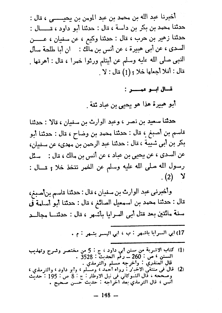 أَخْبَرَنَا عَبْدُ اللَّهِ بْنُ مُحَمَّدِ بْنِ عَبْدِ الْمُؤْمِنِ بْنِ يَحْيَى قَالَ حَدَّثَنَا مُحَمَّدُ بْنُ بَكْرِ بْنِ دَاسَةَ قَالَ حَدَّثَنَا أَبُو دَاوُدَ قَالَ حَدَّثَنَا زُهَيْرُ بْنُ حَرْبٍ قَالَ حَدَّثَنَا وَكِيعٌ عَنْ سُفْيَانَ عَنِ السُّدِّيِّ عَنْ أَبِي هُبَيْرَةَ عَنْ أَنَسِ بْنِ مَالِكٍ أَنَّ أَبَا طَلْحَةَ سَأَلَ النَّبِيَّ صَلَّى اللَّهُ عَلَيْهِ وَسَلَّمَ عَنْ أَيْتَامٍ وَرِثُوا خَمْرًا قَالَ أَهْرِقْهَا قَالَ أَفَلَا أَجْعَلُهَا خَلًّا قَالَ لَا قَالَ أَبُو عُمَرَ أَبُو هُبَيْرَةَ هَذَا هُوَ يَحْيَى بْنُ عَبَّادٍ ثِقَةٌ حَدَّثَنَا سَعِيدُ بْنُ نَصْرٍ وَعَبْدُ الْوَارِثِ بْنُ سُفْيَانَ قَالَا حَدَّثَنَا قَاسِمُ بْنُ أَصْبَغَ قَالَ حَدَّثَنَا مُحَمَّدُ بْنُ وَضَّاحٍ قَالَ حَدَّثَنَا أَبُو بَكْرِ بْنُ أَبِي شَيْبَةَ قَالَ حَدَّثَنَا عَبْدُ الرَّحْمَنِ بْنُ مَهْدِيٍّ عَنْ سُفْيَانَ عَنِ السُّدِّيِّ عَنْ يَحْيَى بْنُ عَبَّادٍ عَنْ أَنَسِ بْنِ مَالِكٍ قَالَ سُئِلَ رَسُولُ اللَّهِ صَلَّى اللَّهُ عَلَيْهِ وَسَلَّمَ عَنِ الْخَمْرِ تُتَّخَذُ خَلًّا قَالَ لَا وَأَخْبَرَنِي عَبْدُ الْوَارِثِ بْنُ سفيان قال حدثنا قاسم بن أصبغ قال حدثنا محمد بن إسمعيل الصَّائِغُ قَالَ حَدَّثَنَا أَبُو أُسَامَةَ فِي سَنَةِ مِائَتَيْنِ بَعْدَ قَتْلِ أَبِي السَّرَايَا بِأَشْهُرٍ قَالَ حدثنا مجالد