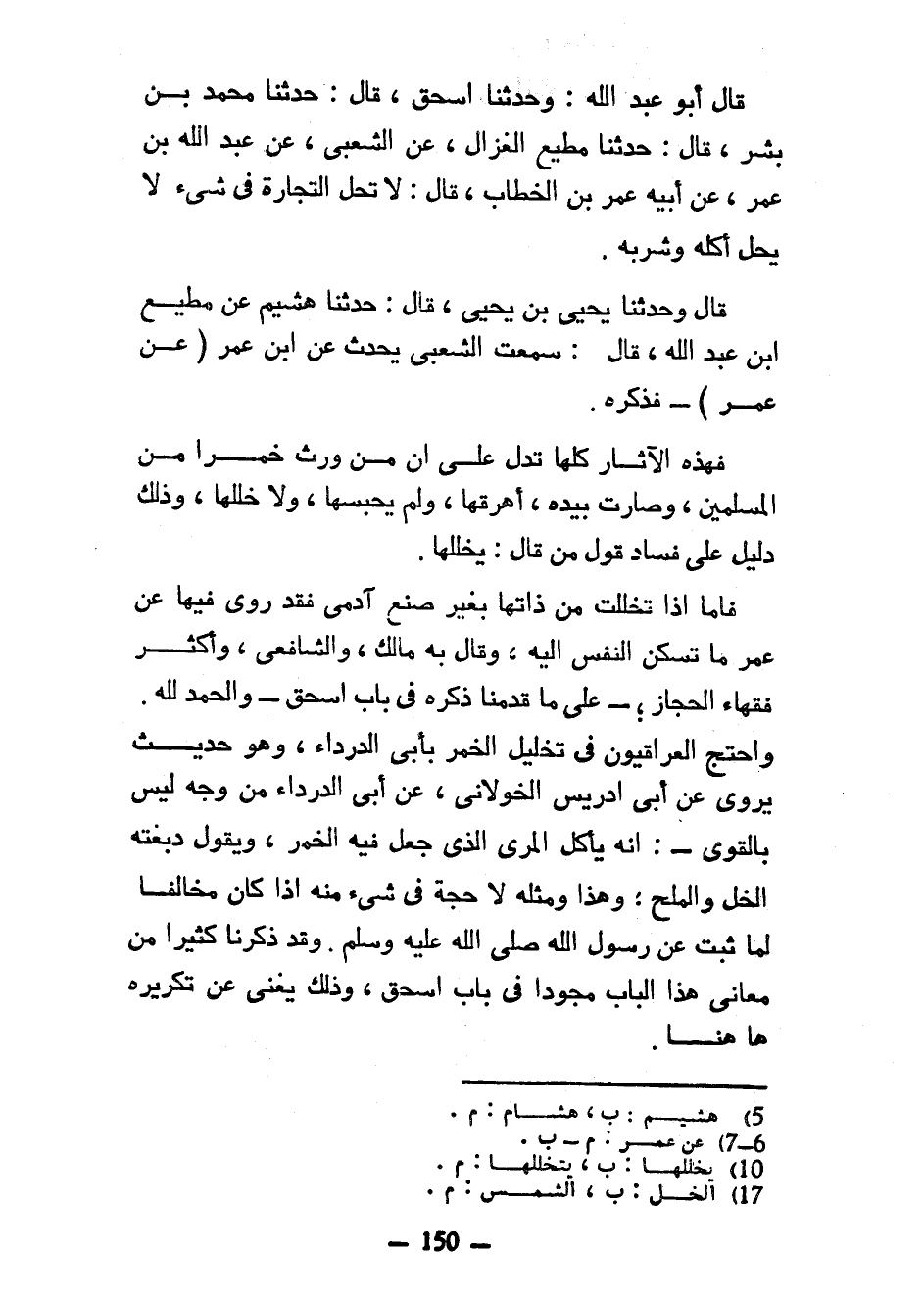 قَالَ أَبُو عَبْدِ اللَّهِ وَحَدَّثَنَا إِسْحَاقٌ قَالَ حَدَّثَنَا مُحَمَّدُ بْنُ بِشْرٍ قَالَ حَدَّثَنَا مُطِيعٌ الْغَزَّالُ عَنِ الشَّعْبِيِّ عَنْ عَبْدِ اللَّهِ بْنِ عُمَرَ عَنْ أَبِيهِ عُمَرَ بْنِ الْخَطَّابِ قَالَ لَا تَحِلُّ التِّجَارَةُ فِي شَيْءٍ لَا يَحِلُّ أَكْلُهُ وَشُرْبُهُ قَالَ وَحَدَّثَنَا يَحْيَى بْنُ يَحْيَى قال حدثنا هشيم عن مطيع ابن عَبْدِ اللَّهِ قَالَ سَمِعْتُ الشَّعْبِيَّ يُحَدِّثُ عَنِ ابْنِ عُمَرَ (عَنْ عُمَرَ) فَذَكَرَهُ فَهَذِهِ الْآثَارُ كُلُّهَا تَدُلُّ عَلَى أَنَّ مَنْ وَرِثَ خَمْرًا مِنَ الْمُسْلِمِينَ وَصَارَتْ بِيَدِهِ أَهْرَقَهَا وَلَمْ يَحْبِسْهَا وَلَا خَلَّلَهَا وَذَلِكَ دَلِيلٌ عَلَى فَسَادِ قَوْلِ مَنْ قَالَ يُخَلِّلُهَا فَأَمَّا إِذَا تَخَلَّلَتْ مِنْ ذَاتِهَا بِغَيْرِ صُنْعٍ آدَمِيٍّ فَقَدْ رُوِيَ فِيهَا عَنْ عُمَرَ مَا تَسْكُنُ النَّفْسُ إِلَيْهِ وَقَالَ بِهِ مَالِكٌ وَالشَّافِعِيُّ وَأَكْثَرُ فُقَهَاءِ الْحِجَازِ عَلَى ما قدمنا ذكره في باب إسحق وَالْحَمْدُ لِلَّهِ وَاحْتَجَّ الْعِرَاقِيُّونَ فِي تَخْلِيلِ الْخَمْرِ بِأَبِي الدَّرْدَاءِ وَهُوَ حَدِيثٌ يُرْوَى عَنْ أَبِي إِدْرِيسَ الْخَوْلَانِيِّ عَنْ أَبِي الدَّرْدَاءِ مِنْ وَجْهٍ لَيْسَ بِالْقَوِيِّ أَنَّهُ يُأْكَلُ الْمَرِيُ الَّذِي جُعِلَ فِيهِ الْخَمْرُ وَيَقُولُ دَبَغَتْهُ الْخَلُّ وَالْمِلْحُ وَهَذَا وَمِثْلُهُ لَا حُجَّةَ فِي شَيْءٍ مِنْهُ إِذَا كَانَ مُخَالِفًا لِمَا ثَبَتَ عَنْ رَسُولِ اللَّهِ صَلَّى اللَّهُ عَلَيْهِ وَسَلَّمَ وَقَدْ ذَكَرْنَا كَثِيرًا مِنْ مَعَانِي هَذَا الْبَابِ مُجَوَّدًا فِي بَابِ إسحق وذلك يغني عن تكريره ها هنا