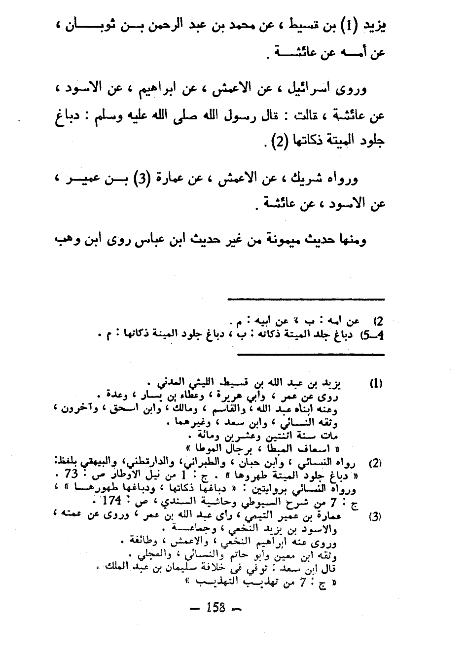 يَزِيدَ بْنِ قُسَيْطٍ عَنْ مُحَمَّدِ بْنِ عَبْدِ الرَّحْمَنِ بْنِ ثَوْبَانَ عَنْ أُمِّهِ عَنْ عَائِشَةَ وَرَوَى إِسْرَائِيلُ عَنِ الْأَعْمَشِ عَنْ إِبْرَاهِيمَ عَنِ الْأَسْوَدِ عَنْ عَائِشَةَ قَالَتْ قَالَ رَسُولُ اللَّهِ صَلَّى اللَّهُ عَلَيْهِ وَسَلَّمَ دِبَاغُ جُلُودِ الْمَيْتَةِ ذَكَاتُهَا وَرَوَاهُ شَرِيكٌ عَنِ الْأَعْمَشِ عَنْ عُمَارَةَ بْنِ عُمَيْرٍ عَنِ الْأَسْوَدِ عَنْ عَائِشَةَ وَمِنْهَا حَدِيثُ مَيْمُونَةَ مِنْ غَيْرِ حَدِيثِ ابْنِ عَبَّاسٍ رَوَى ابْنُ وَهْبٍ