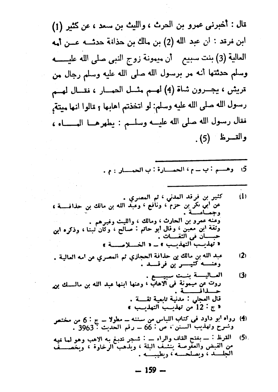 قَالَ أَخْبَرَنِي عَمْرُو بْنُ الْحَرْثِ وَاللَّيْثُ بْنُ سعد عن كثير ابن فَرَقَدٍ أَنَّ عَبْدَ اللَّهِ بْنَ مَالِكِ بْنِ حُذَافَةَ حَدَّثَهُ عَنْ أُمِّهِ الْعَالِيَةِ بِنْتِ سُبَيْعٍ أَنَّ مَيْمُونَةَ زَوْجِ النَّبِيِّ صَلَّى اللَّهُ عَلَيْهِ وَسَلَّمَ حَدَّثَتْهَا أَنَّهُ مَرَّ بِرَسُولِ اللَّهِ صَلَّى اللَّهُ عَلَيْهِ وَسَلَّمَ رِجَالٌ مِنْ قُرَيْشٍ يَجُرُّونَ شَاةً لَهُمْ مِثْلَ الْحِمَارِ فَقَالَ لَهُمْ رَسُولُ اللَّهِ صَلَّى اللَّهُ عَلَيْهِ وَسَلَّمَ لَوِ اتَّخَذْتُمْ إِهَابَهَا قَالُوا إِنَّهَا مَيِّتَةٌ فَقَالَ رَسُولُ اللَّهِ صَلَّى اللَّهُ عَلَيْهِ وَسَلَّمَ يُطَهِّرُهَا الْمَاءُ وَالْقَرَظُ