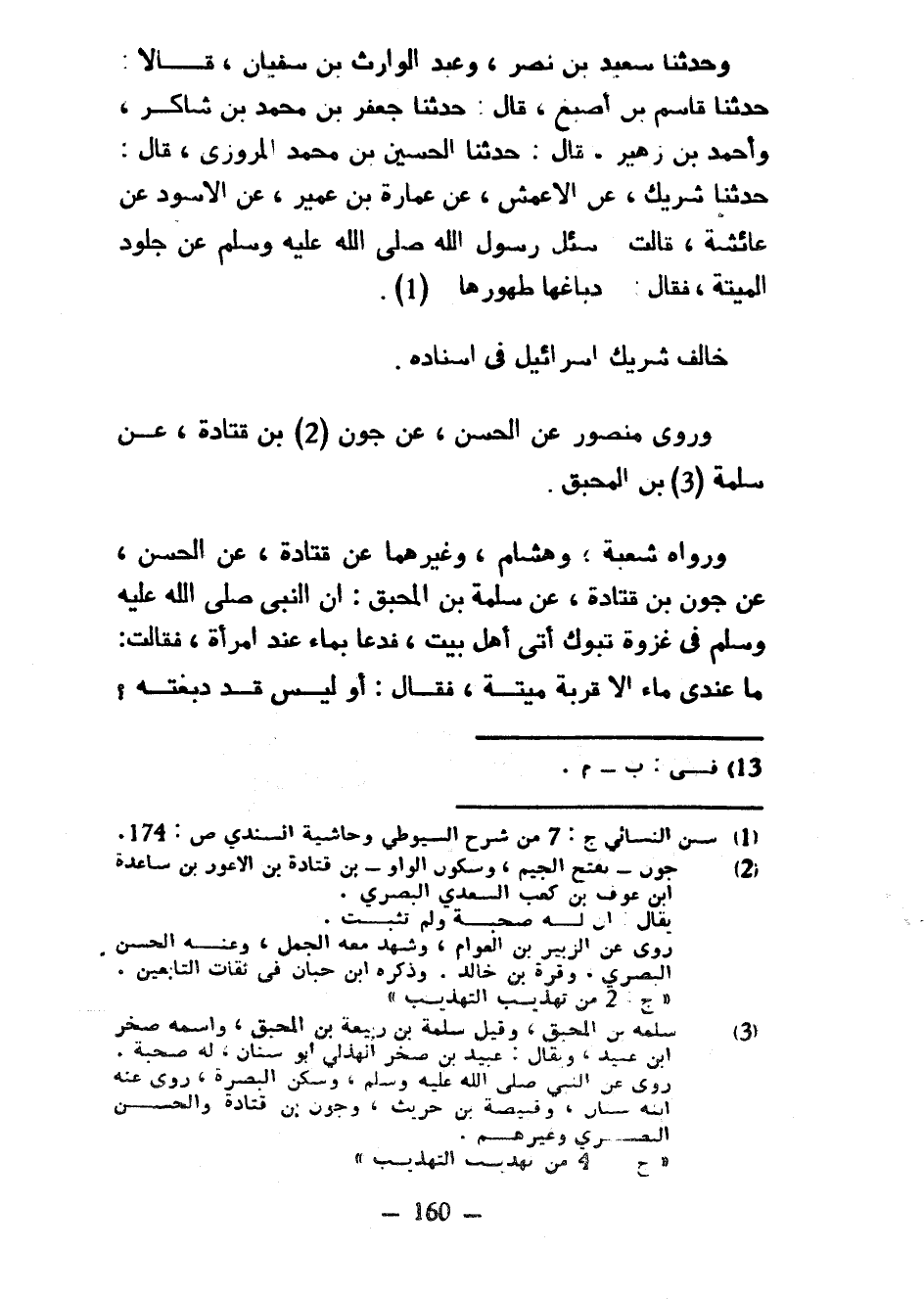 وَحَدَّثَنَا سَعِيدُ بْنُ نَصْرٍ وَعَبْدُ الْوَارِثِ بْنُ سُفْيَانَ قَالَا حَدَّثَنَا قَاسِمُ بْنُ أَصْبَغَ قَالَ حَدَّثَنَا جَعْفَرُ بْنُ مُحَمَّدِ بْنِ شَاكِرٍ وَأَحْمَدُ بْنُ زُهَيْرٍ قَالَ حَدَّثَنَا الْحُسَيْنُ بْنُ مُحَمَّدٍ الْمَرْوَزِيُّ قَالَ حَدَّثَنَا شَرِيكٌ عَنِ الْأَعْمَشِ عَنْ عَمَّارِ بْنِ عُمَيْرٍ عَنِ الْأَسْوَدِ عَنْ عَائِشَةَ قَالَتْ سُئِلَ رَسُولُ اللَّهِ صَلَّى اللَّهُ عَلَيْهِ وَسَلَّمَ عَنْ جُلُودِ الْمَيْتَةِ فَقَالَ دِبَاغُهَا طَهُورُهَا خالفا شَرِيكٌ إِسْرَائِيلَ فِي إِسْنَادِهِ وَرَوَى مَنْصُورٌ عَنِ الْحَسَنِ عَنْ جَوْنِ بْنِ قَتَادَةَ عَنْ سَلَمَةَ بْنِ الْمُحَبَّقِ وَرَوَاهُ شُعْبَةُ وَهِشَامٌ وَغَيْرُهُمَا عَنْ قَتَادَةَ عَنِ الْحَسَنِ عَنْ جَوْنِ بْنِ قَتَادَةَ عَنْ سَلَمَةَ بْنِ الْمُحَبَّقِ أَنَّ النَّبِيَّ صَلَّى اللَّهُ عَلَيْهِ وَسَلَّمَ فِي غَزْوَةِ تَبُوكَ أَتَى أَهْلَ بَيْتٍ فَدَعَا بِمَاءٍ عِنْدَ امْرَأَةٍ فَقَالَتْ مَا عِنْدِي مَاءٌ إِلَّا قِرْبَةُ مَيْتَةٍ فَقَالَ أَوْ لَيْسَ قَدْ دَبَغْتِهِ
