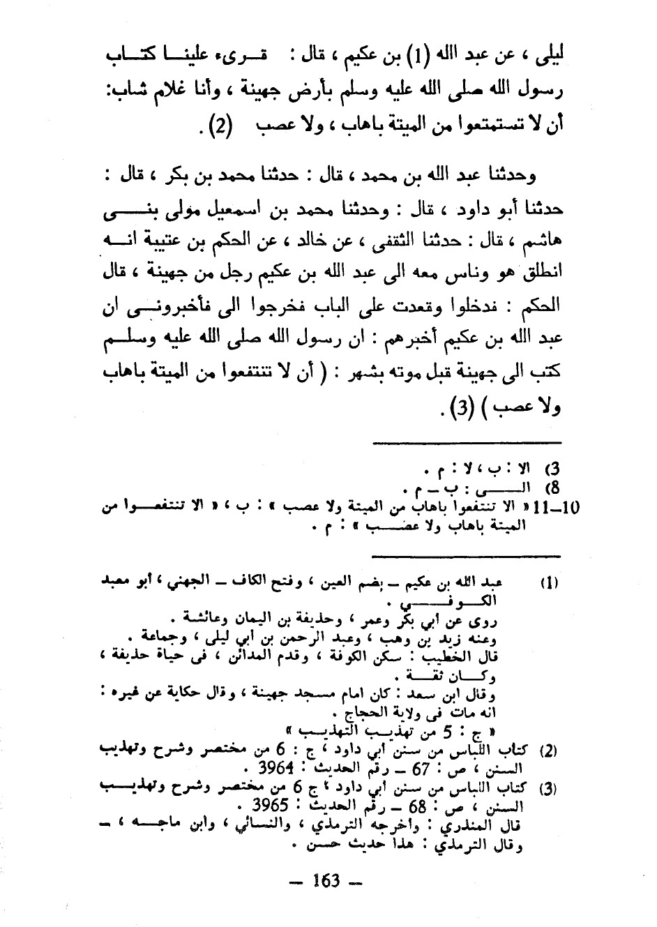 لَيْلَى عَنْ عَبْدِ اللَّهِ بْنِ عُكَيْمٍ قَالَ قرىء عَلَيْنَا كِتَابُ رَسُولِ اللَّهِ صَلَّى اللَّهُ عَلَيْهِ وَسَلَّمَ بِأَرْضِ جُهَيْنَةَ وَأَنَا غُلَامٌ شَابٌّ أَنْ لَا تَسْتَمْتِعُوا مِنَ الْمَيْتَةِ بِإِهَابٍ وَلَا عَصَبٍ وَحَدَّثَنَا عَبْدُ اللَّهِ بْنُ مُحَمَّدٍ قَالَ حَدَّثَنَا مُحَمَّدُ بْنُ بَكْرٍ قَالَ حَدَّثَنَا أَبُو دَاوُدَ قال وحدثنا محمد بن إسمعيل مَوْلَى بَنِي هَاشِمٍ قَالَ حَدَّثَنَا الثَّقَفِيُّ عَنْ خَالِدٍ عَنِ الْحَكَمِ بْنِ عُتَيْبَةَ أَنَّهُ انْطَلَقَ هُوَ وَنَاسٌ مَعَهُ إِلَى عَبْدِ اللَّهِ بْنِ عُكَيْمٍ رَجُلٌ مِنْ جُهَيْنَةَ قَالَ الْحَكَمُ فَدَخَلُوا وَقَعَدْتُ عَلَى الْبَابِ فَخَرَجُوا إِلَيَّ فَأَخْبَرُونِي أَنَّ عَبْدَ اللَّهِ بْنَ عُكَيْمٍ أَخْبَرَهُمْ إِنَّ رَسُولَ اللَّهِ صَلَّى اللَّهُ عَلَيْهِ وَسَلَّمَ كَتَبَ إِلَى جُهَيْنَةَ قَبْلَ مَوْتِهِ بِشَهْرٍ (أَنْ لَا تَنْتَفِعُوا مِنَ الْمَيْتَةِ بِإِهَابٍ وَلَا عَصَبٍ)