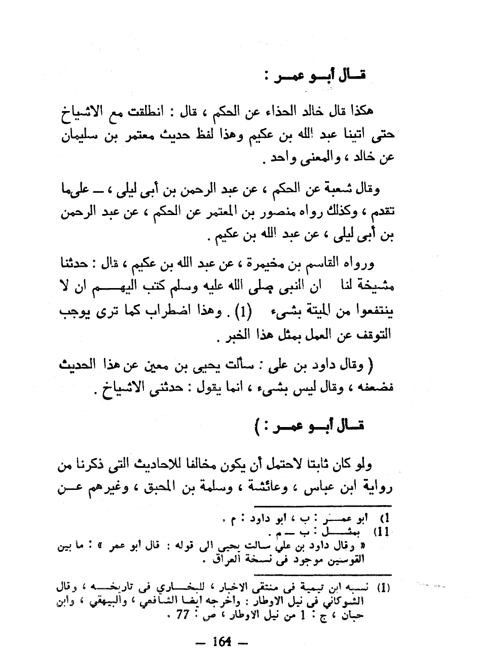 قَالَ أَبُو عُمَرَ هَكَذَا قَالَ خَالِدٌ الْحَذَّاءُ عَنِ الْحَكَمِ قَالَ انْطَلَقْتُ مَعَ الْأَشْيَاخِ حَتَّى أَتَيْنَا عَبْدَ اللَّهِ بْنَ عُكَيْمٍ وَهَذَا لَفْظُ حَدِيثِ مُعْتَمِرِ بْنِ سُلَيْمَانَ عَنْ خَالِدٍ وَالْمَعْنَى وَاحِدٌ وَقَالَ شُعْبَةُ عَنِ الْحَكَمِ عَنْ عَبْدِ الرَّحْمَنِ بْنِ أَبِي لَيْلَى عَلَى مَا تَقَدَّمَ وكذلك وراه مَنْصُورُ بْنُ الْمُعْتَمِرِ عَنِ الْحَكَمِ عَنْ عَبْدِ الرَّحْمَنِ بْنِ أَبِي لَيْلَى عَنْ عَبْدِ اللَّهِ بْنِ عُكَيْمٍ وَرَوَاهُ الْقَاسِمُ بْنُ مُخَيْمِرَةَ عَنْ عَبْدِ اللَّهِ بْنِ عُكَيْمٍ قَالَ حَدَّثَنَا مَشْيَخَةٌ لَنَا أَنَّ النَّبِيَّ صَلَّى اللَّهُ عَلَيْهِ وَسَلَّمَ كَتَبَ إِلَيْهِمْ أَنْ لَا يَنْتَفِعُوا مِنَ الْمَيْتَةِ بِشَيْءٍ وَهَذَا اضْطِرَابٌ كَمَا تَرَى يُوجِبُ التَّوَقُّفَ عَنِ الْعَمَلِ بِمِثْلِ هَذَا الْخَبَرِ (وَقَالَ دَاوُدُ بْنُ عَلِيٍّ سَأَلْتُ يَحْيَى بْنَ مَعِينٍ عَنْ هَذَا الْحَدِيثِ فَضَعَّفَهُ وَقَالَ لَيْسَ بشَيءٍ إِنَّمَا يَقُولُ حَدَّثَنِي الْأَشْيَاخُ قَالَ أَبُو عُمَرَ) وَلَوْ كان ثابتا لَاحْتَمَلَ أَنْ يَكُونَ مُخَالِفًا لِلْأَحَادِيثِ الَّتِي ذَكَرْنَا مِنْ رِوَايَةِ ابْنِ عَبَّاسٍ وَعَائِشَةَ وَسَلَمَةَ بْنِ الْمُحَبَّقِ وَغَيْرِهِمْ عَنِ