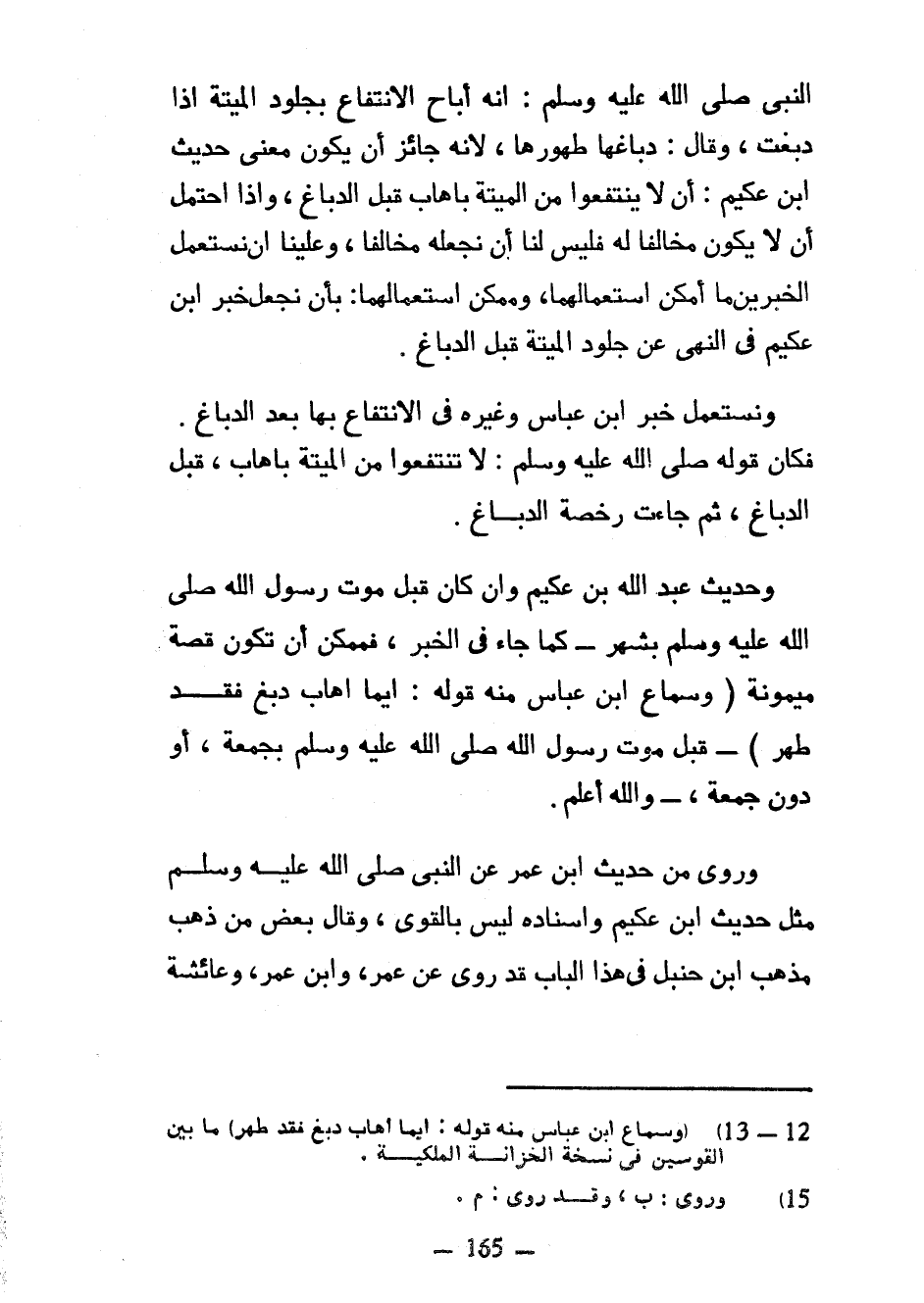 النَّبِيِّ صَلَّى اللَّهُ عَلَيْهِ وَسَلَّمَ أَنَّهُ أَبَاحَ الِانْتِفَاعَ بِجُلُودِ الْمَيْتَةِ إِذَا دُبِغَتْ وَقَالَ دِبَاغُهَا طَهُورُهَا لِأَنَّهُ جَائِزٌ أَنْ يَكُونَ مَعْنَى حَدِيثِ ابْنِ عُكَيْمٍ أَنْ لَا يَنْتَفِعُوا مِنَ الْمَيْتَةِ باهاب قبل الدباغ وإذا حتمل أَنْ لَا يَكُونَ مُخَالِفًا لَهُ فَلَيْسَ لَنَا أَنْ نَجْعَلَهُ مُخَالِفًا وَعَلَيْنَا أَنْ نَسْتَعْمِلَ الْخَبَرَيْنِ مَا أَمْكَنَ اسْتِعْمَالُهُمَا وَمُمْكِنٌ اسْتِعْمَالُهُمَا بِأَنْ نَجْعَلَ خَبَرَ ابْنِ عُكَيْمٍ فِي النَّهْيِ عَنْ جُلُودِ الْمَيْتَةِ قَبْلَ الدِّبَاغِ وَنَسْتَعْمِلُ خَبَرَ ابْنِ عَبَّاسٍ وغيره في الانتفاع بها بعدالدباغ فَكَانَ قَوْلُهُ صَلَّى اللَّهُ عَلَيْهِ وَسَلَّمَ لَا تَنْتَفِعُوا مِنَ الْمَيْتَةِ بِإِهَابٍ قَبْلَ الدِّبَاغِ ثُمَّ جَاءَتْ رُخْصَةُ الدِّبَاغِ وَحَدِيثُ عَبْدِ اللَّهِ بْنُ عُكَيْمٍ وَإِنْ كَانَ قَبْلَ مَوْتِ رَسُولِ اللَّهِ صَلَّى اللَّهُ عَلَيْهِ وَسَلَّمَ بِشَهْرٍ كَمَا جَاءَ فِي الْخَبَرِ فَمُمْكِنٌ أَنْ تَكُونَ قِصَّةُ مَيْمُونَةَ (وَسَمَاعُ ابْنِ عَبَّاسٍ مِنْهُ قَوْلَهُ أَيُّمَا إِهَابٍ قَدْ دُبِغَ فَقَدْ طَهُرَ) قَبْلَ مَوْتِ رَسُولِ اللَّهِ صَلَّى اللَّهُ عَلَيْهِ وَسَلَّمَ بِجُمُعَةٍ أَوْ دون جمعة والله أعلم وروى من حديثا بْنِ عُمَرَ عَنِ النَّبِيِّ صَلَّى اللَّهُ عَلَيْهِ وَسَلَّمَ مِثْلُ حَدِيثِ ابْنِ عُكَيْمٍ وَإِسْنَادُهُ لَيْسَ بِالْقَوِيِّ وَقَالَ بَعْضُ مَنْ ذَهَبَ مَذْهَبَ ابْنِ حَنْبَلٍ فِي هَذَا الْبَابِ قَدْ رُوِيَ عَنْ عُمَرَ وَابْنِ عُمَرَ وَعَائِشَةَ