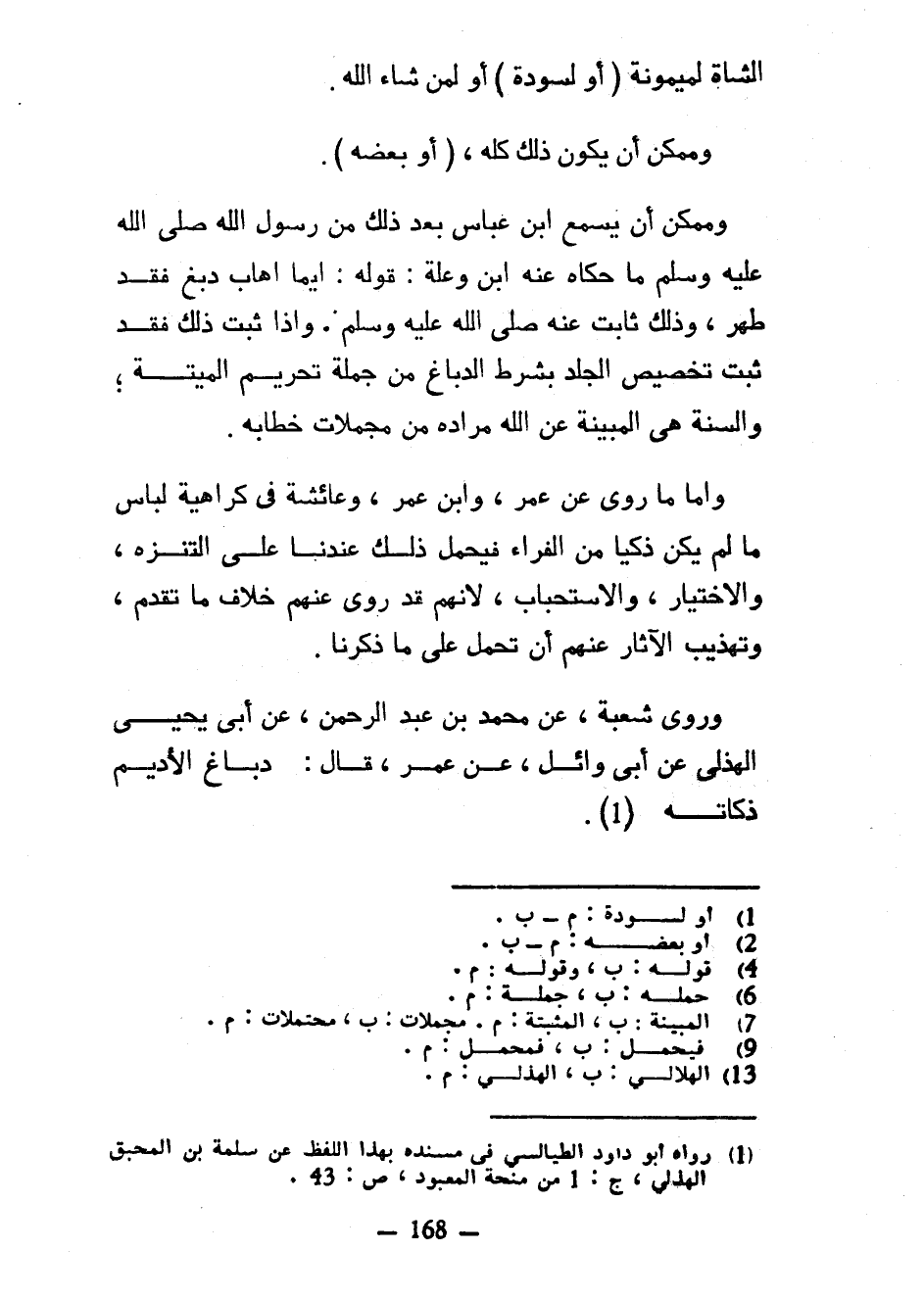الشَّاةُ لِمَيْمُونَةَ (أَوْ لِسَوْدَةَ) أَوْ لِمَنْ شَاءَ اللَّهُ وَمُمْكِنٌ أَنْ يَكُونَ ذَلِكَ كُلُّهُ (أَوْ بَعْضُهُ) وَمُمْكِنٌ أَنْ يَسْمَعَ ابْنُ عَبَّاسٍ بَعْدَ ذَلِكَ مِنْ رَسُولِ اللَّهِ صَلَّى اللَّهُ عَلَيْهِ وَسَلَّمَ مَا حَكَاهُ عَنْهُ ابْنُ وَعْلَةَ قَوْلُهُ أَيُّمَا إِهَابٍ دُبِغَ فَقَدْ طَهُرَ وَذَلِكَ ثَابِتٌ عَنْهُ صَلَّى اللَّهُ عَلَيْهِ وَسَلَّمَ وَإِذَا ثَبَتَ ذَلِكَ فَقَدْ ثَبَتَ تَخْصِيصُ الْجِلْدِ بِشَرْطِ الدِّبَاغِ مِنْ جُمْلَةِ تَحْرِيمِ الْمَيْتَةِ وَالسُّنَّةُ هِيَ الْمُبَيِّنَةُ عَنِ اللَّهِ مُرَادَهُ مِنْ مُجْمَلَاتِ خِطَابِهِ وَأَمَّا مَا رُوِيَ عَنْ عُمَرَ وَابْنِ عُمَرَ وَعَائِشَةَ فِي كَرَاهِيَةِ لِبَاسِ مَا لَمْ يَكُنْ ذَكِيًّا مِنَ الْفِرَاءِ فَيُحْمَلُ ذَلِكَ عِنْدَنَا عَلَى التَّنَزُّهِ وَالِاخْتِيَارِ وَالِاسْتِحْبَابِ لِأَنَّهُمْ قَدْ رُوِيَ عَنْهُمْ خِلَافُ مَا تَقَدَّمَ وَتَهْذِيبُ الْآثَارِ عَنْهُمْ أَنْ تُحْمَلَ عَلَى مَا ذَكَرْنَا وَرَوَى شُعْبَةُ عَنْ مُحَمَّدِ بْنِ عَبْدِ الرَّحْمَنِ عَنْ أَبِي يَحْيَى الْهُذَلِيِّ عَنْ أَبِي وَائِلٍ عَنْ عُمَرَ قَالَ دِبَاغُ الأديم ذكاته