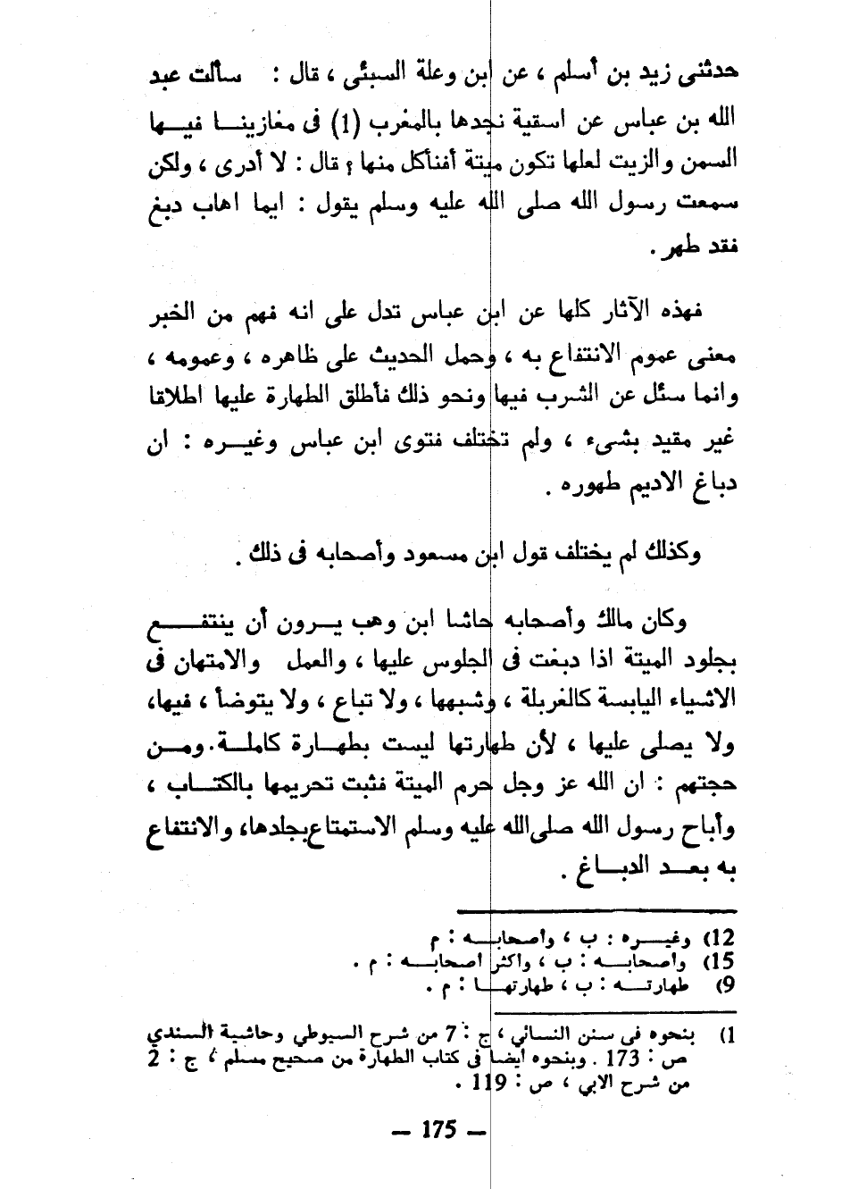 حَدَّثَنِي زَيْدُ بْنُ أَسْلَمَ عَنِ ابْنِ وَعْلَةَ السبئي قال سألت عبد الله بن عباس عَنْ أَسْقِيَةٍ نَجِدُهَا بِالْمَغْرِبِ فِي مَغَازِينَا فِيهَا السَّمْنُ وَالزَّيْتُ لَعَلَّهَا تَكُونُ مَيْتَةً أَفَنَأْكُلُ مِنْهَا قَالَ لَا أَدْرِي وَلَكِنْ سَمِعْتُ رَسُولَ اللَّهِ صَلَّى اللَّهُ عَلَيْهِ وَسَلَّمَ يَقُولُ أَيُّمَا إِهَابٍ دُبِغَ فَقَدْ طَهُرَ فَهَذِهِ الْآثَارُ كُلُّهَا عَنِ ابْنِ عَبَّاسٍ تَدُلُّ عَلَى أَنَّهُ فَهِمَ مِنَ الْخَبَرِ مَعْنَى عُمُومِ الِانْتِفَاعِ بِهِ وَحَمَلَ الْحَدِيثَ عَلَى ظَاهِرِهِ وَعُمُومِهِ وَإِنَّمَا سُئِلَ عَنِ الشُّرْبِ فِيهَا وَنَحْوِ ذَلِكَ فَأَطْلَقَ الطَّهَارَةَ عَلَيْهَا إِطْلَاقًا غَيْرَ مُقَيَّدٍ بِشَيْءٍ وَلَمْ تَخْتَلِفْ فَتْوَى ابْنِ عباس وغيره أن دباغ الاديم طهروه وَكَذَلِكَ لَمْ يَخْتَلِفْ قَوْلُ ابْنِ مَسْعُودٍ وَأَصْحَابِهِ فِي ذَلِكَ وَكَانَ مَالِكٌ وَأَصْحَابُهُ حَاشَا ابْنَ وَهْبٍ يَرَوْنَ أَنْ يُنْتَفَعَ بِجُلُودِ الْمَيْتَةِ إِذَا دُبِغَتْ فِي الْجُلُوسِ عَلَيْهَا وَالْعَمَلِ وَالِامْتِهَانِ فِي الْأَشْيَاءِ الْيَابِسَةِ كَالْغَرْبَلَةِ وَشِبْهِهَا وَلَا تُبَاعُ وَلَا يُتَوَضَّأُ فِيهَا وَلَا يُصَلَّى عَلَيْهَا لِأَنَّ طَهَارَتَهَا لَيْسَتْ بِطَهَارَةٍ كَامِلَةٍ وَمِنْ حُجَّتِهِمْ أَنَّ اللَّهَ عَزَّ وَجَلَّ حَرَّمَ الْمَيْتَةَ فَثَبَتَ تَحْرِيمُهَا بِالْكِتَابِ وَأَبَاحَ رَسُولُ اللَّهِ صَلَّى اللَّهُ عَلَيْهِ وَسَلَّمَ الِاسْتِمْتَاعَ بِجِلْدِهَا وَالِانْتِفَاعَ بِهِ بَعْدَ الدِّبَاغِ