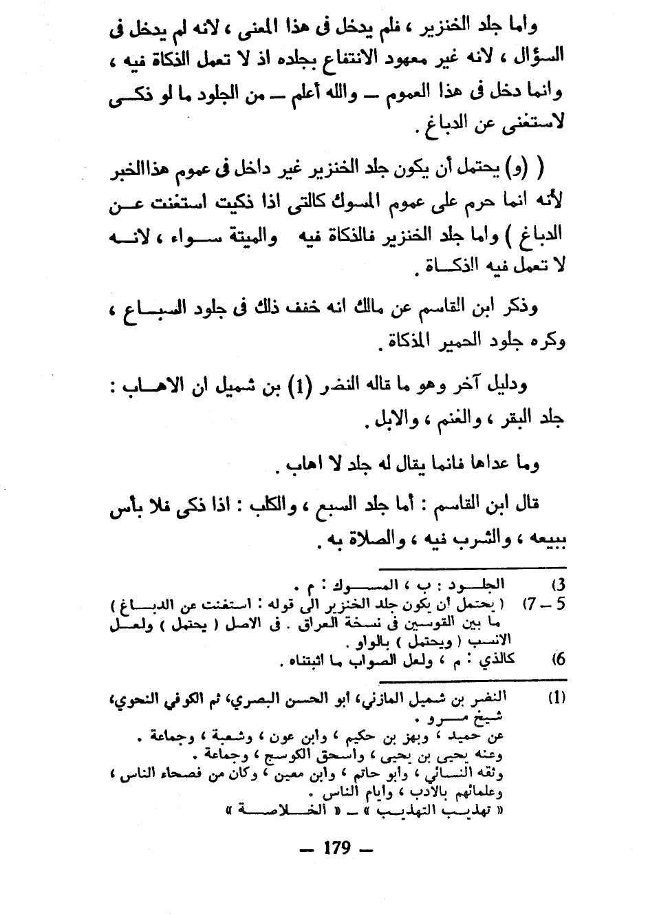 وَأَمَّا جِلْدُ الْخِنْزِيرِ فَلَمْ يَدْخُلْ فِي هَذَا الْمَعْنَى لِأَنَّهُ لَمْ يَدْخُلْ فِي السُّؤَالِ لِأَنَّهُ غَيْرُ مَعْهُودٍ الِانْتِفَاعُ بِجِلْدِهِ إِذْ لَا تَعْمَلُ الذَّكَاةُ فِيهِ وَإِنَّمَا دَخَلَ فِي هَذَا الْعُمُومِ وَاللَّهُ أَعْلَمُ مِنَ الْجُلُودِ مَا لَوْ ذُكِّيَ لأستغنى عن الدباغ يحتمل أَنْ يَكُونَ جِلْدُ الْخِنْزِيرِ غَيْرَ دَاخِلٍ فِي عُمُومِ هَذَا الْخَبَرِ لِأَنَّهُ إِنَّمَا حَرَّمَ عَلَى عُمُومِ الْمُسُوكِ كَالَّتِي إِذَا ذُكِّيَتِ اسْتَغْنَتْ عَنِ الدِّبَاغِ) وَأَمَّا جِلْدُ الْخِنْزِيرِ فَالذَّكَاةُ فِيهِ وَالْمَيْتَةُ سَوَاءٌ لِأَنَّهُ لَا تَعْمَلُ فِيهِ الذَّكَاةُ وَذَكَرَ ابْنُ الْقَاسِمِ عَنْ مَالِكٍ أَنَّهُ خَفَّفَ ذَلِكَ فِي جُلُودِ السِّبَاعِ وَكَرِهَ جُلُودَ الْحَمِيرِ الْمُذَكَّاةِ وَدَلِيلٌ آخَرُ وَهُوَ مَا قَالَهُ النَّضْرُ بْنُ شُمَيْلٍ أَنَّ الْإِهَابَ جِلْدُ الْبَقَرِ وَالْغَنَمِ وَالْإِبِلِ وَمَا عَدَاهَا فَإِنَّمَا يُقَالُ لَهُ جِلْدٌ لَا إِهَابَ قَالَ ابْنُ الْقَاسِمِ أَمَّا جِلْدُ السَّبُعِ وَالْكَلْبِ إِذَا ذُكِّيَ فَلَا بَأْسَ بِبَيْعِهِ وَالشُّرْبِ فِيهِ وَالصَّلَاةِ بِهِ