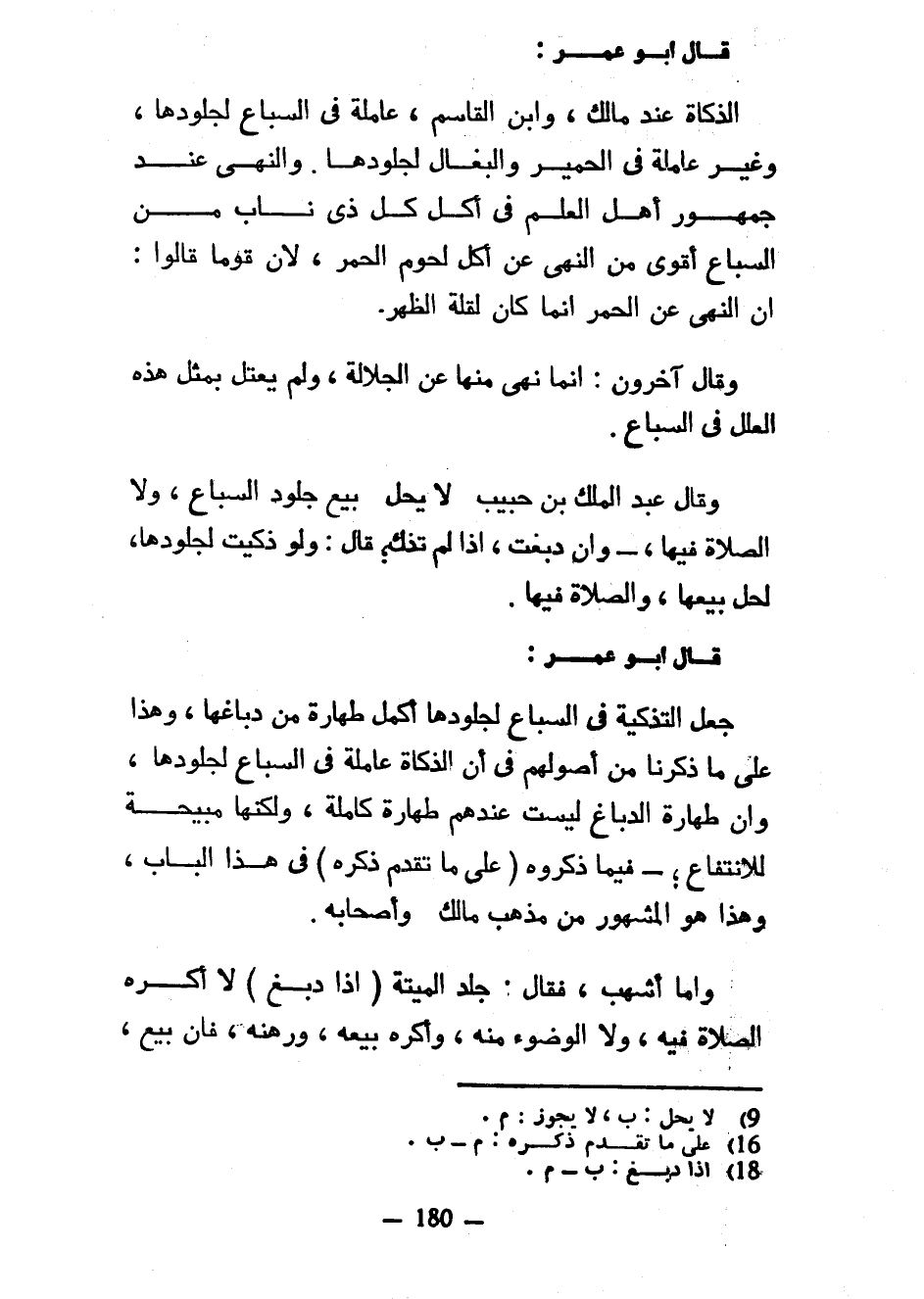 قَالَ أَبُو عُمَرَ الذَّكَاةُ عِنْدَ مَالِكٍ وَابْنِ الْقَاسِمِ عَامِلَةٌ فِي السِّبَاعِ لِجُلُودِهَا وَغَيْرُ عَامِلَةٍ فِي الْحَمِيرِ وَالْبِغَالِ لِجُلُودِهَا وَالنَّهْيُ عِنْدَ جُمْهُورِ أَهْلِ الْعِلْمِ فِي أَكْلِ كُلِّ ذِي نَابٍ مِنَ السِّبَاعِ أَقْوَى مِنَ النَّهْيِ عَنْ أَكْلِ لُحُومِ الْحُمُرِ لِأَنَّ قَوْمًا قَالُوا إِنَّ النَّهْيَ عَنِ الْحُمُرِ إِنَّمَا كَانَ لِقِلَّةِ الظَّهْرِ وَقَالَ آخَرُونَ إِنَّمَا نَهَى مِنْهَا عَنِ الْجَلَّالَةِ وَلَمْ يُعْتَلَّ بِمِثْلِ هَذِهِ الْعِلَلِ فِي السِّبَاعِ وَقَالَ عَبْدُ الْمَلِكِ بْنُ حَبِيبٍ لَا يَحِلُّ بَيْعُ جُلُودِ السِّبَاعِ وَلَا الصَّلَاةُ فِيهَا وَإِنْ دُبِغَتْ إِذَا لَمْ تُذَكَّ قَالَ وَلَوْ ذُكِّيَتْ لِجُلُودِهَا لَحَلَّ بَيْعُهَا وَالصَّلَاةُ فِيهَا قَالَ أَبُو عُمَرَ جَعَلَ التَّذْكِيَةَ فِي السِّبَاعِ لِجُلُودِهَا أَكْمَلَ طَهَارَةً مِنْ دِبَاغِهَا وَهَذَا عَلَى مَا ذَكَرْنَا مِنْ أُصُولِهِمْ فِي أَنَّ الذَّكَاةَ عَامِلَةٌ فِي السِّبَاعِ لِجُلُودِهَا وَأَنَّ طَهَارَةَ الدِّبَاغِ لَيْسَتْ عِنْدَهُمْ طَهَارَةً كَامِلَةً وَلَكِنَّهَا مُبِيحَةٌ لِلِانْتِفَاعِ فِيمَا ذَكَرُوهُ (عَلَى مَا تَقَدَّمَ ذِكْرُهُ) فِي هَذَا الْبَابِ وَهَذَا هُوَ الْمَشْهُورُ مِنْ مَذْهَبِ مَالِكٍ وَأَصْحَابِهِ وَأَمَّا أَشْهَبُ فَقَالَ جِلْدُ الْمَيْتَةِ (إِذَا دُبِغَ) لَا أَكْرَهُ الصَّلَاةَ فِيهِ وَلَا الْوُضُوءَ مِنْهُ وَأَكْرَهُ بَيْعَهُ وَرَهْنَهُ فإن بيع