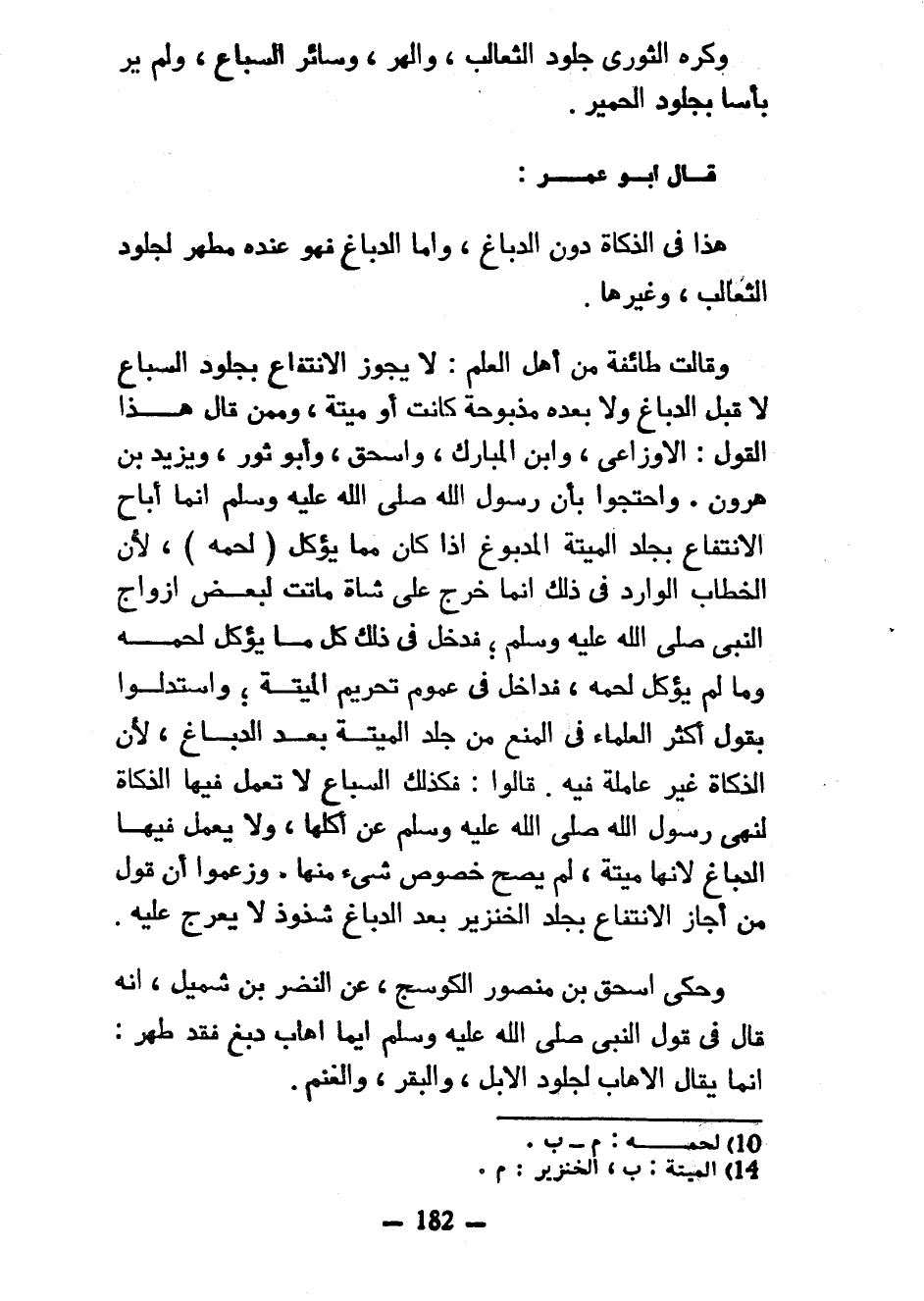 وَكَرِهَ الثَّوْرِيُّ جُلُودَ الثَّعَالِبِ وَالْهِرِّ وَسَائِرِ السِّبَاعِ وَلَمْ يَرَ بَأْسًا بِجُلُودِ الْحَمِيرِ قَالَ أَبُو عُمَرَ هَذَا فِي الذَّكَاةِ دُونَ الدِّبَاغِ وَأَمَّا الدباغ فهو عنده مطهر لجلود الثعالب وغيثرها وَقَالَتْ طَائِفَةٌ مِنْ أَهْلِ الْعِلْمِ لَا يَجُوزُ الِانْتِفَاعُ بِجُلُودِ السِّبَاعِ لَا قَبْلَ الدِّبَاغِ وَلَا بَعْدَهُ مَذْبُوحَةً كَانَتْ أَوْ مَيْتَةً وَمِمَّنْ قَالَ هذا القول الأوزاعي وابن المبارك وإسحق وأبو ثور ويزيد بن هرون وَاحْتَجُّوا بِأَنَّ رَسُولَ اللَّهِ صَلَّى اللَّهُ عَلَيْهِ وَسَلَّمَ إِنَّمَا أَبَاحَ الِانْتِفَاعَ بِجِلْدِ الْمَيْتَةِ الْمَدْبُوغِ إِذَا كَانَ مِمَّا يُؤْكَلُ (لَحْمُهُ) لِأَنَّ الْخِطَابَ الْوَارِدَ فِي ذَلِكَ إِنَّمَا خَرَجَ عَلَى شَاةٍ مَاتَتْ لِبَعْضِ أَزْوَاجِ النَّبِيِّ صَلَّى اللَّهُ عَلَيْهِ وَسَلَّمَ فَدَخَلَ فِي ذَلِكَ كُلُّ مَا يُؤْكَلُ لَحْمُهُ وَمَا لَمْ يُؤْكَلْ لَحْمُهُ فَدَاخِلٌ فِي عُمُومِ تَحْرِيمِ الْمَيْتَةِ وَاسْتَدَلُّوا بِقَوْلِ أَكْثَرِ الْعُلَمَاءِ فِي الْمَنْعِ مِنْ جِلْدِ الْمَيْتَةِ بَعْدَ الدِّبَاغِ لِأَنَّ الذَّكَاةَ غَيْرُ عَامِلَةٍ فِيهِ قَالُوا فَكَذَلِكَ السِّبَاعُ لَا تَعْمَلُ فِيهَا الذَّكَاةُ لِنَهْيِ رَسُولِ اللَّهِ صَلَّى اللَّهُ عَلَيْهِ وَسَلَّمَ عَنْ أَكْلِهَا وَلَا يَعْمَلُ فِيهَا الدِّبَاغُ لِأَنَّهَا مَيْتَةٌ لَمْ يَصِحَّ خُصُوصُ شَيْءٍ مِنْهَا وَزَعَمُوا أَنَّ قَوْلَ مَنْ أَجَازَ الِانْتِفَاعَ بِجِلْدِ الْخِنْزِيرِ بَعْدَ الدِّبَاغِ شذوذ لا يعرج عليه وحكى إسحق بْنُ مَنْصُورٍ الْكَوْسَجُ عَنِ النَّضْرِ بْنِ شُمَيْلٍ أَنَّهُ قَالَ فِي قَوْلِ النَّبِيِّ صَلَّى اللَّهُ عَلَيْهِ وَسَلَّمَ أَيُّمَا إِهَابٍ دُبِغَ فقد طهر إِنَّمَا يُقَالُ الْإِهَابُ لِجُلُودِ الْإِبِلِ وَالْبَقَرِ وَالْغَنَمِ