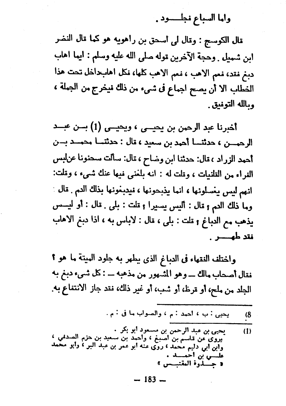 وَأَمَّا السِّبَاعُ فَجُلُودٌ قَالَ الْكَوْسَجُ وَقَالَ لِي إسحق بن راهوية هو كما قال النضر إبن شُمَيْلٍ وَحُجَّةُ الْآخَرِينَ قَوْلُهُ صَلَّى اللَّهُ عَلَيْهِ وَسَلَّمَ أَيُّمَا إِهَابٍ دُبِغَ فقد فعم الاهب فَعَمَّ الْأُهُبَ كُلَّهَا فَكُلُّ إِهَابٍ دَاخِلٌ تَحْتَ هَذَا الْخِطَابِ إِلَّا أَنْ يَصِحَّ إِجْمَاعٌ فِي شَيْءٍ مِنْ ذَلِكَ فَيَخْرُجُ مِنَ الْجُمْلَةِ وَبِاللَّهِ التَّوْفِيقُ أَخْبَرَنَا عَبْدُ الرَّحْمَنِ بْنُ يَحْيَى وَيَحْيَى بْنُ عَبْدِ الرَّحْمَنِ حَدَّثَنَا أَحْمَدُ بْنُ سَعِيدٍ قَالَ حَدَّثَنَا مُحَمَّدُ بْنُ أَحْمَدَ الزَّرَّادُ قَالَ حَدَّثَنَا ابْنُ وَضَّاحٍ قَالَ سَأَلْتُ سَحْنُونًا عَنْ لُبْسِ الْفِرَاءِ مِنَ الْقَلَنِيَّاتِ وَقُلْتُ لَهُ إِنَّهُ بَلَغَنِي فِيهَا عَنْكَ شَيْءٌ وَقَلْتُ إِنَّهُمْ لَيْسَ يَغْسِلُونَهَا إِنَّمَا يَذْبَحُونَهَا فَيَدْبُغُونَهَا بِذَلِكَ الدَّمِ قَالَ وَمَا ذَلِكَ الدَّمُ قَالَ أَلَيْسَ يَسِيرًا قُلْتُ بَلَى قَالَ أَوْ لَيْسَ يَذْهَبُ مَعَ الدِّبَاغِ قُلْتُ بَلَى قَالَ لَا بَأْسَ بِهِ إِذَا دُبِغَ الْإِهَابُ فَقَدْ طَهُرَ وَاخْتَلَفَ الْفُقَهَاءُ فِي الدِّبَاغِ الَّذِي يُطَهَّرُ بِهِ جُلُودُ الْمَيْتَةِ مَا هُوَ فَقَالَ أَصْحَابُ مَالِكٍ وَهُوَ الْمَشْهُورُ مِنْ مَذْهَبِهِ كُلُّ شَيْءٍ دُبِغَ بِهِ الْجِلْدُ مِنْ مِلْحٍ أَوْ قُرَظٍ أَوْ شَبٍّ أَوْ غَيْرِ ذَلِكَ فَقَدْ جَازَ الِانْتِفَاعُ بِهِ