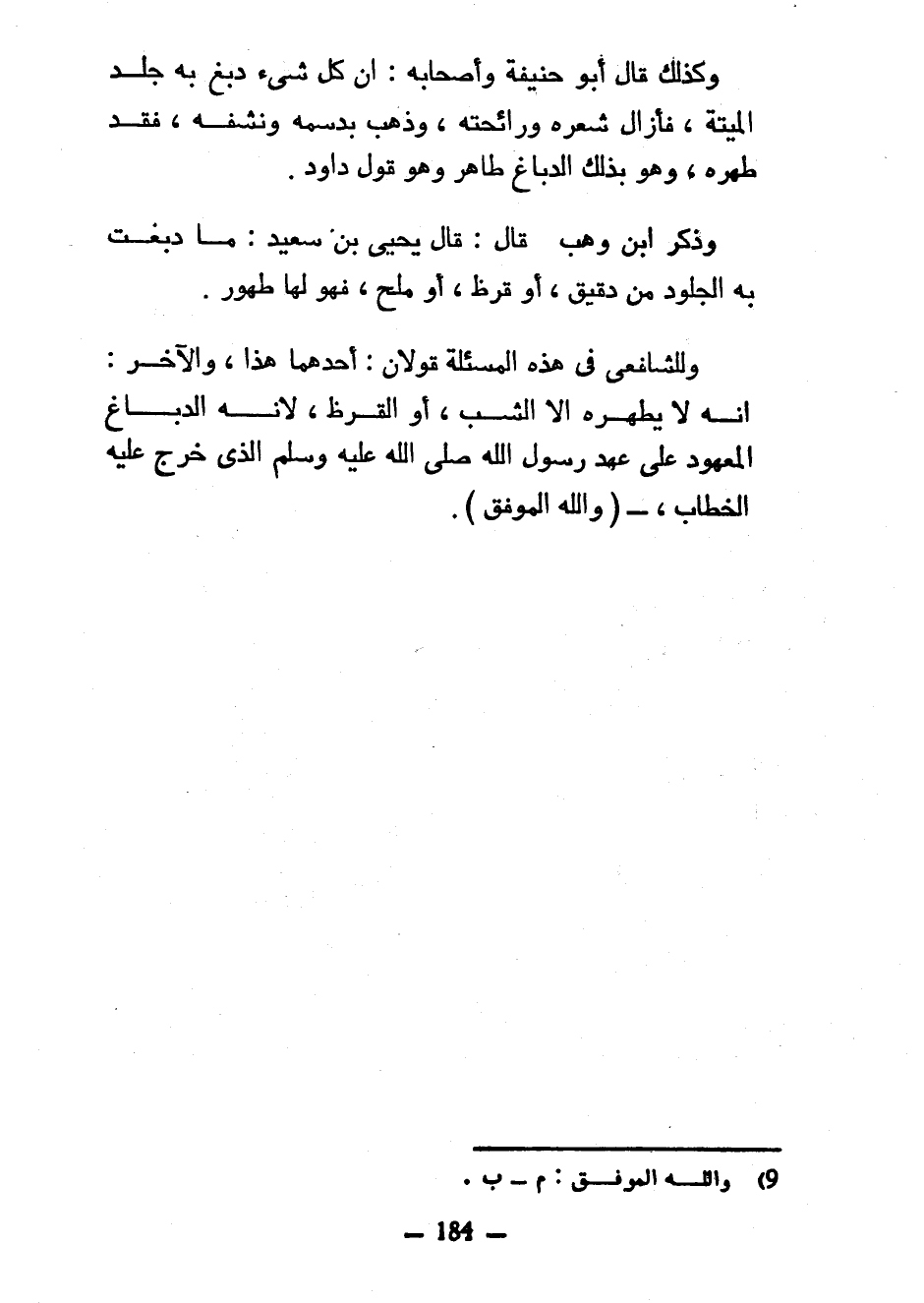 وَكَذَلِكَ قَالَ أَبُو حَنِيفَةَ وَأَصْحَابُهُ إِنَّ كُلَّ شَيْءٍ دُبِغَ بِهِ جِلْدُ الْمَيْتَةِ فَأَزَالَ شَعْرَهُ وَرَائِحَتَهُ وَذَهَبَ بِدَسَمِهِ وَنَشَّفَهُ فَقَدْ طَهَّرَهُ وَهُوَ بِذَلِكَ الدِّبَاغِ طَاهِرٌ وَهُوَ قَوْلُ دَاوُدَ وَذَكَرَ ابْنُ وَهْبٍ قَالَ قَالَ يَحْيَى بْنُ سَعِيدٍ مَا دُبِغَتْ بِهِ الْجُلُودُ مِنْ دَقِيقٍ أَوْ قُرَظٍ أَوْ مِلْحٍ فَهُوَ لَهَا طَهُورٌ وَلِلشَّافِعِيِّ في هذه المسئلة قَوْلَانِ أَحَدُهُمَا هَذَا وَالْآخَرُ إِنَّهُ لَا يُطَهِّرُهُ إِلَّا الشَّبُّ أَوِ الْقَرَظُ لِأَنَّهُ الدِّبَاغُ الْمَعْهُودُ عَلَى عَهْدِ رَسُولِ اللَّهِ صَلَّى اللَّهُ عَلَيْهِ وَسَلَّمَ الَّذِي خَرَجَ عَلَيْهِ الْخِطَابُ (وَاللَّهُ الْمُوَفِّقُ)
