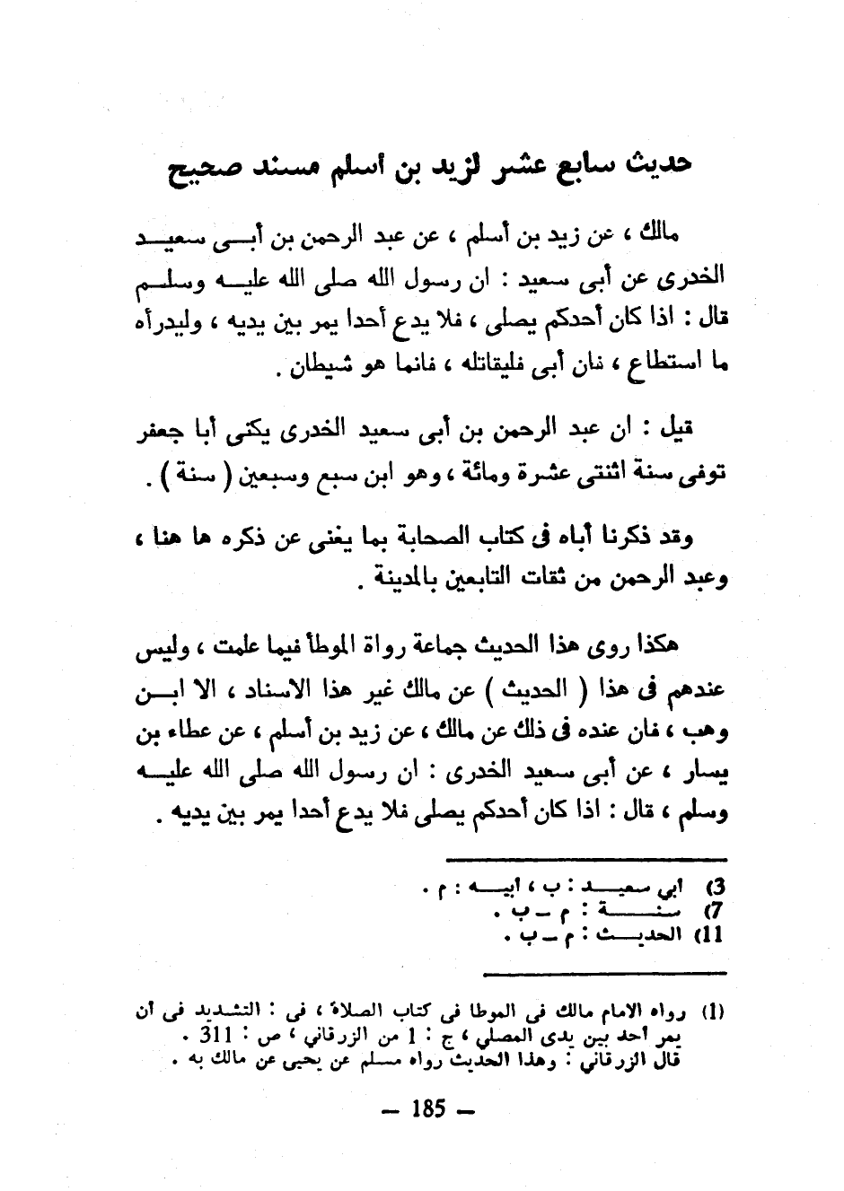 حَدِيثٌ سَابِعَ عَشَرَ لِزَيْدِ بْنِ أَسْلَمَ مُسْنَدٌ صَحِيحٌ مَالِكٌ عَنْ زيد ابن أَسْلَمَ عَنْ عَبْدِ الرَّحْمَنِ بْنِ أَبِي سَعِيدٍ الْخُدْرِيِّ عَنْ أَبِي سَعِيدٍ إِنَّ رَسُولَ اللَّهِ صَلَّى اللَّهُ عَلَيْهِ وَسَلَّمَ قَالَ إِذَا كَانَ أَحَدُكُمْ يُصَلِّي فَلَا يَدَعْ أَحَدًا يَمُرُّ بَيْنَ يَدَيْهِ وَلْيَدْرَأْهُ مَا اسْتَطَاعَ فَإِنْ أَبَى فَلْيُقَاتِلْهُ فَإِنَّمَا هُوَ شَيْطَانٌ قِيلَ إِنَّ عَبْدَ الرَّحْمَنِ بْنَ أَبِي سَعِيدٍ الْخُدْرِيِّ يُكْنَى أَبَا جَعْفَرٍ تُوُفِّيَ سَنَةَ اثْنَتَيْ عَشْرَةَ وَمِائَةٍ وَهُوَ ابْنُ سَبْعٍ وَسَبْعِينَ (سَنَةً) وَقَدْ ذَكَرْنَا أَبَاهُ فِي كِتَابِ الصَّحَابَةِ بِمَا يُغْنِي عَنْ ذِكْرِهِ ها هنا وَعَبْدُ الرَّحْمَنِ مِنْ ثِقَاتِ التَّابِعِينَ بِالْمَدِينَةِ هَكَذَا رَوَى هَذَا الْحَدِيثَ جَمَاعَةُ رُوَاةِ الْمُوَطَّأِ فِيمَا عَلِمْتُ وَلَيْسَ عِنْدَهُمْ فِي هَذَا (الْحَدِيثِ) عَنْ مَالِكٍ غَيْرُ هَذَا الْإِسْنَادِ إِلَّا ابْنَ وَهْبٍ فَإِنَّ عِنْدَهُ فِي ذَلِكَ عَنْ مَالِكٍ عَنْ زَيْدِ بْنِ أَسْلَمَ عَنْ عَطَاءِ بْنِ يَسَارٍ عَنْ أَبِي سَعِيدٍ الْخُدْرِيِّ أَنَّ رَسُولَ اللَّهِ صَلَّى اللَّهُ عَلَيْهِ وَسَلَّمَ قَالَ إِذَا كَانَ أَحَدُكُمْ يُصَلِّي فَلَا يَدَعْ أَحَدًا يَمُرُّ بَيْنَ يديه