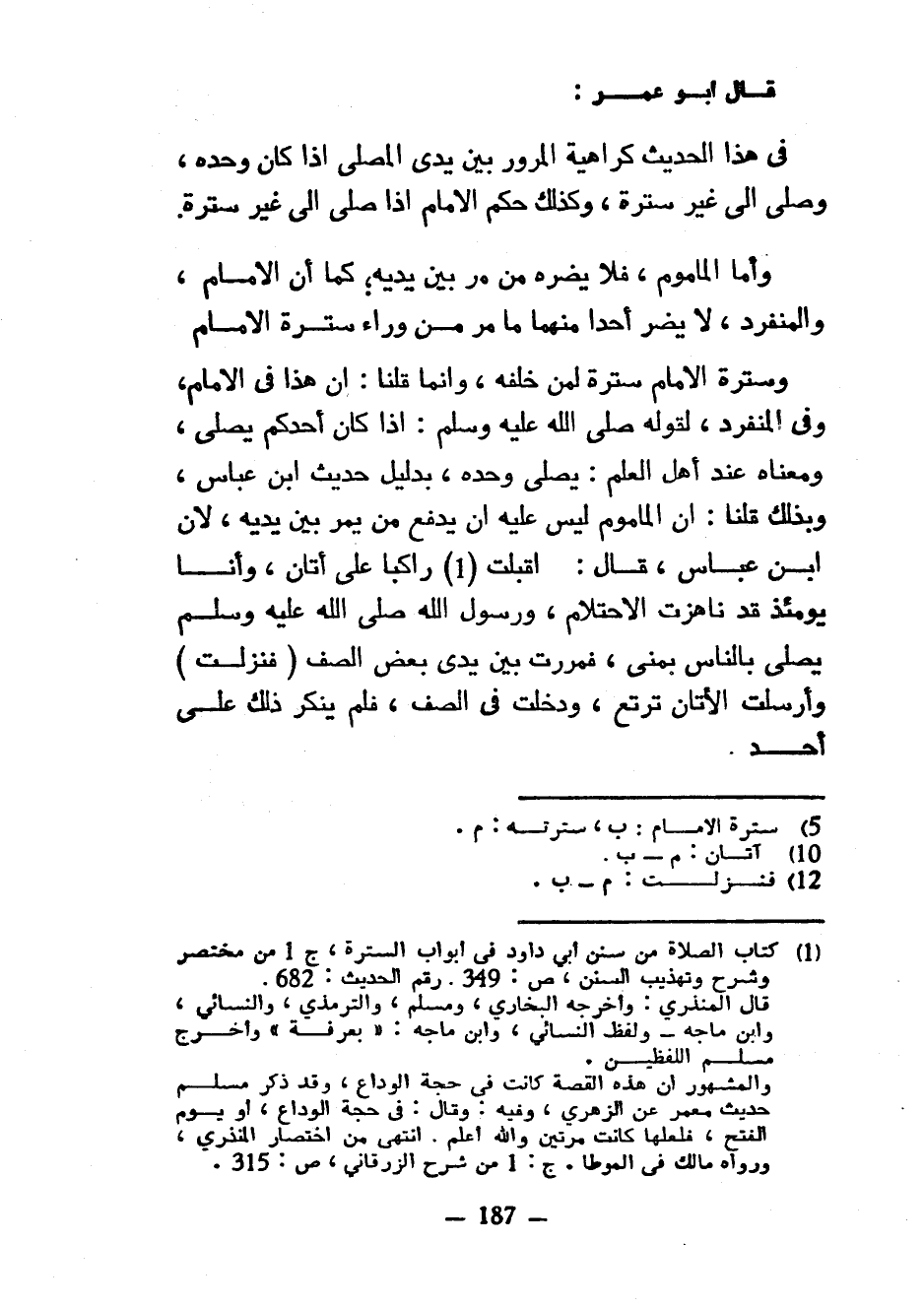 قَالَ أَبُو عُمَرَ فِي هَذَا الْحَدِيثِ كَرَاهِيَةُ الْمُرُورِ بَيْنَ يَدَيِ الْمُصَلِّي إِذَا كَانَ وَحْدَهُ وَصَلَّى إِلَى غَيْرِ سُتْرَةٍ وَكَذَلِكَ حُكْمُ الْإِمَامِ إِذَا صَلَّى إِلَى غَيْرِ سُتْرَةٍ وَأَمَّا الْمَأْمُومُ فَلَا يَضُرُّهُ مَنْ مَرَّ بَيْنَ يَدَيْهِ كَمَا أَنَّ الْإِمَامَ وَالْمُنْفَرِدَ لَا يَضُرُّ أَحَدًا مِنْهُمَا مَا مَرَّ مِنْ وَرَاءِ سُتْرَةِ الْإِمَامِ وَسُتْرَةُ الْإِمَامِ سُتْرَةٌ لِمَنْ خَلْفَهُ وَإِنَّمَا قُلْنَا إِنَّ هَذَا فِي الْإِمَامِ وَفِي الْمُنْفَرِدِ لِقَوْلِهِ صَلَّى اللَّهُ عَلَيْهِ وَسَلَّمَ إِذَا كَانَ أَحَدُكُمْ يُصَلِّي وَمَعْنَاهُ عِنْدَ أَهْلِ الْعِلْمِ يُصَلِّي وَحْدَهُ بِدَلِيلِ حَدِيثِ ابْنِ عَبَّاسٍ وَبِذَلِكَ قُلْنَا إِنَّ الْمَأْمُومَ لَيْسَ عَلَيْهِ أَنْ يَدْفَعَ مَنْ يَمُرُّ بَيْنَ يَدَيْهِ لِأَنَّ ابْنَ عَبَّاسٍ قَالَ أَقْبَلْتُ رَاكِبًا عَلَى أَتَانٍ وَأَنَا يَوْمَئِذٍ قَدْ نَاهَزْتُ الِاحْتِلَامَ وَرَسُولُ اللَّهِ صَلَّى اللَّهُ عَلَيْهِ وَسَلَّمَ يُصَلِّي بِالنَّاسِ بِمِنًى فَمَرَرْتُ بَيْنَ يَدَيْ بَعْضِ الصَّفِّ (فَنَزَلْتُ) وَأَرْسَلْتُ الْأَتَانَ تَرْتَعُ وَدَخَلْتُ فِي الصَّفِّ فَلَمْ يُنْكِرْ ذَلِكَ عَلَيَّ أَحَدٌ