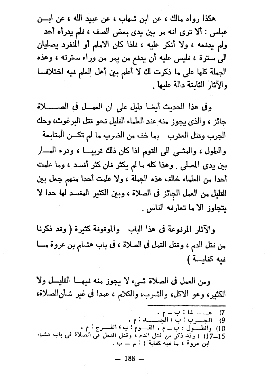 هَكَذَا رَوَاهُ مَالِكٌ عَنِ ابْنِ شِهَابٍ عَنْ عُبَيْدِ اللَّهِ عَنِ ابْنِ عَبَّاسٍ أَلَا تَرَى أَنَّهُ مَرَّ بَيْنَ يَدَيْ بَعْضِ الصَّفِّ فَلَمْ يَدْرَأْهُ أَحَدٌ وَلَمْ يَدْفَعْهُ وَلَا أَنْكَرَ عَلَيْهِ فَإِذَا كَانَ الْإِمَامُ أَوِ الْمُنْفَرِدُ يُصَلِّيَانِ إِلَى سُتْرَةٍ فَلَيْسَ عَلَيْهِ أَنْ يَدْفَعَ مَنْ يَمُرُّ مِنْ وَرَاءِ سُتْرَتِهِ وَهَذِهِ الْجُمْلَةُ كُلُّهَا عَلَى مَا ذَكَرْتُ لَكَ لَا أَعْلَمُ بَيْنَ أَهْلِ الْعِلْمِ فِيهِ اخْتِلَافًا وَالْآثَارُ الثَّابِتَةُ دَالَّةٌ عَلَيْهَا وَفِي هَذَا الْحَدِيثِ أَيْضًا دَلِيلٌ عَلَى أَنَّ الْعَمَلَ فِي الصَّلَاةِ جَائِزٌ وَالَّذِي يَجُوزُ مِنْهُ عِنْدَ الْعُلَمَاءِ الْقَلِيلُ نَحْوَ قَتْلِ الْبُرْغُوثِ وَحَكِّ الْجَرَبِ وَقَتْلِ الْعَقْرَبِ بِمَا خَفَّ مِنَ الضَّرْبِ مال لَمْ تَكُنِ الْمُتَابَعَةُ وَالطُّولُ وَالْمَشْيِ إِلَى الْقَوْمِ إِذَا كَانَ ذَلِكَ قَرِيبًا وَدَرْءِ الْمَارِّ بَيْنَ يَدَيِ الْمُصَلِّي وَهَذَا كُلُّهُ مَا لَمْ يَكْثُرْ فَإِنَّ كَثُرَ أَفْسَدَ وَمَا عَلِمْتُ أَحَدًا مِنَ الْعُلَمَاءِ خَالَفَ هَذِهِ الْجُمْلَةَ وَلَا عَلِمْتُ أَحَدًا مِنْهُمْ جَعَلَ بَيْنَ الْقَلِيلِ مِنَ الْعَمَلِ الْجَائِزِ فِي الصَّلَاةِ وَبَيْنَ الْكَثِيرِ الْمُفْسِدِ لَهَا حَدًّا لَا يَتَجَاوَزُ إِلَّا مَا تَعَارَفَهُ النَّاسُ وَالْآثَارُ الْمَرْفُوعَةُ فِي هَذَا الْبَابِ وَالْمَوْقُوفَةُ كَثِيرَةٌ (وَقَدْ ذَكَرْنَا مِنْ فَتْلِ الدَّمِ وَقَتْلِ الْقَمْلِ فِي الصَّلَاةِ فِي بَابِ هِشَامِ بْنِ عُرْوَةَ مَا فِيهِ كِفَايَةٌ) وَمِنَ الْعَمَلِ فِي الصَّلَاةِ شَيْءٌ لَا يَجُوزُ مِنْهُ فِيهَا الْقَلِيلُ وَلَا الْكَثِيرُ وَهُوَ الْأَكْلُ وَالشُّرْبُ وَالْكَلَامُ عَمْدًا فِي غَيْرِ شأن الصلاة