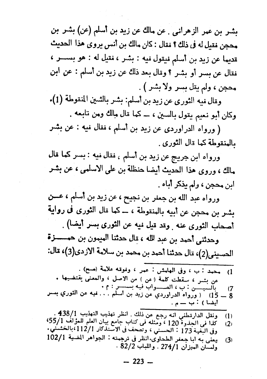 بِشْرُ بْنُ عُمَرَ الزَّهْرَانِيُّ عَنْ مَالِكٍ عَنْ زَيْدِ بْنِ أَسْلَمَ (عَنْ) بِشْرِ بْنِ مِحْجَنٍ فَقِيلَ لَهُ فِي ذَلِكَ فَقَالَ كَانَ مَالِكُ بْنُ أَنَسٍ يَرْوِي هَذَا الْحَدِيثَ قَدِيمًا عَنْ زيد ابن أَسْلَمَ فَيَقُولُ فِيهِ بِشْرٌ فَقِيلَ لَهُ هُوَ بُسْرٌ فَقَالَ عَنْ بُسْرٍ أَوْ بِشْرٍ وَقَالَ بَعْدَ ذَلِكَ عَنْ زَيْدِ بْنِ أَسْلَمَ عَنِ ابْنِ مِحْجَنٍ وَلَمْ يَقُلْ بُسْرٌ وَلَا بِشْرٌ) وَقَالَ فِيهِ الثَّوْرِيُّ عَنْ زَيْدِ بْنِ أَسْلَمَ بِشْرٌ بِالشِّينِ الْمَنْقُوطَةِ وَكَانَ أَبُو نُعَيْمٍ يَقُولُ بِالسِّينِ كَمَا قَالَ مَالِكٌ وَمَنْ تَابَعَهُ (وَرَوَاهُ الدراوردي عن زيد ابن أَسْلَمَ فَقَالَ فِيهِ عَنْ بِشْرٍ بِالْمَنْقُوطَةِ كَمَا قَالَ الثَّوْرِيُّ وَرَوَاهُ ابْنُ جُرَيْجٍ عَنْ زَيْدِ ابن أَسْلَمَ فَقَالَ فِيهِ بُسْرٌ كَمَا قَالَ مَالِكٌ وَرَوَى هَذَا الْحَدِيثَ أَيْضًا حَنْظَلَةُ بْنُ عَلِيٍّ الأسلمي عن بشر إبن مِحْجَنٍ وَلَمْ يَذْكُرْ أَبَاهُ وَرَوَاهُ عَبْدُ اللَّهِ بْنَ جَعْفَرِ بْنِ نَجِيحٍ عَنْ زيد ابن أَسْلَمَ عَنْ بِشْرِ بْنِ مِحْجَنٍ عَنْ أَبِيهِ بِالْمَنْقُوطَةِ كَمَا قَالَ الثَّوْرِيُّ فِي رِوَايَةِ أَصْحَابِ الثَّوْرِيِّ عَنْهُ وَقَدْ قِيلَ فِيهِ عَنِ الثَّوْرِيِّ بُسْرٌ أَيْضًا) وَحَدَّثَنِي أَحْمَدُ بْنُ عَبْدِ اللَّهِ قَالَ حَدَّثَنَا الْمَيْمُونُ بْنُ حَمْزَةَ الْحُسَيْنِيُّ قَالَ حَدَّثَنَا أَحْمَدُ بْنُ مُحَمَّدُ بْنِ سَلَامَةَ الْأَزْدِيُّ قال