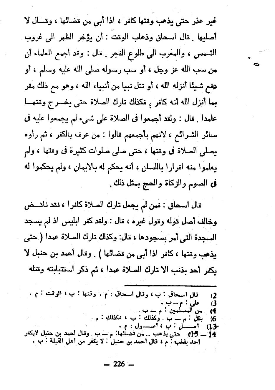 غَيْرِ عُذْرٍ حَتَّى يَذْهَبَ وَقْتُهَا كَافِرٌ إِذَا أَبَى مِنْ قَضَائِهَا وَقَالَ لَا أُصَلِّيهَا قَالَ إِسْحَاقُ وَذَهَابُ الْوَقْتِ أَنْ يُؤَخَّرَ الظُّهْرُ إِلَى غُرُوبِ الشَّمْسِ وَالْمَغْرِبَ إِلَى طُلُوعِ الْفَجْرِ قَالَ وَقَدْ أَجْمَعَ الْعُلَمَاءُ أَنَّ مَنْ سَبَّ اللَّهَ عَزَّ وَجَلَّ أَوْ سَبَّ رَسُولَ اللَّهِ صَلَّى اللَّهُ عَلَيْهِ وَسَلَّمَ أَوْ دَفَعَ شَيْئًا أَنْزَلَهُ اللَّهُ أَوْ قَتَلَ نَبِيًّا مِنْ أَنْبِيَاءِ اللَّهِ وَهُوَ مَعَ ذَلِكَ مُقِرٌّ بِمَا أَنْزَلَ اللَّهُ أَنَّهُ كَافِرٌ فَكَذَلِكَ تَارِكُ الصَّلَاةِ حَتَّى يَخْرُجَ وَقْتُهَا عَامِدًا قَالَ وَلَقَدْ أَجْمَعُوا فِي الصَّلَاةِ عَلَى شَيْءٍ لَمْ يُجْمِعُوا عَلَيْهِ فِي سَائِرِ الشَّرَائِعِ لِأَنَّهُمْ بِأَجْمَعِهِمْ قَالُوا مَنْ عُرِفَ بِالْكُفْرِ ثُمَّ رَأَوْهُ يُصَلِّي الصَّلَاةَ فِي وَقْتِهَا حَتَّى صلى صلوات كَثِيرَةً فِي وَقْتِهَا وَلَمْ يَعْلَمُوا مِنْهُ إِقْرَارًا بِاللِّسَانِ أَنَّهُ يُحْكَمُ لَهُ بِالْإِيمَانِ وَلَمْ يَحْكُمُوا لَهُ فِي الصَّوْمِ وَالزَّكَاةِ وَالْحَجِّ بِمِثْلِ ذَلِكَ قَالَ إِسْحَاقُ فَمَنْ لَمْ يَجْعَلْ تَارِكَ الصَّلَاةِ كَافِرًا فَقَدْ نَاقَضَ وَخَالَفَ أَصْلَ قَوْلِهِ وَقَوْلِ غَيْرِهِ قَالَ وَلَقَدْ كَفَرَ إِبْلِيسُ إِذْ لَمْ يَسْجُدِ السَّجْدَةَ الَّتِي أُمِرَ بِسُجُودِهَا قَالَ وَكَذَلِكَ تَارِكُ الصَّلَاةِ عَمْدًا (حَتَّى يَذْهَبَ وَقْتُهَا كَافِرٌ إِذَا أَبَى مِنْ قَضَائِهَا) وَقَالَ أَحْمَدُ بْنُ حَنْبَلٍ لَا يُكَفَّرُ أَحَدٌ بِذَنْبٍ إِلَّا تَارِكُ الصَّلَاةِ عَمْدًا ثُمَّ ذَكَرَ اسْتِتَابَتَهُ وَقَتْلَهُ