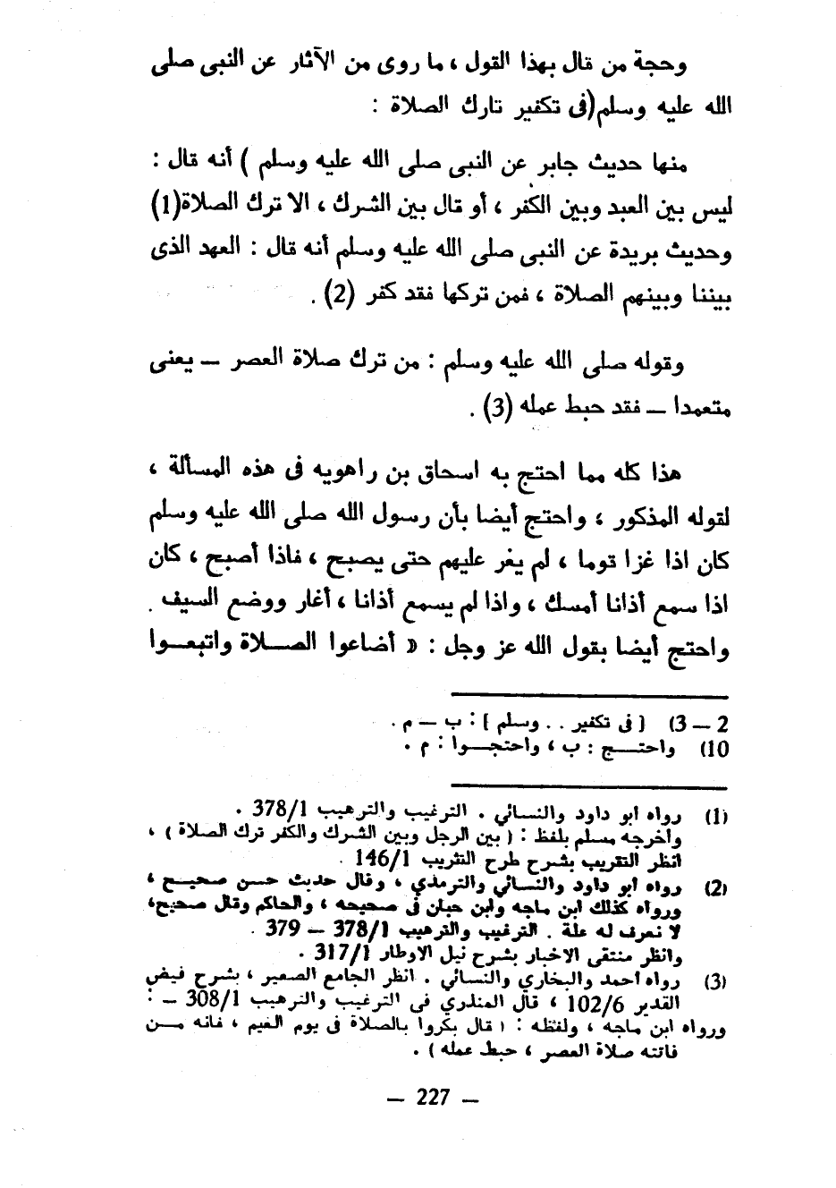 وَحُجَّةُ مَنْ قَالَ بِهَذَا الْقَوْلِ مَا رُوِيَ مِنَ الْآثَارِ عَنِ النَّبِيِّ صَلَّى اللَّهُ عَلَيْهِ وَسَلَّمَ (فِي تَكْفِيرِ تَارِكِ الصَّلَاةِ مِنْهَا حَدِيثُ جَابِرٍ عَنِ النَّبِيِّ صَلَّى اللَّهُ عَلَيْهِ وَسَلَّمَ) أَنَّهُ قَالَ لَيْسَ بَيْنَ الْعَبْدِ وَبَيْنَ الْكُفْرِ أَوْ قَالَ بَيْنَ الشِّرْكِ إِلَّا تَرْكُ الصَّلَاةِ وَحَدِيثُ بُرَيْدَةَ عَنِ النَّبِيِّ صَلَّى اللَّهُ عَلَيْهِ وَسَلَّمَ أَنَّهُ قَالَ الْعَهْدُ الَّذِي بَيْنَنَا وَبَيْنَهُمُ الصَّلَاةُ فَمَنْ تَرَكَهَا فَقَدْ كَفَرَ وَقَوْلُهُ صَلَّى اللَّهُ عَلَيْهِ وَسَلَّمَ مَنْ تَرَكَ صَلَاةَ الْعَصْرِ يَعْنِي مُتَعَمِّدًا فَقَدْ حَبِطَ عَمَلُهُ هَذَا كُلُّهُ مِمَّا احْتَجَّ بِهِ إِسْحَاقُ بْنُ رَاهَوَيْهِ فِي هَذِهِ الْمَسْأَلَةِ لِقَوْلِهِ الْمَذْكُورِ وَاحْتَجَّ أَيْضًا بِأَنَّ رَسُولَ اللَّهِ صَلَّى اللَّهُ عَلَيْهِ وَسَلَّمَ كان إِذَا غَزَا قَوْمًا لَمْ يُغِرْ عَلَيْهِمْ حَتَّى يُصْبِحَ فَإِذَا أَصْبَحَ كَانَ إِذَا سَمِعَ أَذَانًا أَمْسَكَ وَإِذَا لَمْ يَسْمَعْ أَذَانًا أَغَارَ وَوَضَعَ السَّيْفَ وَاحْتَجَّ أَيْضًا بِقَوْلِ اللَّهِ عَزَّ وَجَلَّ أَضَاعُوا الصَّلَاةَ وَاتَّبَعُوا