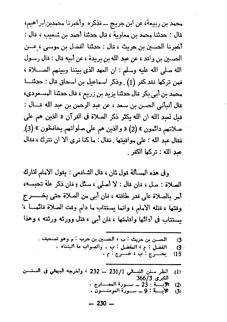 مُحَمَّدُ بْنُ رَبِيعَةَ عَنِ ابْنِ جُرَيْجٍ فَذَكَرَهُ وَأَخْبَرَنَا مُحَمَّدُ بْنُ إِبْرَاهِيمَ قَالَ حَدَّثَنَا مُحَمَّدُ بْنُ مُعَاوِيَةَ قَالَ حَدَّثَنَا أَحْمَدُ بْنُ شُعَيْبٍ قَالَ أَخْبَرَنَا الْحُسَيْنُ بْنُ حُرَيْثٍ قَالَ حَدَّثَنَا الْفَضْلُ بْنُ مُوسَى عَنِ الْحُسَيْنِ بْنِ وَاقِدٍ عَنْ عَبْدِ اللَّهِ بْنِ بُرَيْدَةَ عَنْ أَبِيهِ قَالَ قَالَ صَلَّى اللَّهُ عَلَيْهِ وَسَلَّمَ إِنَّ العهد الذي بيننا وبينهم الصلاة فمن تركها فَقَدْ كَفَرَ وَذَكَرَ إِسْمَاعِيلُ بْنُ إِسْحَاقَ قَالَ حَدَّثَنَا مُحَمَّدُ بْنُ أَبِي بَكْرٍ قَالَ حَدَّثَنَا يَزِيدُ بْنُ زُرَيْعٍ قَالَ حَدَّثَنَا الْمَسْعُودِيُّ قَالَ أَنْبَأَنِي الْحَسَنُ بْنُ سَعْدٍ عَنْ عَبْدِ الرَّحْمَنِ بْنِ عَبْدِ اللَّهِ قَالَ قِيلَ لِعَبْدِ اللَّهِ إِنَّ اللَّهَ يُكْثِرُ ذِكْرَ الصَّلَاةِ فِي الْقُرْآنِ الَّذِينَ هُمْ عَلَى صَلَاتِهِمْ دَائِمُونَ وَالَّذِينَ هُمْ عَلَى صَلَوَاتِهِمْ يُحَافِظُونَ فَقَالَ عَبْدُ اللَّهِ عَلَى مَوَاقِيتِهَا فَقَالَ مَا كُنَّا نَرَى إِلَّا أَنْ تُتْرَكَ فَقَالَ عَبْدُ اللَّهِ تَرْكُهَا الْكُفْرُ وَفِي هَذِهِ الْمَسْأَلَةِ قَوْلٌ ثَانٍ قَالَ الشَّافِعِيُّ يَقُولُ الْإِمَامُ لِتَارِكِ الصَّلَاةِ صَلِّ فَإِنْ قَالَ لَا أُصَلِّي سُئِلَ فَإِنْ ذَكَرَ عِلَّةً تَحْبِسُهُ أُمِرَ بِالصَّلَاةِ عَلَى قَدْرِ طَاقَتِهِ فَإِنْ أَبَى مِنَ الصَّلَاةِ حَتَّى يَخْرُجَ وَقْتُهَا قَتَلَهُ الْإِمَامُ وَإِنَّمَا يُسْتَتَابُ مَا دَامَ وَقْتُ الصَّلَاةِ قَائِمًا يُسْتَتَابُ فِي أَدَائِهَا وَإِقَامَتِهَا فَإِنْ أَبَى قُتِلَ وَوَرِثَهُ ورثته وهذا