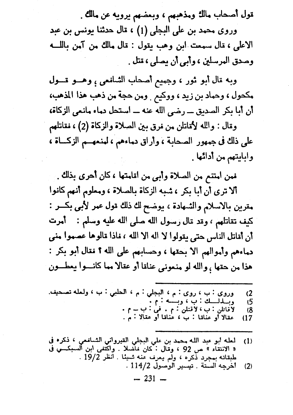 قَوْلُ أَصْحَابِ مَالِكٍ وَمَذْهَبُهُمْ وَبَعْضُهُمْ يَرْوِيهِ عَنْ مَالِكٍ وَرَوَى مُحَمَّدُ بْنُ عَلِيٍّ الْبَجَلِيُّ قَالَ حَدَّثَنَا يُونُسُ بْنُ عَبْدِ الْأَعْلَى قَالَ سَمِعْتُ ابْنَ وَهْبٍ يَقُولُ قَالَ مَالِكٌ مَنْ آمَنَ بِاللَّهِ وَصَدَّقَ الْمُرْسَلِينَ وَأَبَى أَنْ يُصَلِّيَ قُتِلَ وَبِهِ قَالَ أَبُو ثَوْرٍ وَجَمِيعُ أَصْحَابِ الشَّافِعِيِّ وَهُوَ قَوْلُ مَكْحُولٍ وَحَمَّادِ بْنِ زَيْدٍ وَوَكِيعٍ وَمِنْ حُجَّةِ مَنْ ذَهَبَ هَذَا الْمَذْهَبَ أَنَّ أَبَا بَكْرٍ الصِّدِّيقَ رَضِيَ اللَّهُ عَنْهُ اسْتَحَلَّ دِمَاءَ مَانِعِي الزَّكَاةِ وَقَالَ وَاللَّهِ لَأُقَاتِلَنَّ مَنْ فَرَّقَ بَيْنَ الصَّلَاةِ وَالزَّكَاةِ فَقَاتَلَهُمْ عَلَى ذَلِكَ فِي جُمْهُورِ الصَّحَابَةِ وَأَرَاقَ دِمَاءَهُمْ لِمَنْعِهِمُ الزَّكَاةَ وَإِبَايِتِهِمْ مِنْ أَدَائِهَا فَمَنِ امْتَنَعَ مِنَ الصَّلَاةِ وَأَبَى مِنْ إِقَامَتِهَا كَانَ أَحْرَى بِذَلِكَ أَلَا تَرَى أَنَّ أَبَا بَكْرٍ شَبَّهَ الزَّكَاةَ بِالصَّلَاةِ وَمَعْلُومٌ أَنَّهُمْ كَانُوا مُقِرِّينَ بِالْإِسْلَامِ وَالشَّهَادَةِ يُوَضِّحُ لَكَ ذَلِكَ قَوْلُ عُمَرَ لِأَبِي بَكْرٍ كَيْفَ تُقَاتِلُهُمْ وَقَدْ قَالَ رَسُولُ اللَّهِ صَلَّى اللَّهُ عَلَيْهِ وَسَلَّمَ أُمِرْتُ أَنْ أُقَاتِلَ النَّاسَ حَتَّى يَقُولُوا لَا إِلَهَ إِلَّا اللَّهُ فَإِذَا قَالُوهَا عَصَمُوا مني دماءهم وأمولاهم إِلَّا بِحَقِّهَا وَحِسَابُهُمْ عَلَى اللَّهِ فَقَالَ أَبُو بَكْرٍ هَذَا مِنْ حَقِّهَا وَاللَّهِ لَوْ مَنَعُونِي عَنَاقًا أَوْ عِقَالًا مِمَّا كَانُوا يُعْطُونَ